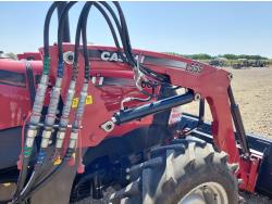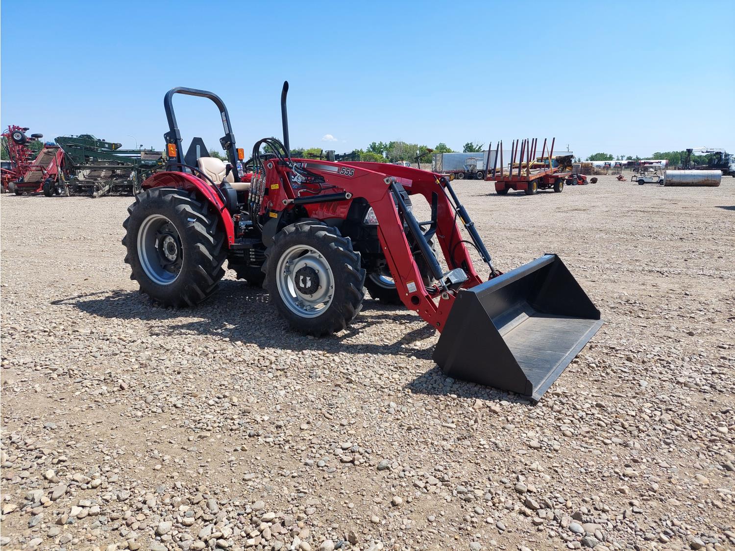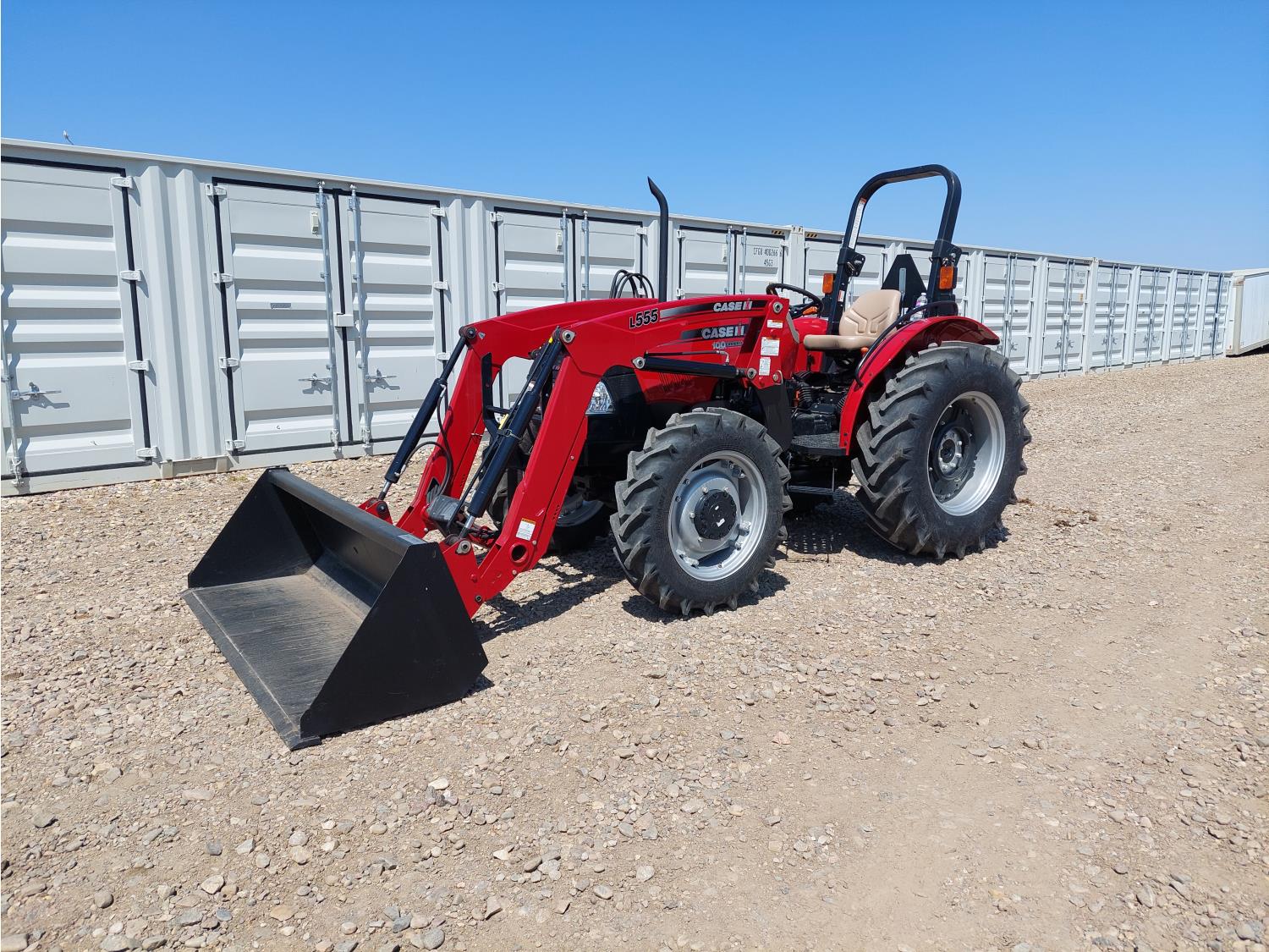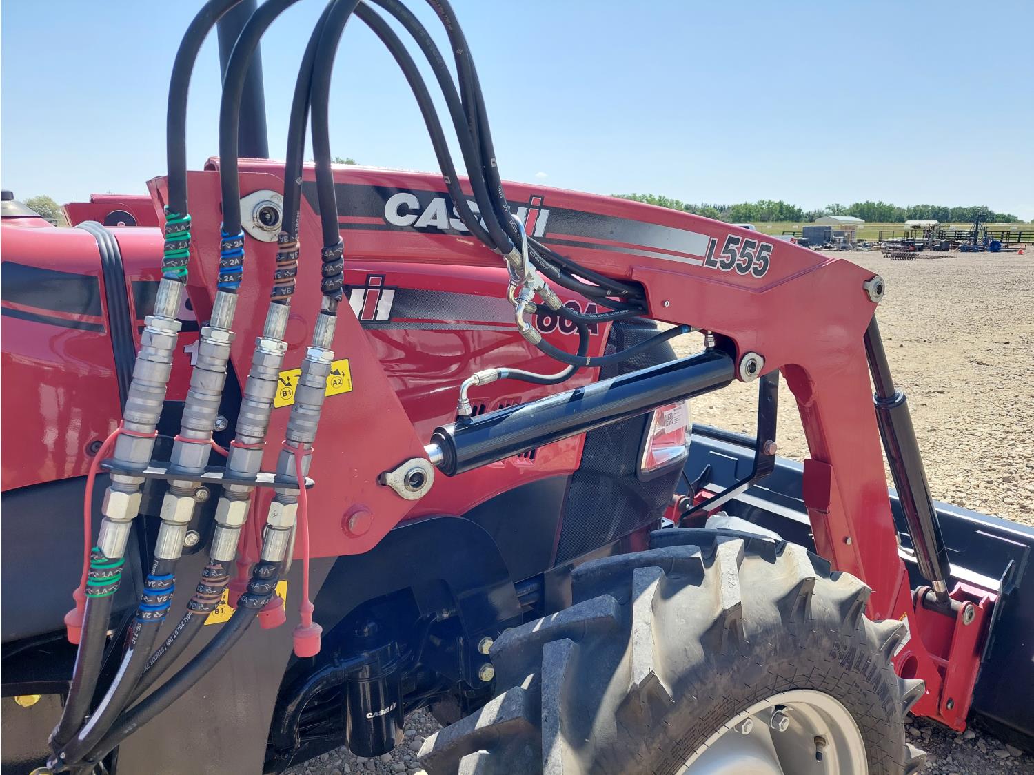 Case L555 loader, 82 inch bucket, FPT 50D/9 2.2 L 3 cylinder 60 HP, engine, 51 PTO HP, 8 speed mechanical shuttle shift, open station platform, joystick, 540 PTO, 3 point hitch, 1 rear hydraulic outlets, rear wheel weights, 9.5-24 front tires, 14.9-28 rear tires, 8 speed mechanical shuttle shift