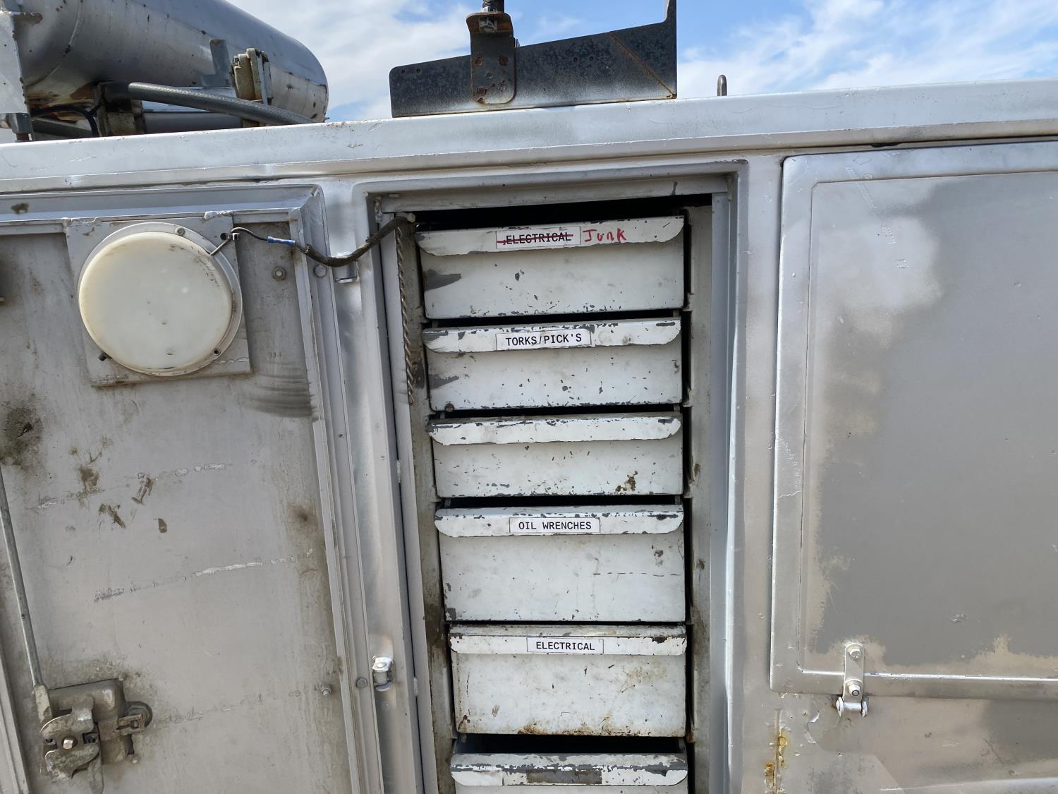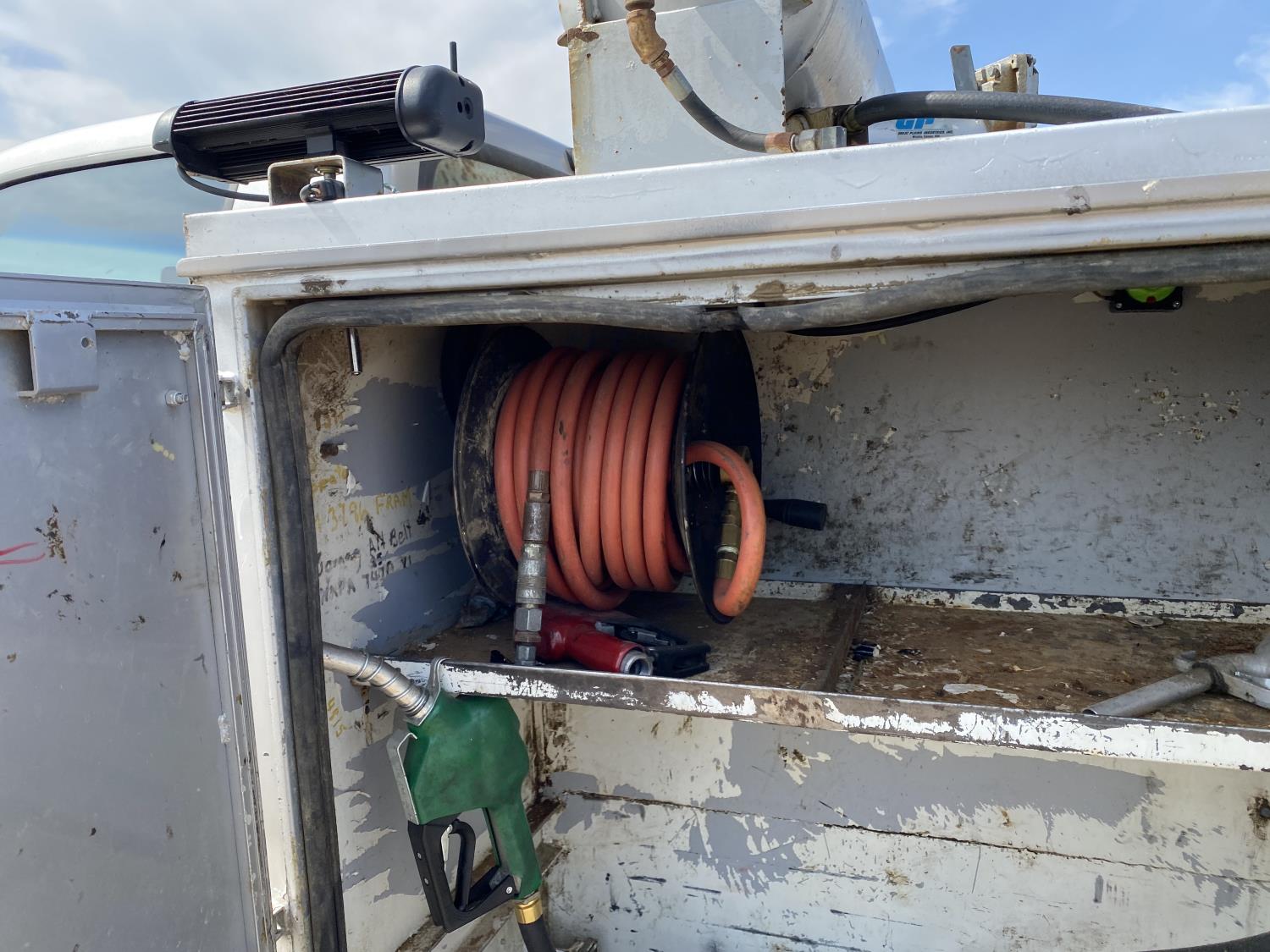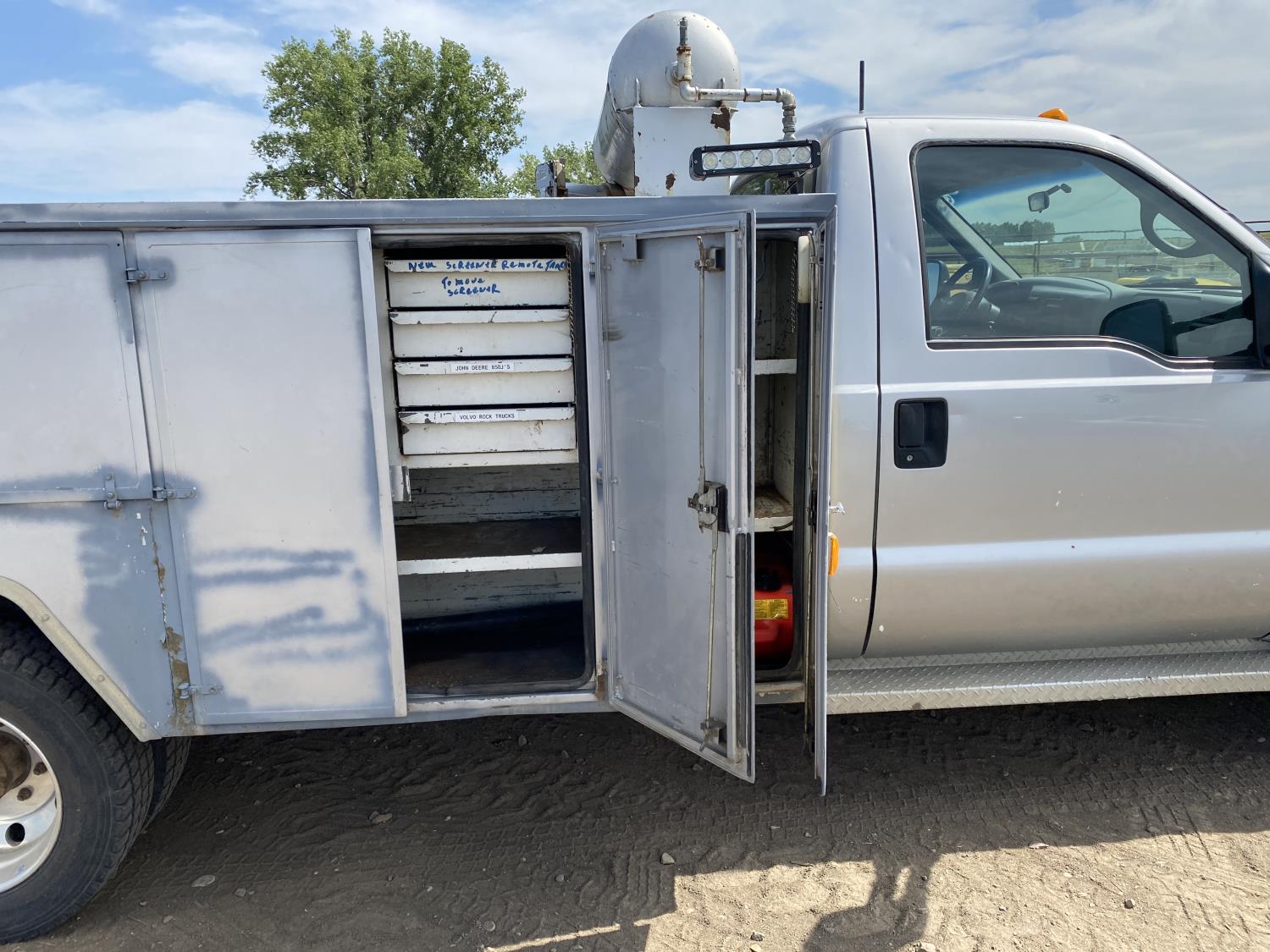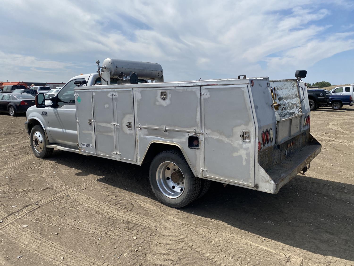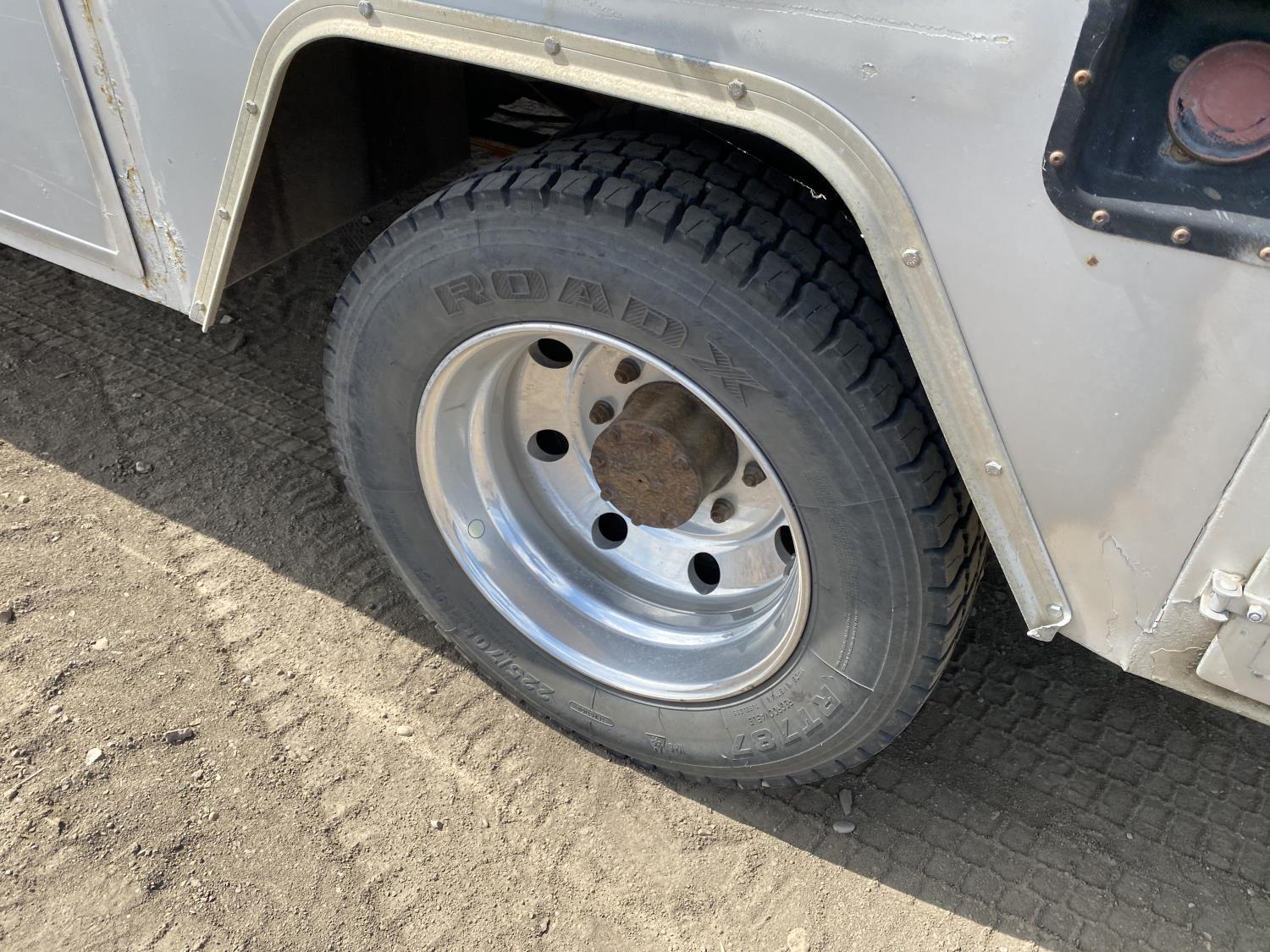 7.3 L 6 cylinder diesel engine, Webasto diesel engine heater, automatic transmission, A/C, P/W, P/L, cruise control, running boards, steel tool boxes, 4 ft 1 inch x 12 ft deck, 2014 Tidy Tank 450 liter tank, Vmac compressor, 225/70R19.5 tires