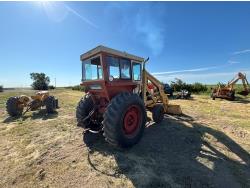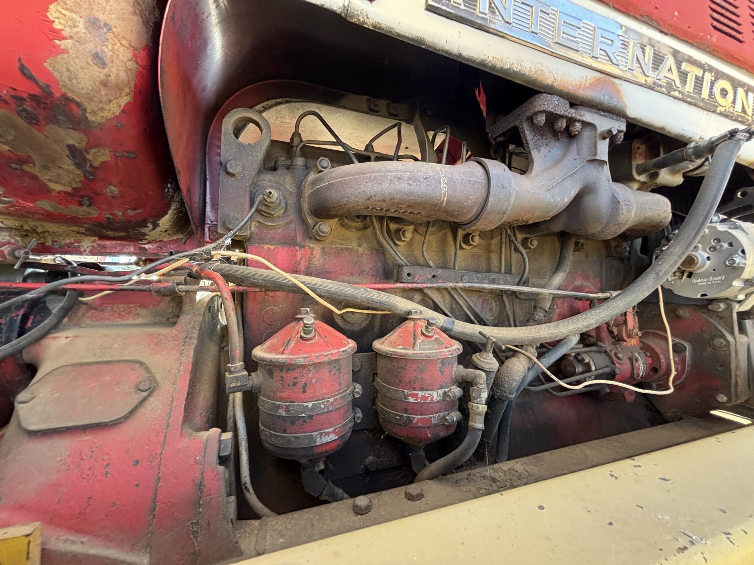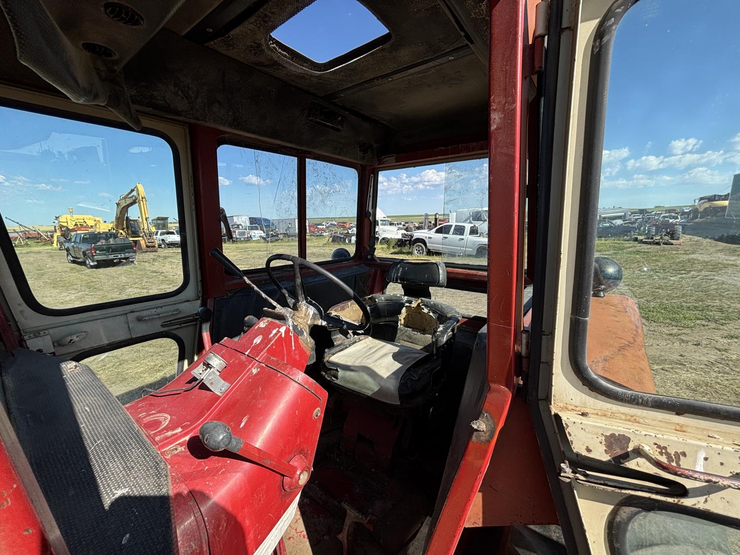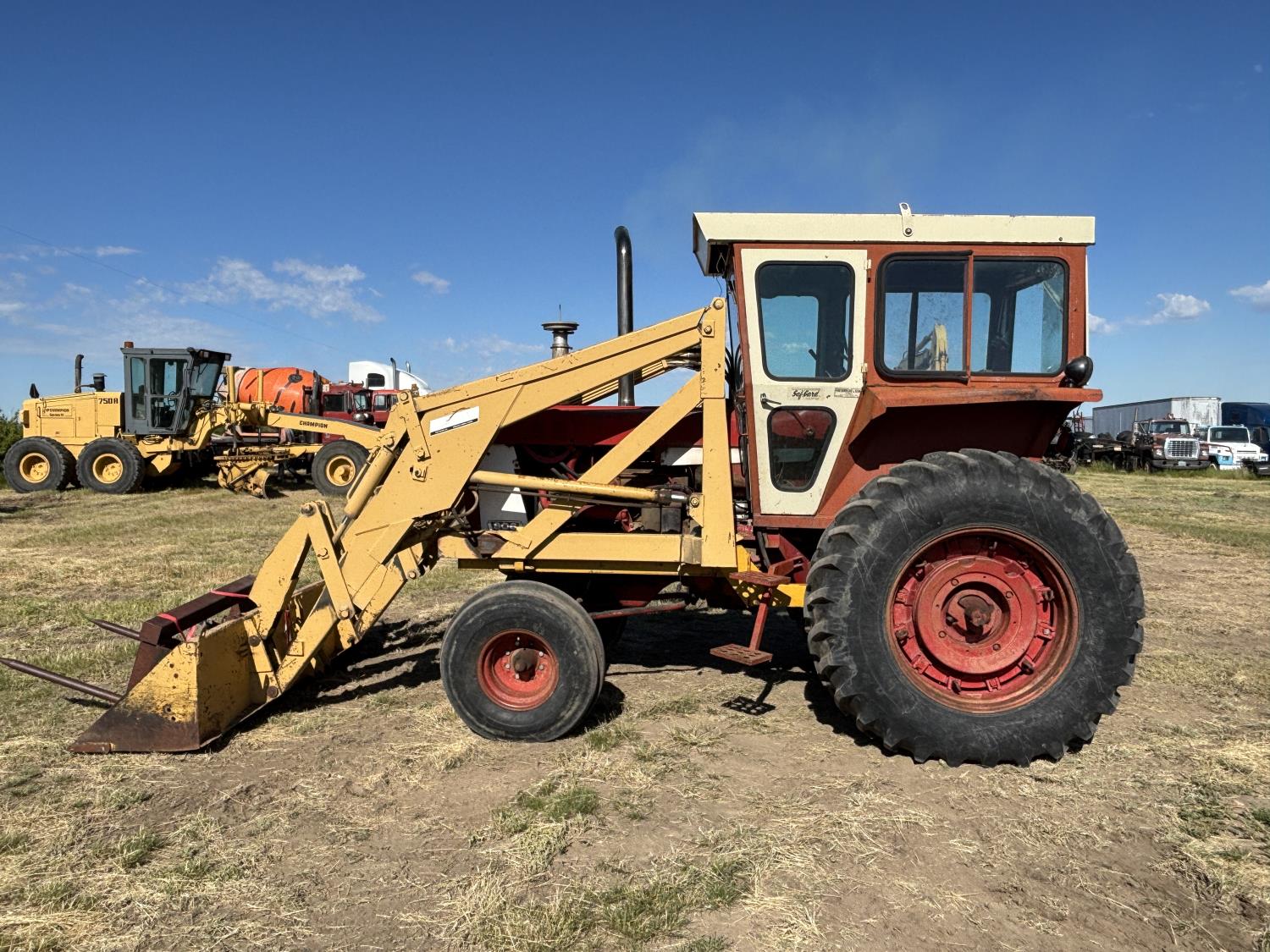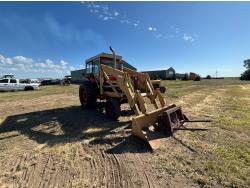 Ezee-On loader, 96 inch bucket, 34 inch bale forks,International 5.9 L 6 cylinder 105 HP, diesel engine, 94 PTO HP, 8 speed manual transmission, cab, 540/1000 PTO, 2 rear hydraulic outlets, rear wheel weights, 10.00-16 front tires, 18.4-34 rear tires