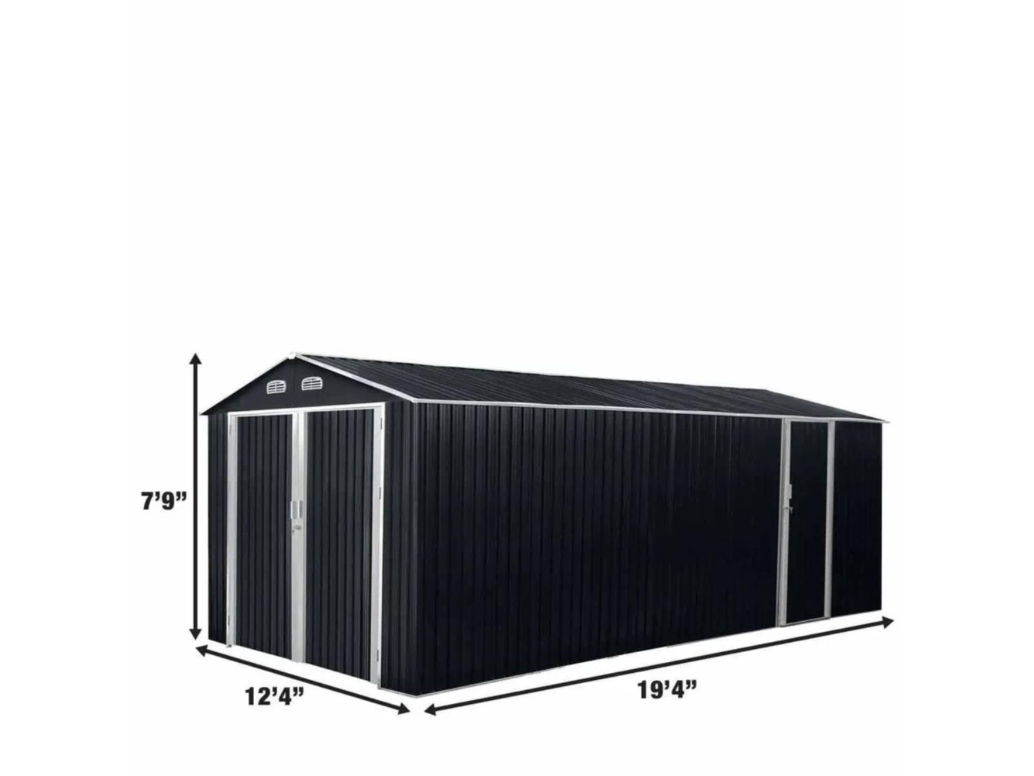 7 ft 9 inch peak height, double front & side doors, 240 Sq-Ft floor space