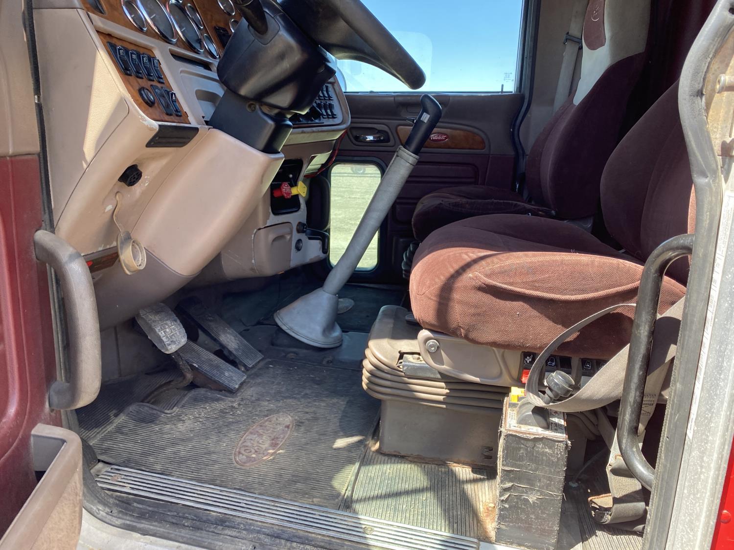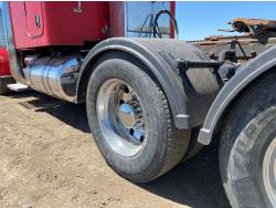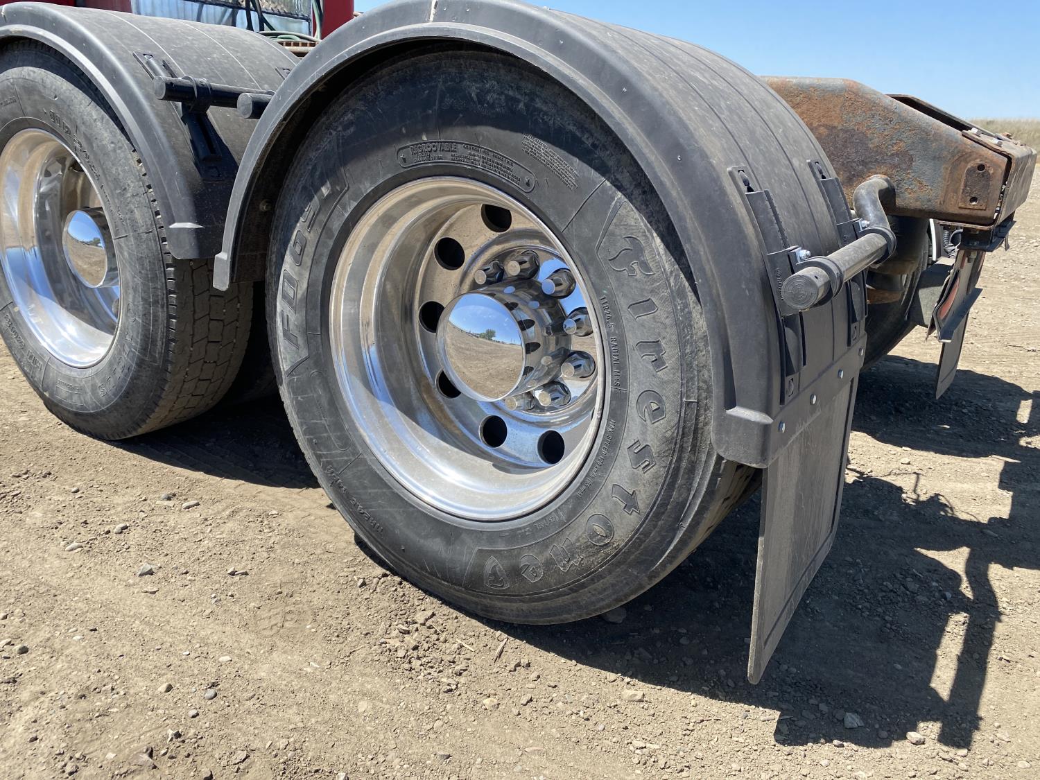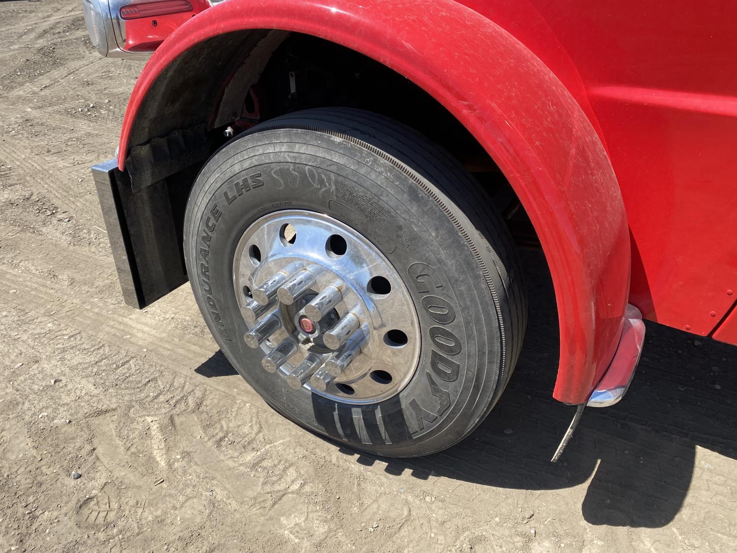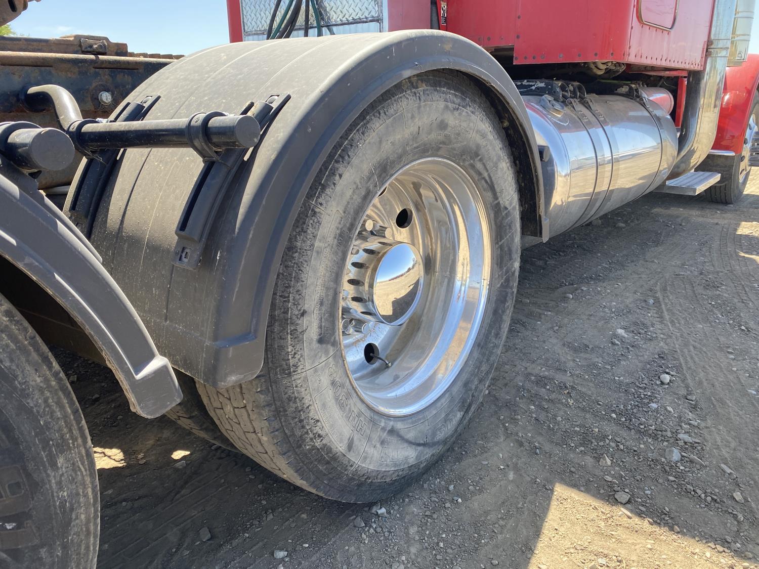 Caterpillar C15 6 cylinder engine, engine block heater, Eaton Fuller 18 speed manual transmission, flat top 60 inch sleeper, A/C, cruise control, air ride seats, hydraulic wet kit, air ride cab, PTO pump, Peterbilt air ride suspension, 14,320 lb front axle, 46,000 lb rear axles, full lockers, 242 inch WB, all aluminum wheels, 11R24.5 tires