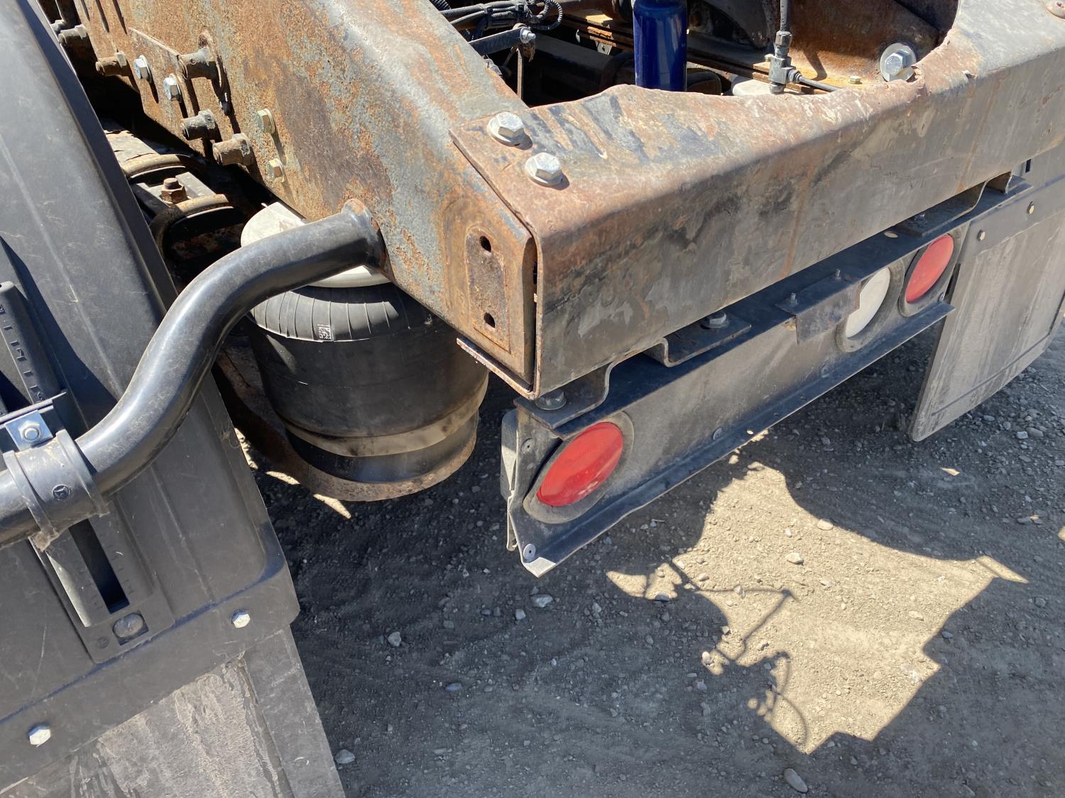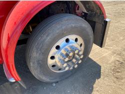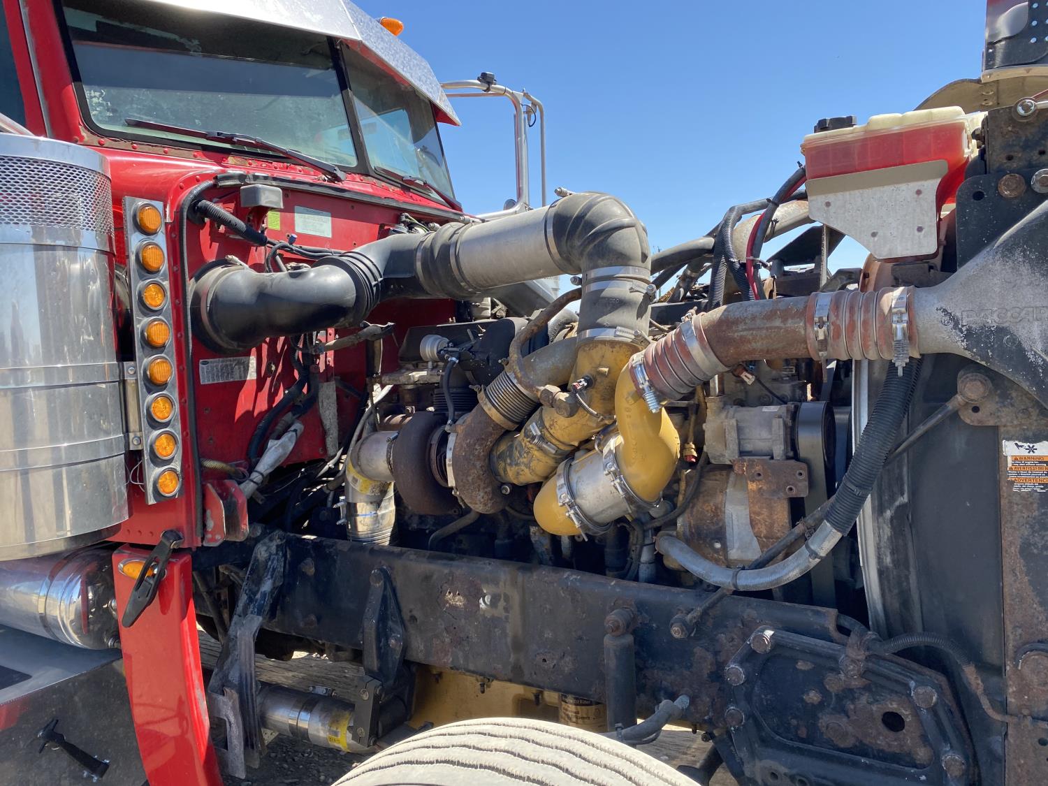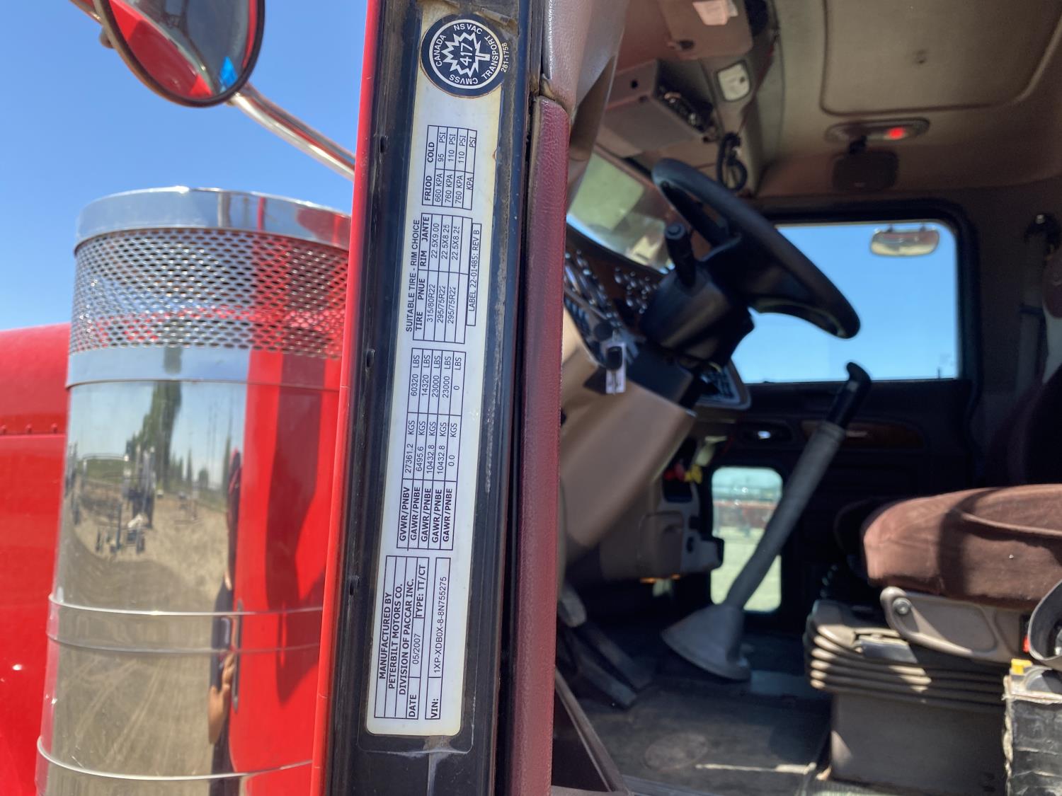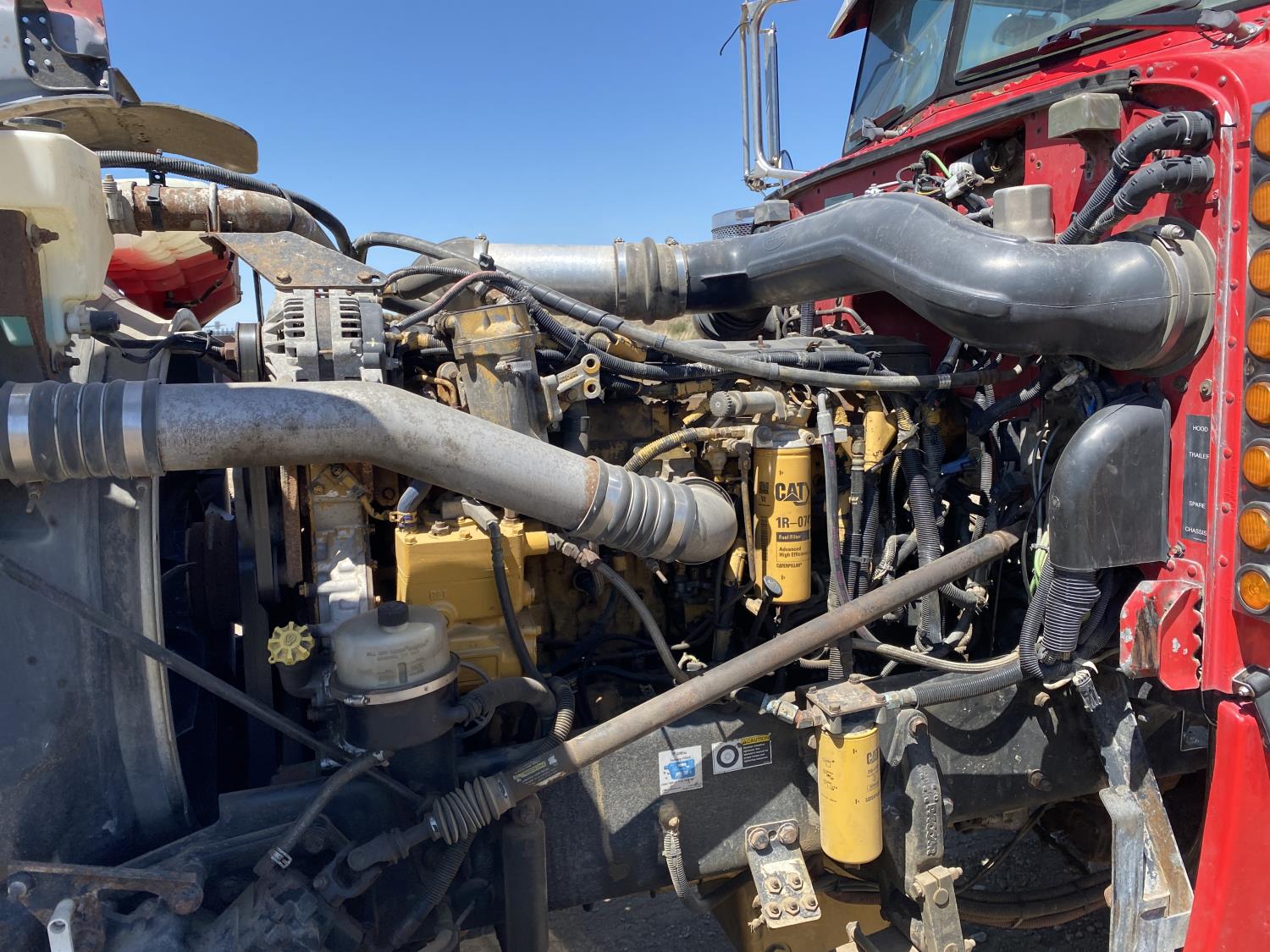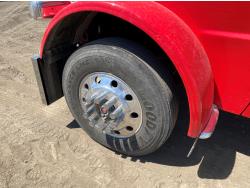 Caterpillar C15 6 cylinder engine, engine block heater, Eaton Fuller 18 speed manual transmission, flat top 60 inch sleeper, A/C, cruise control, air ride seats, hydraulic wet kit, air ride cab, PTO pump, Peterbilt air ride suspension, 14,320 lb front axle, 46,000 lb rear axles, full lockers, 242 inch WB, all aluminum wheels, 11R24.5 tires