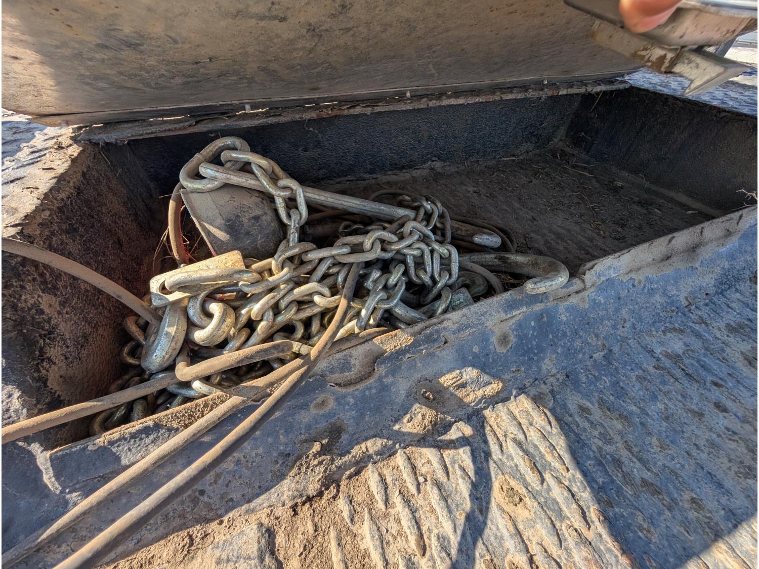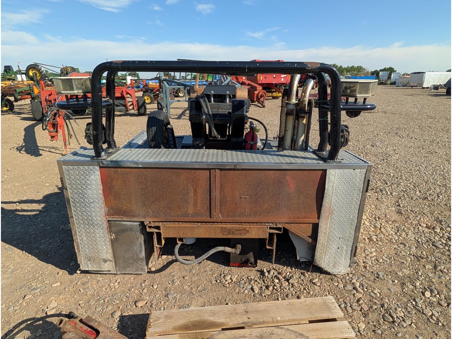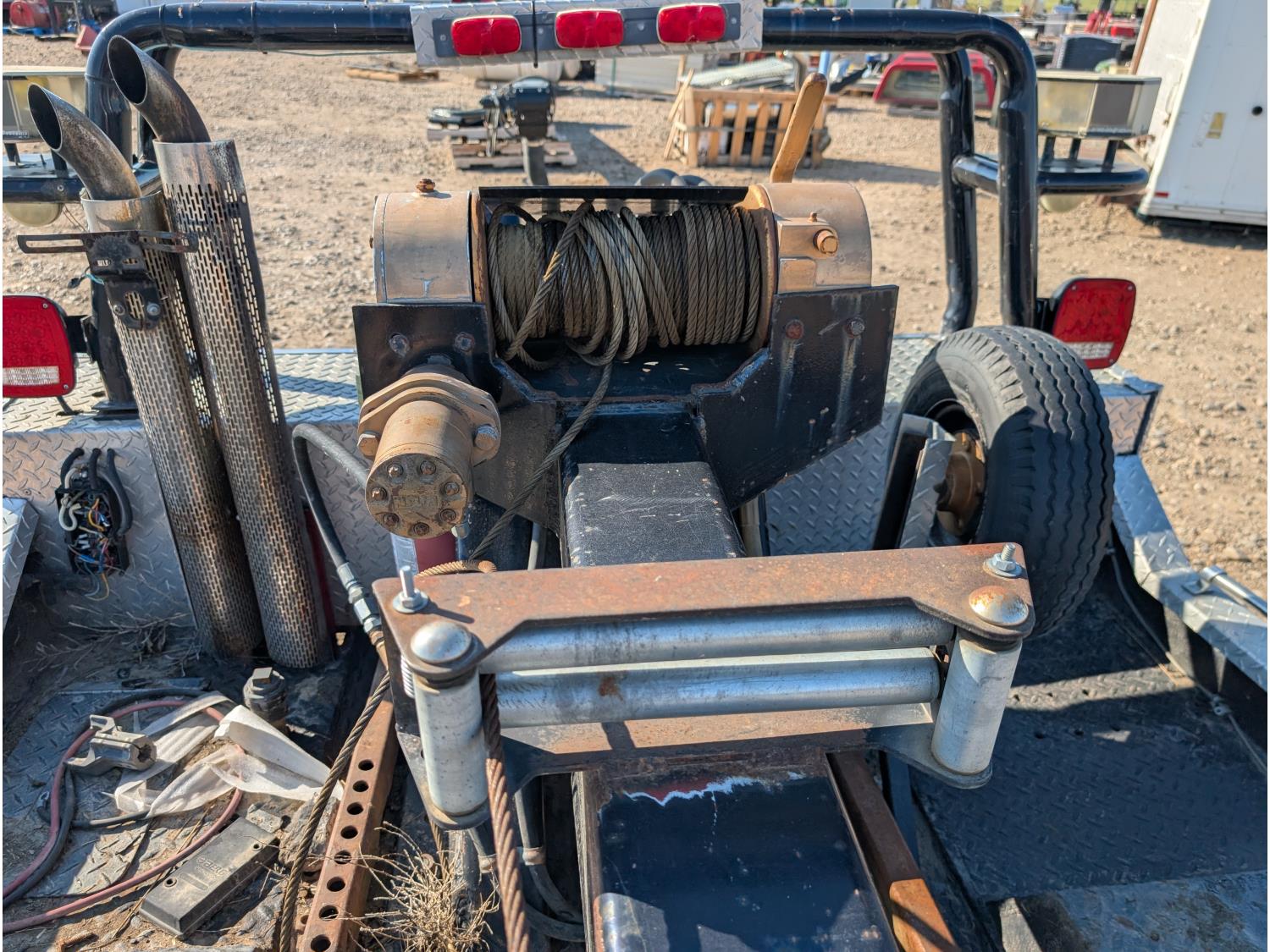 Ramsey hydraulic winch, auxiliary lighting, (3) storage boxes, rear hydraulic controls, Battery box, spare tire carrier w/ spare, exhaust stacks. Deck dimensions: 90 Inch L X 82 Inch W