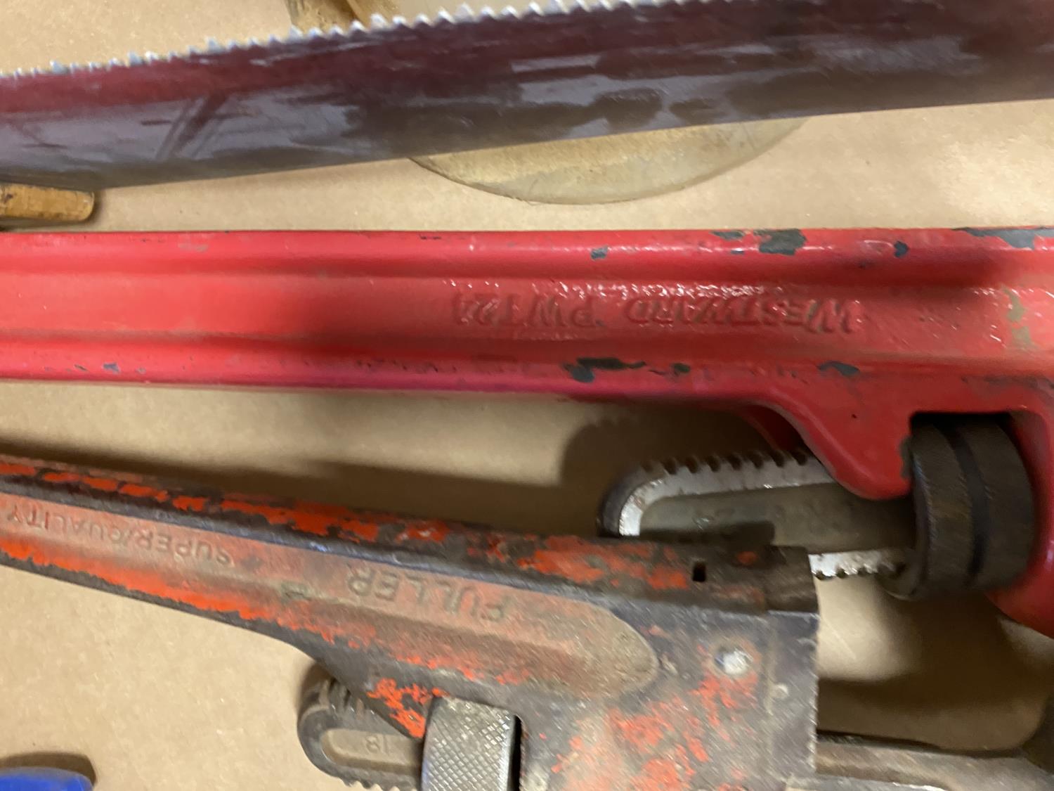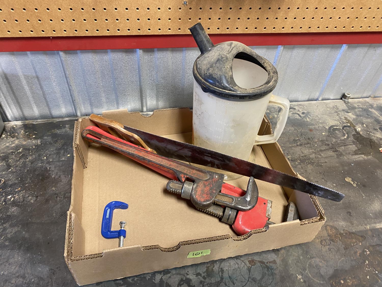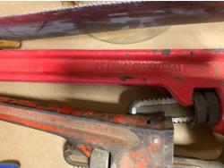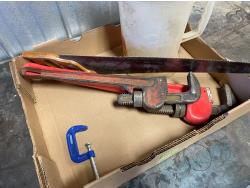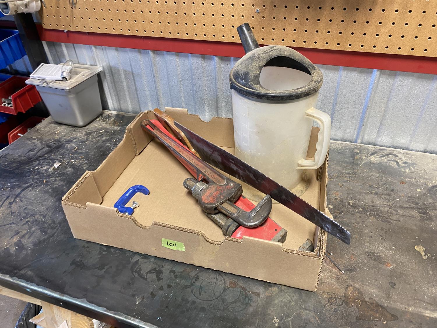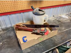 1340 Qty of (2) Pipe Wrenches w/ Hand Saw & 1 Gallon Oil Jug