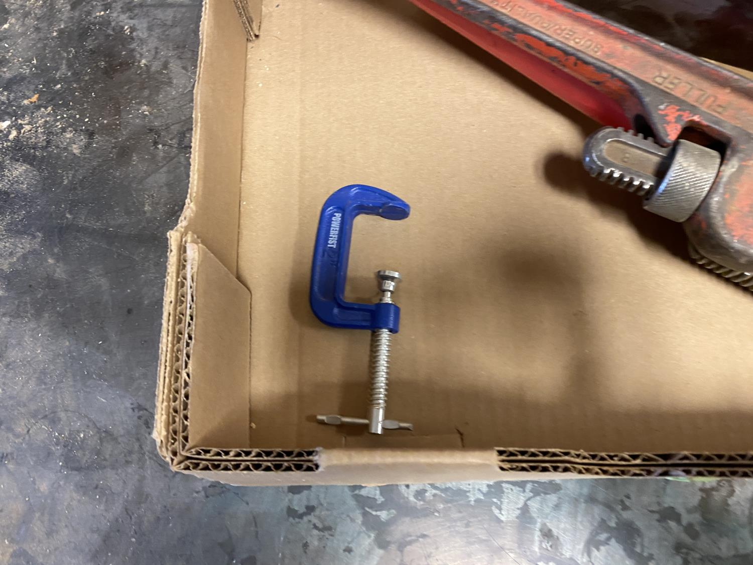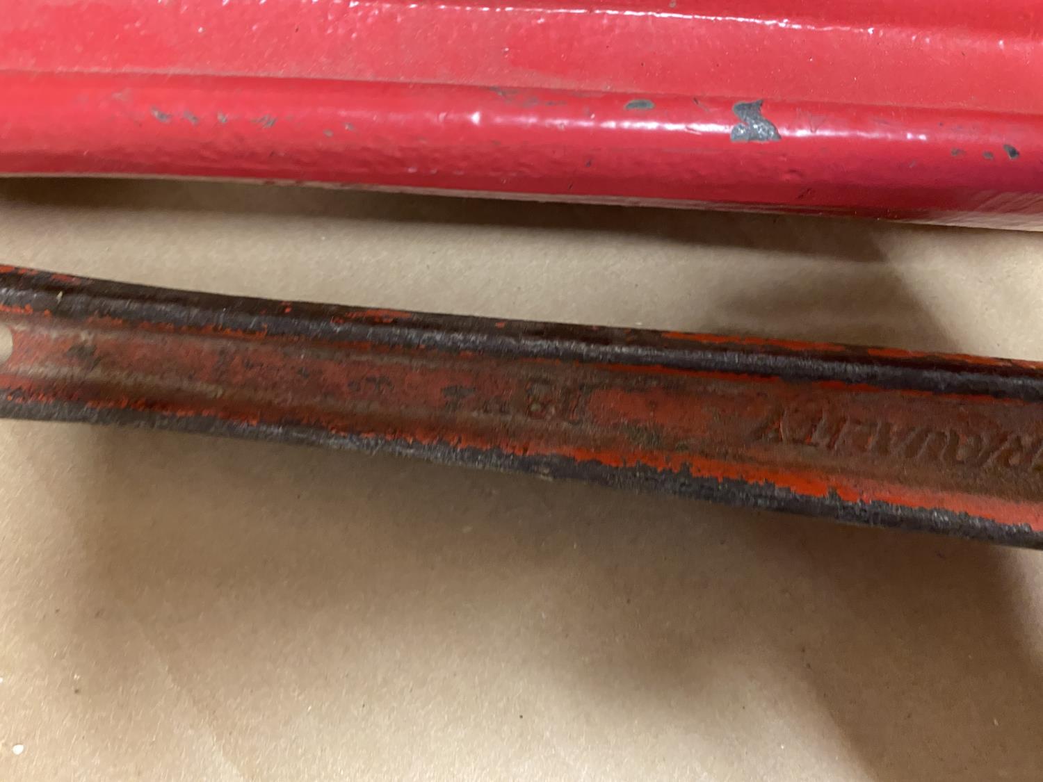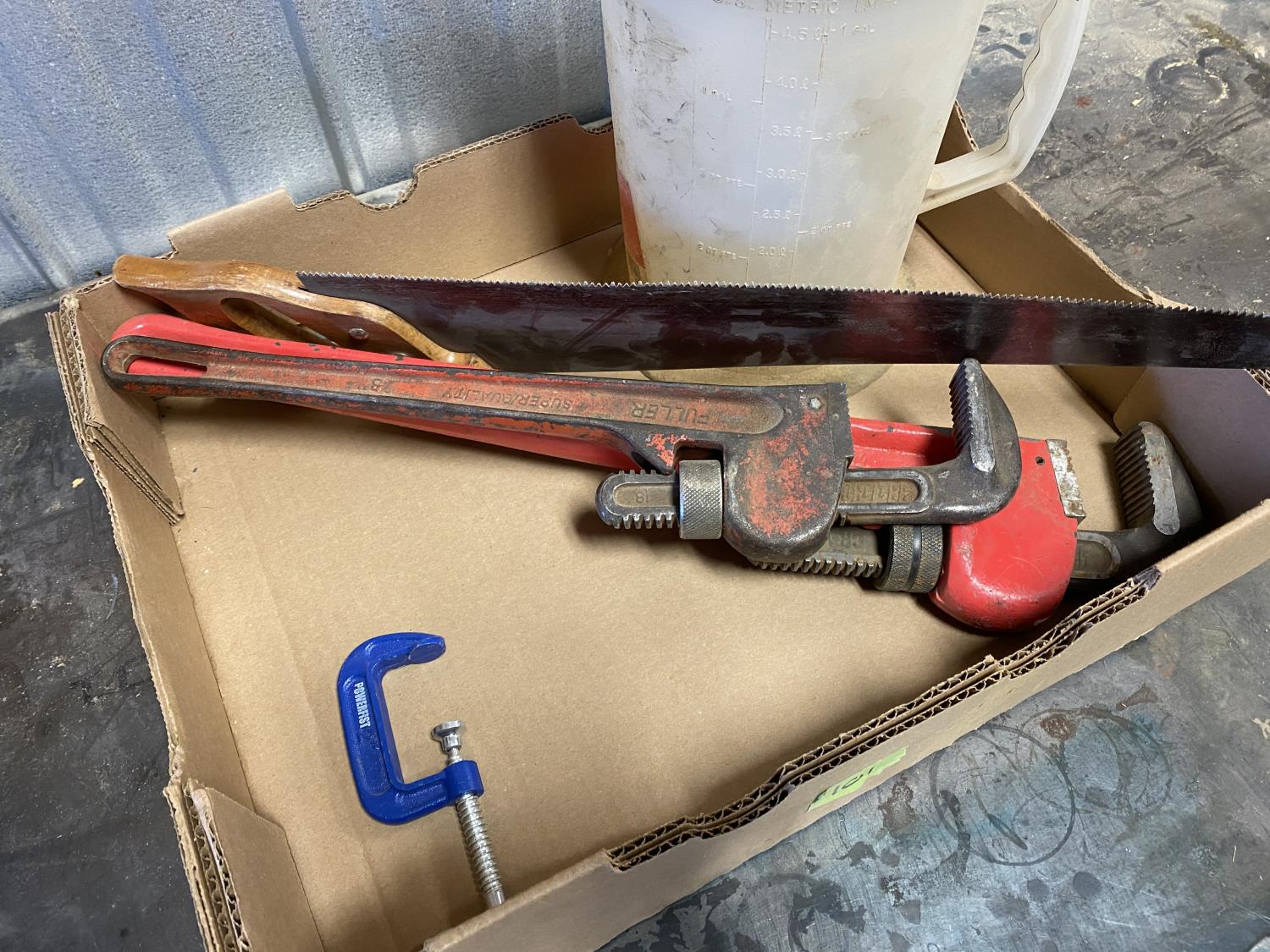 1340 Qty of (2) Pipe Wrenches w/ Hand Saw & 1 Gallon Oil Jug