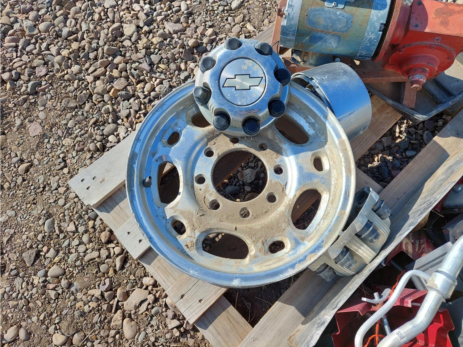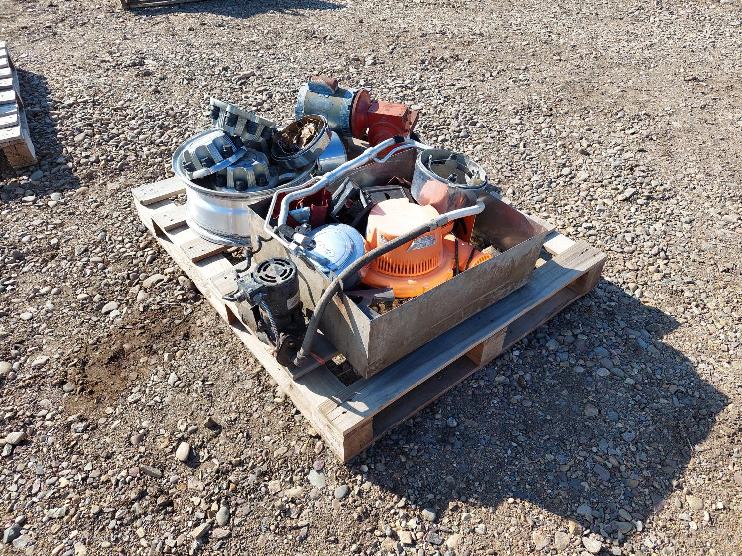 includes 16 inch Chevrolet 8 bolt rim, Ford hub caps, bouncy house blower fan, electric motor w/ gearbox