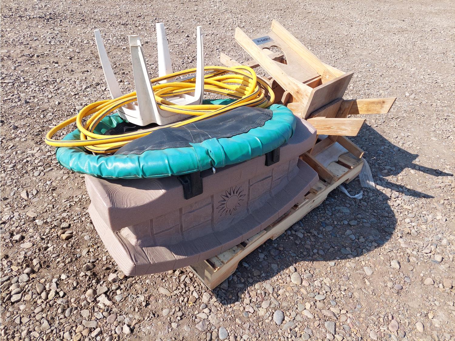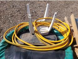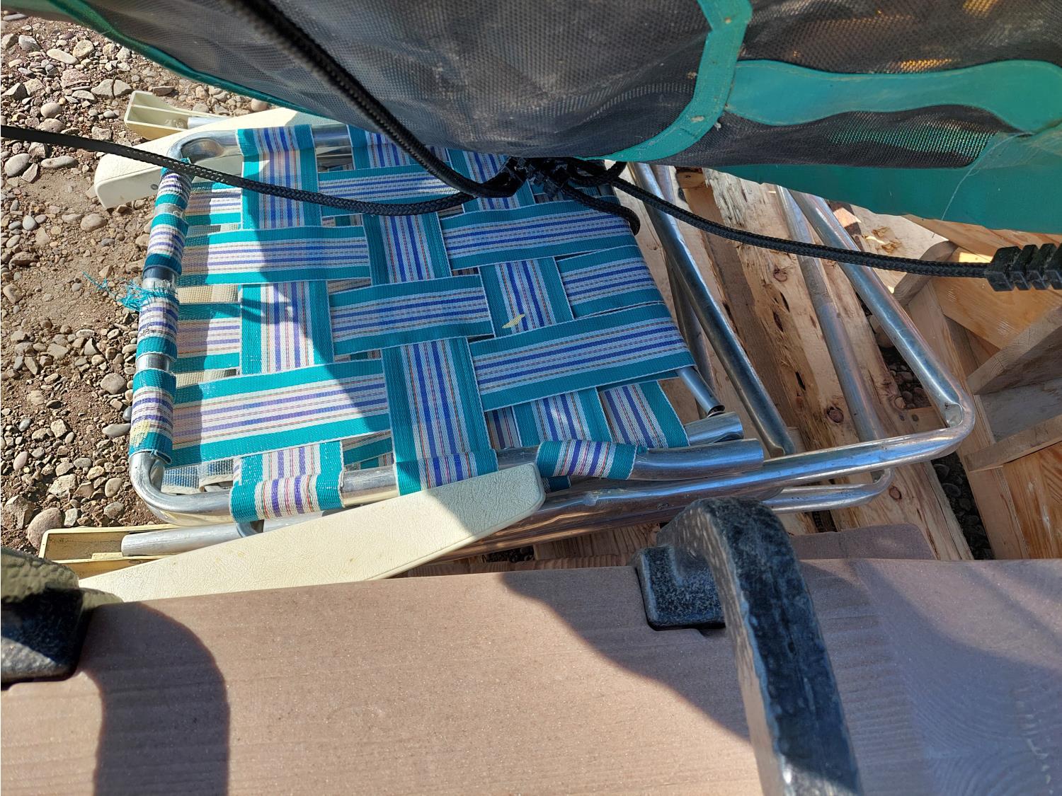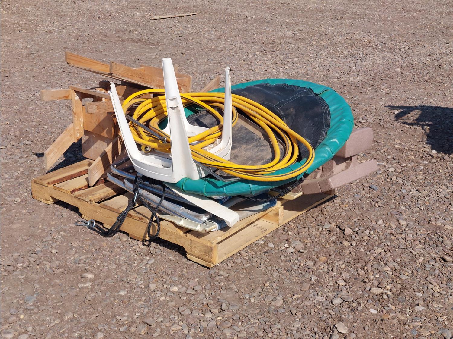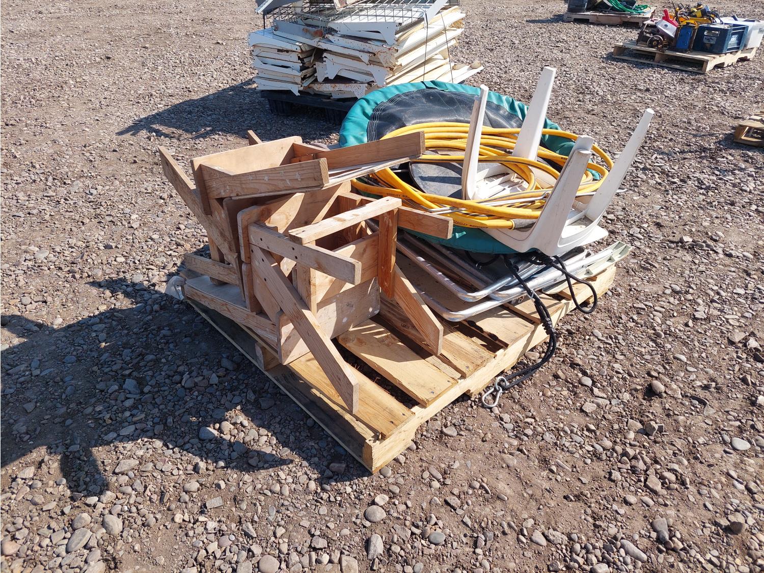 (2) wooden chairs, (2) folding chairs, (2) plastic stools, hammock swing, teeter totter, and garden hose