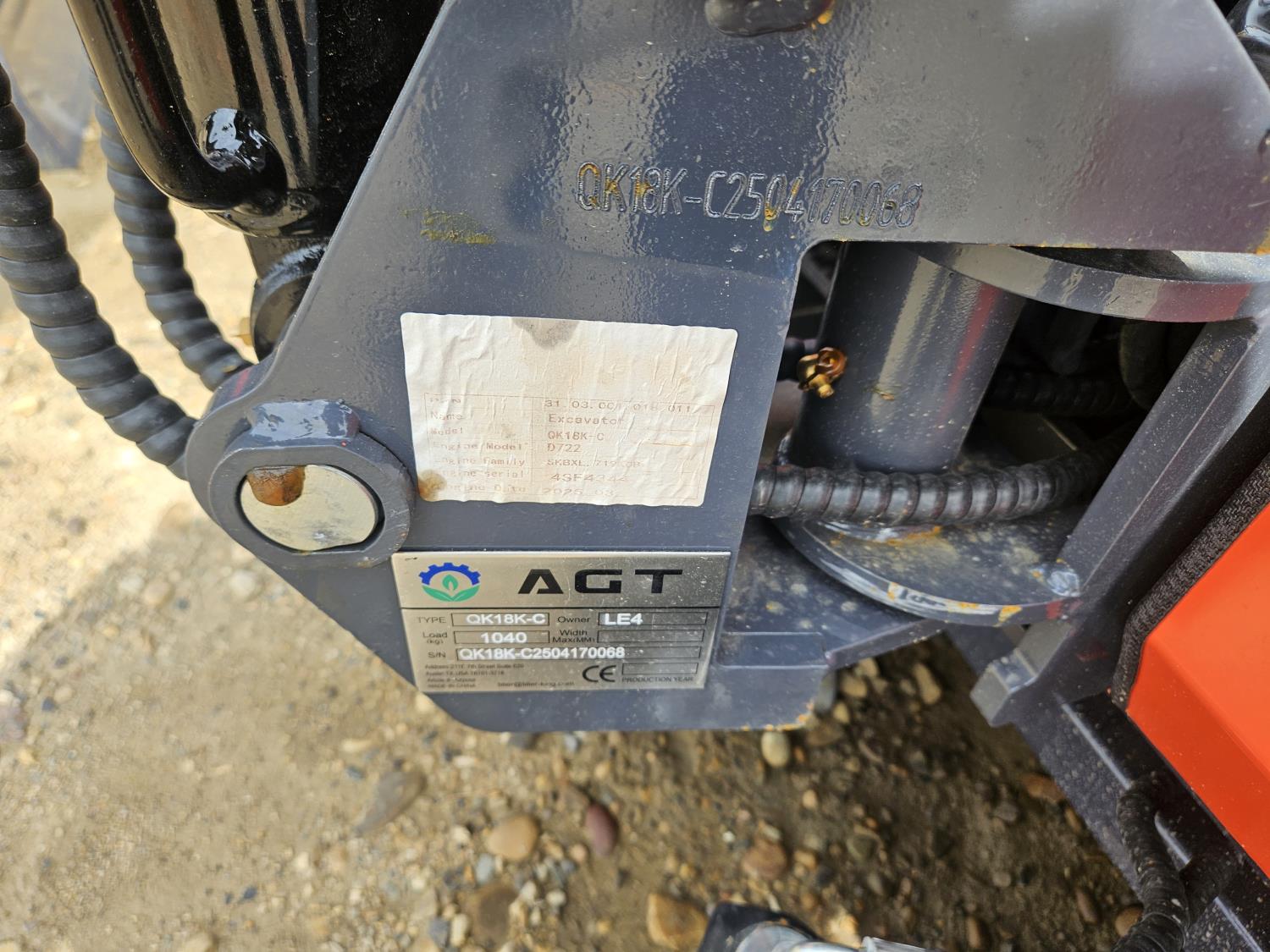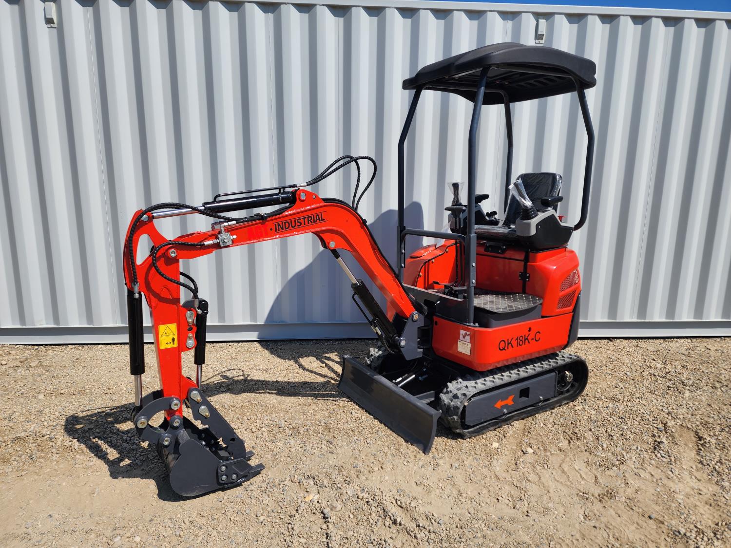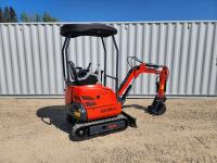 Open station, Kubota diesel engine, canopy, 15 inch dig bucket, hydraulic thumb, 2 Ft 8 inch stick, backfill blade, 7 inch rubber tracks