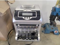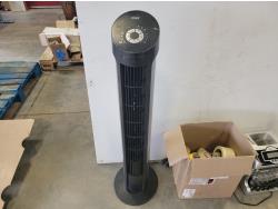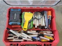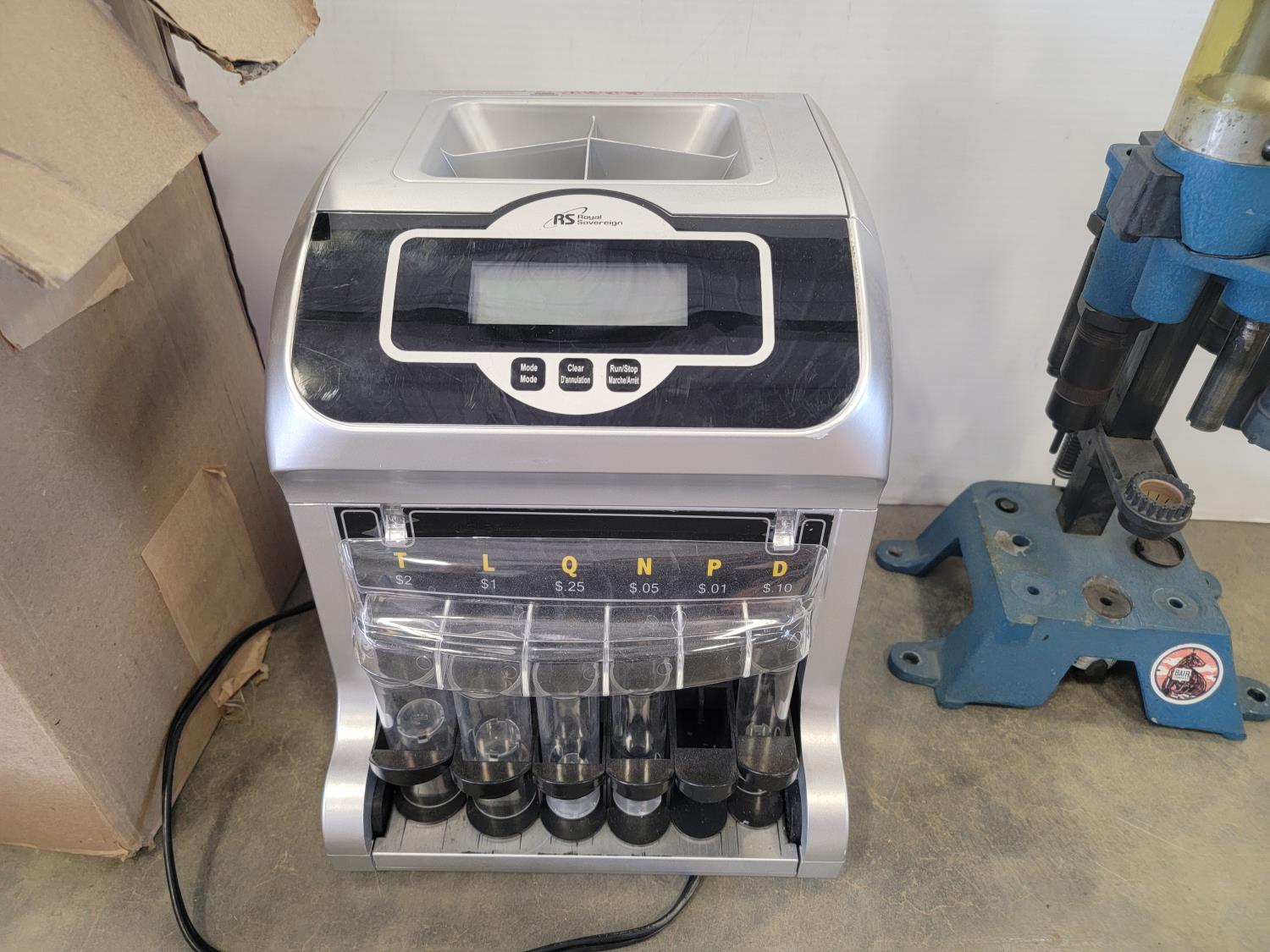 Security camera, oscillating tower fan, tapes, wood repair markers, coin sorter, reloading press