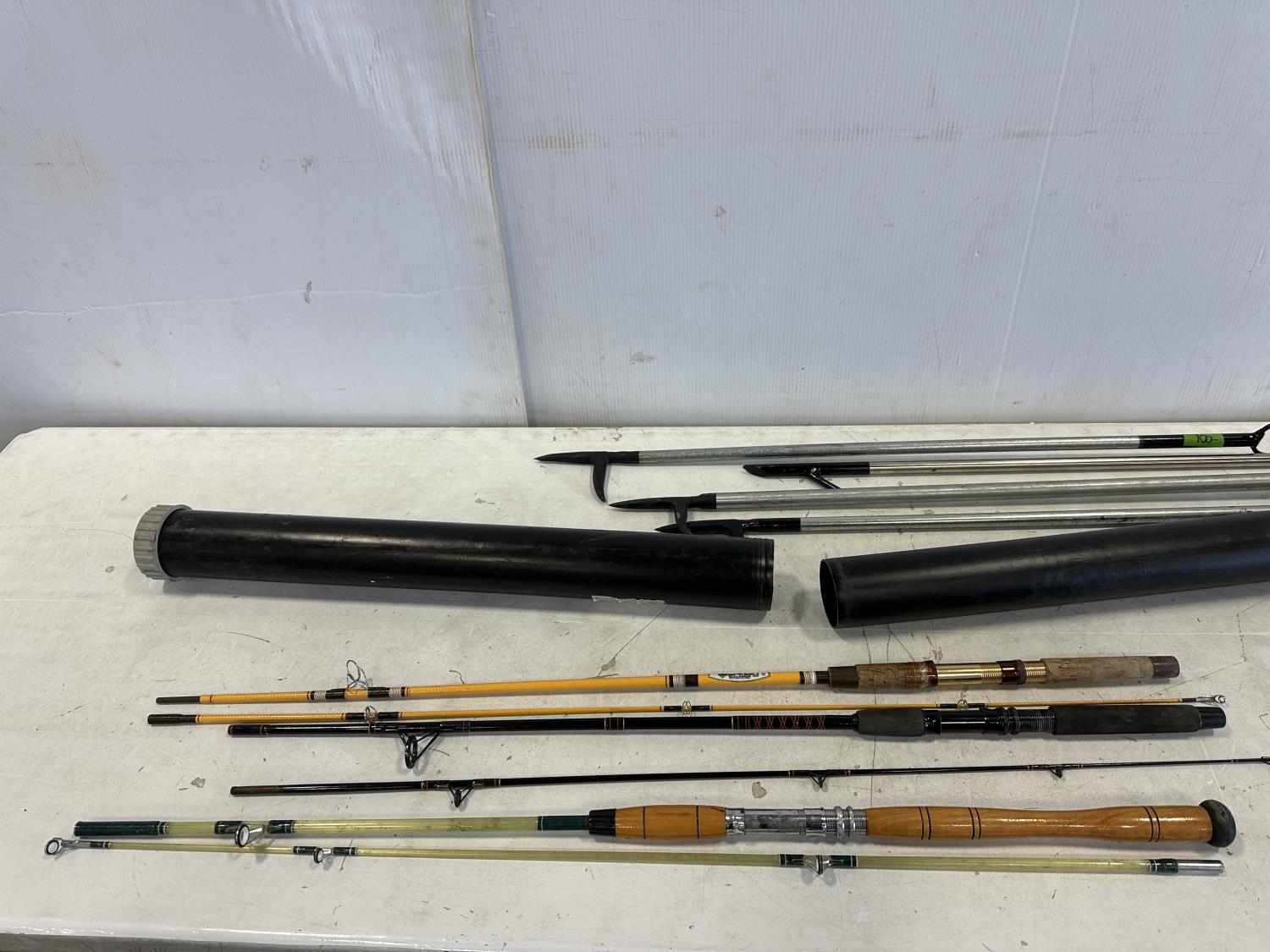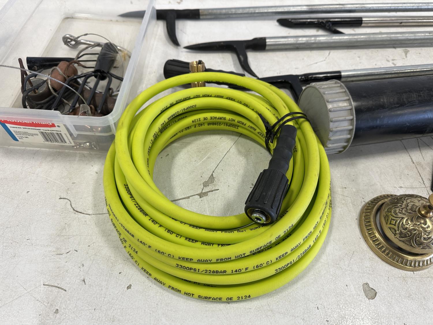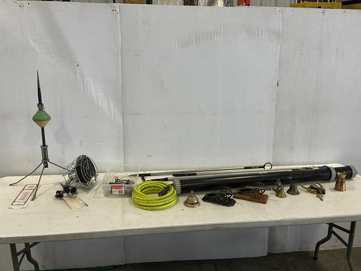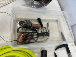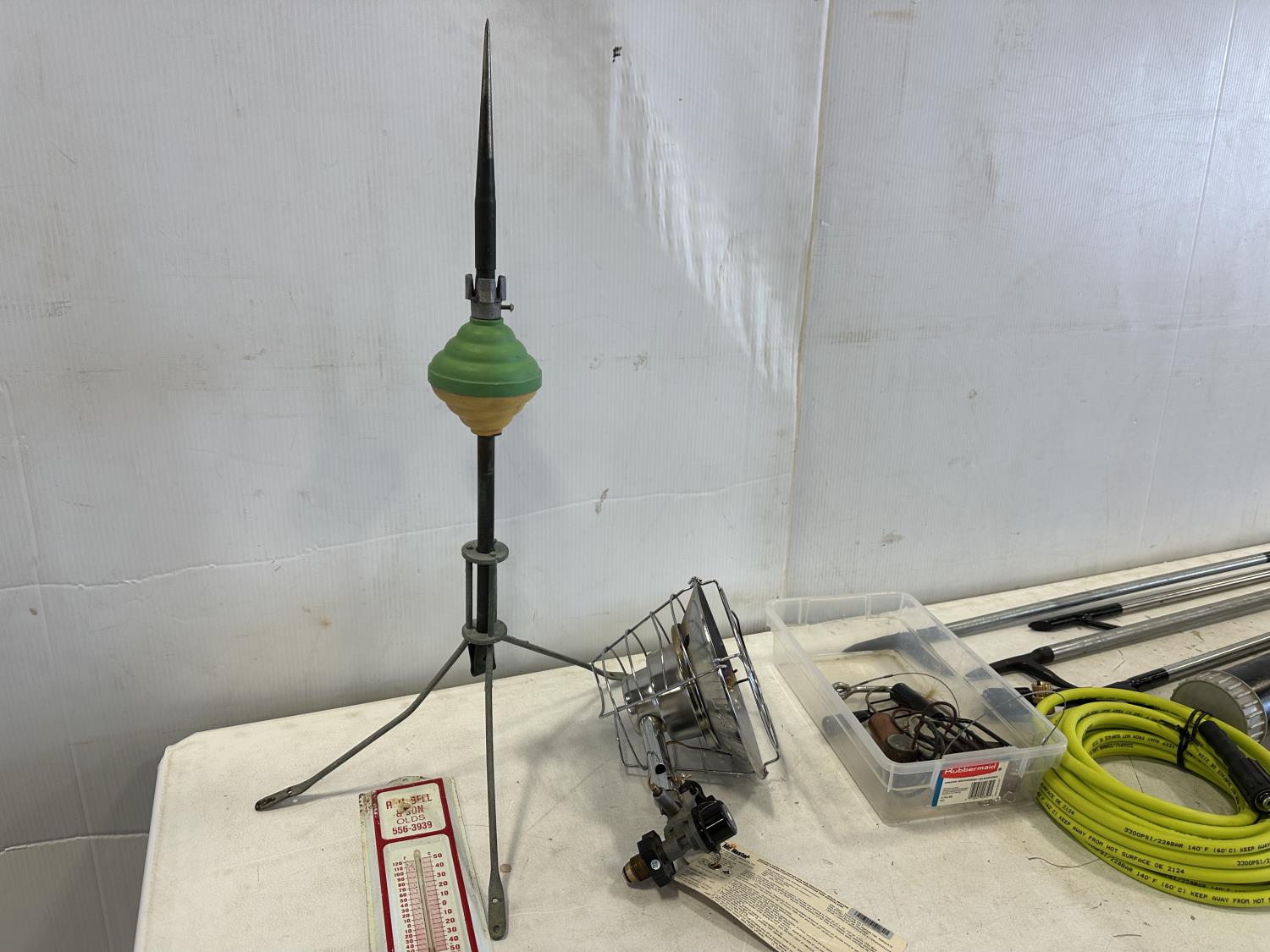 Mr. Heater tank top propane heater, thermometer, fire pokers, fishing rods