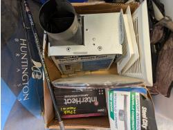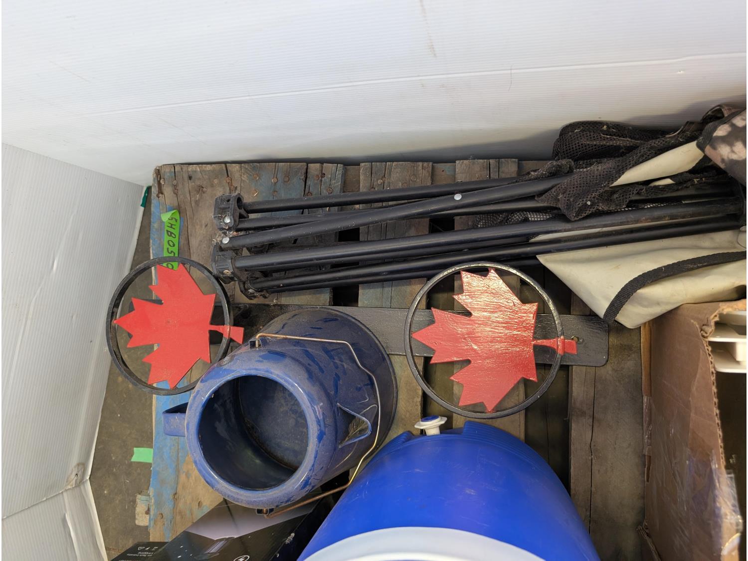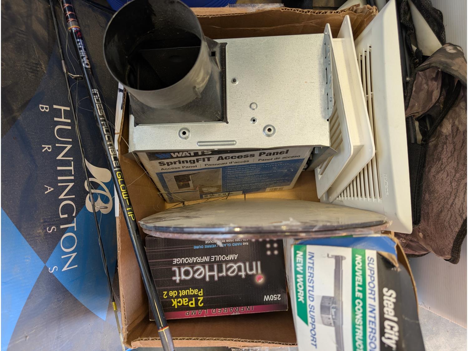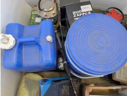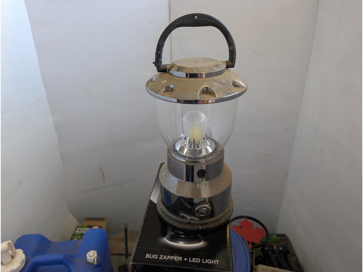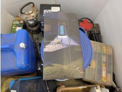 Water jugs, garden hose with sprinkler, tractor seat, kitchen faucet (unused), fishing lures, fishing rod, battery powered lantern, bug zappers, mosquito trap, bathroom fan, signs, folding chair