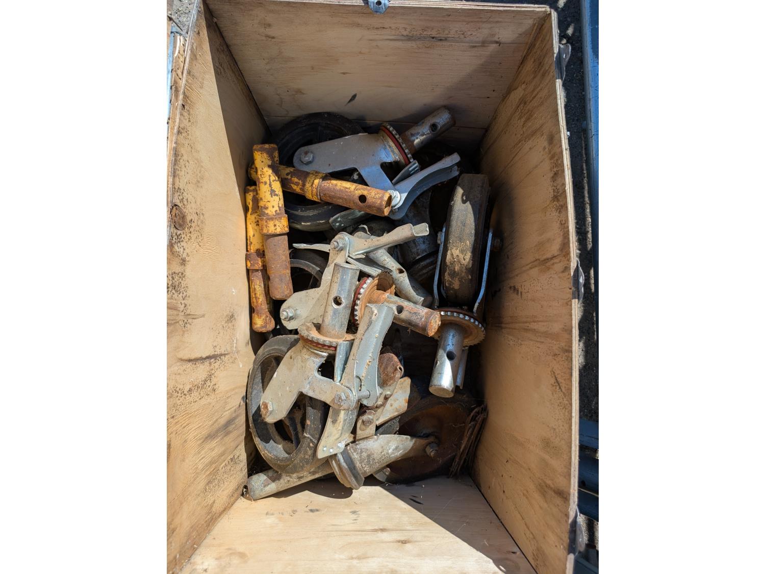 (5) 5 ft x 5 ft mains, (4) 5 ft x 3 ft extensions, (16) scissor brakes, (14) straight brakes, (6) cross member braces, (4) 19 inch x 7 ft decking, (4) adjustable legs, (8) scaffold wheels, (2) 2 ft support brackets
