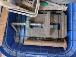 Solar battery charger, various fasteners, hand tools, heat tape, vise, door weather stripping