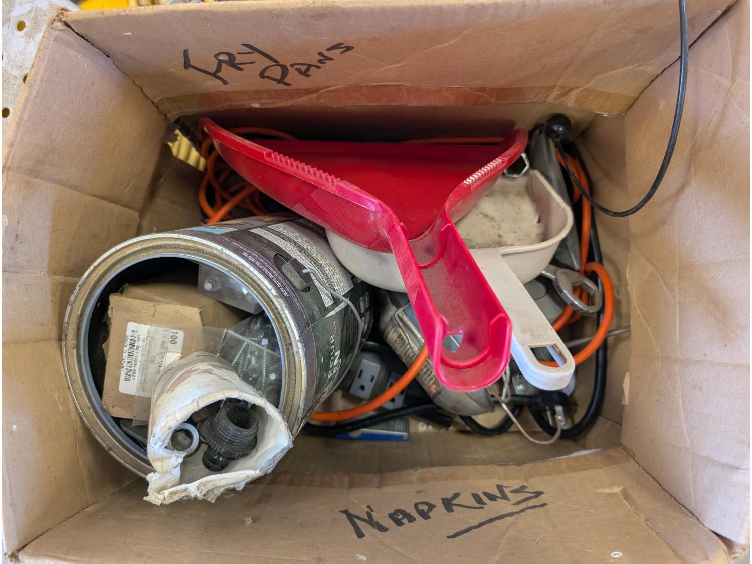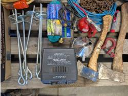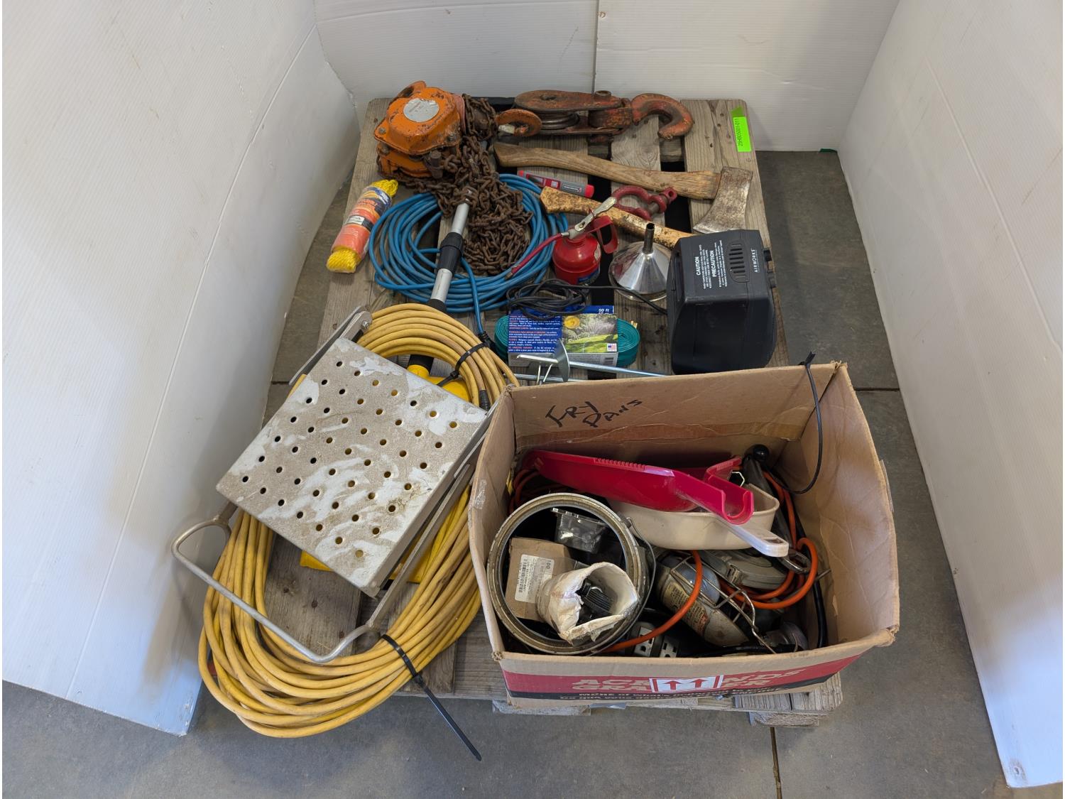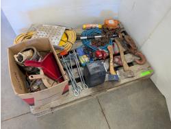 Space heater, hatchets, snatch block, Westward 1 ton chain hoist, 50 ft extension cord, funnel, oil can, miscellaneous tools