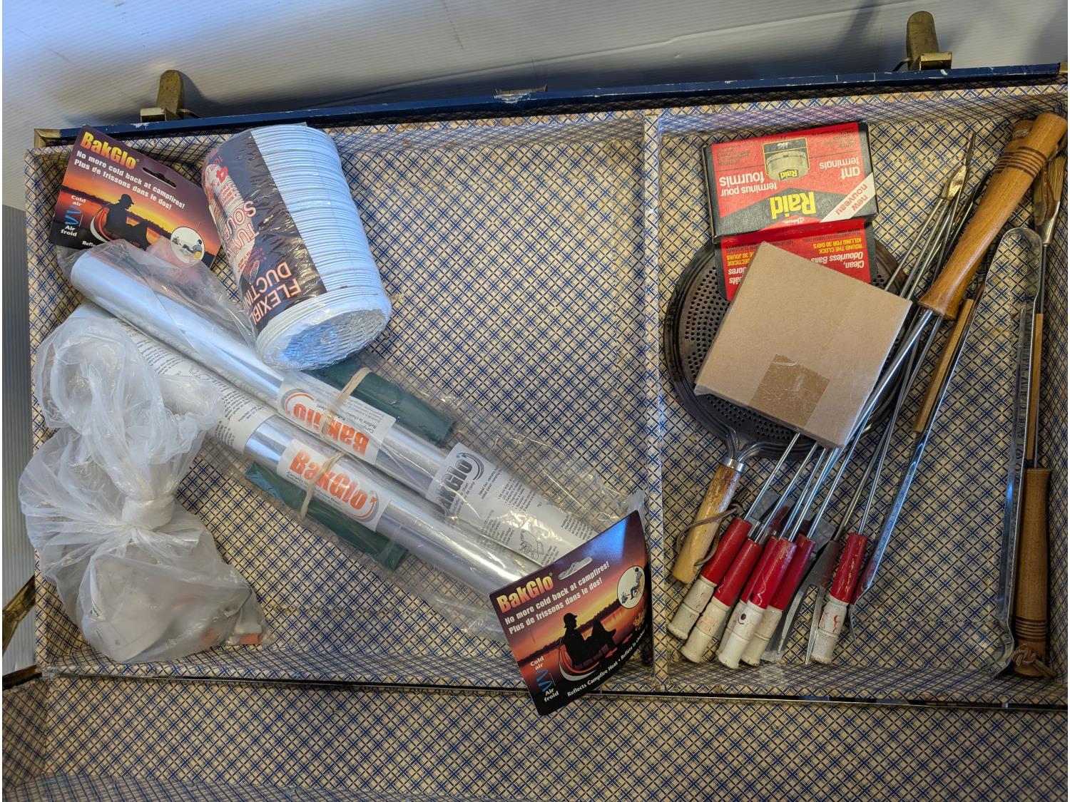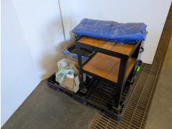 steel table 20 inch x 21 inch x 28 inch h, tarp, metal trunk 20 inch x 36 inch x 19 inch h, box of 6 LED lights, 3 inch flush mount lights, paint trays, paint brushes