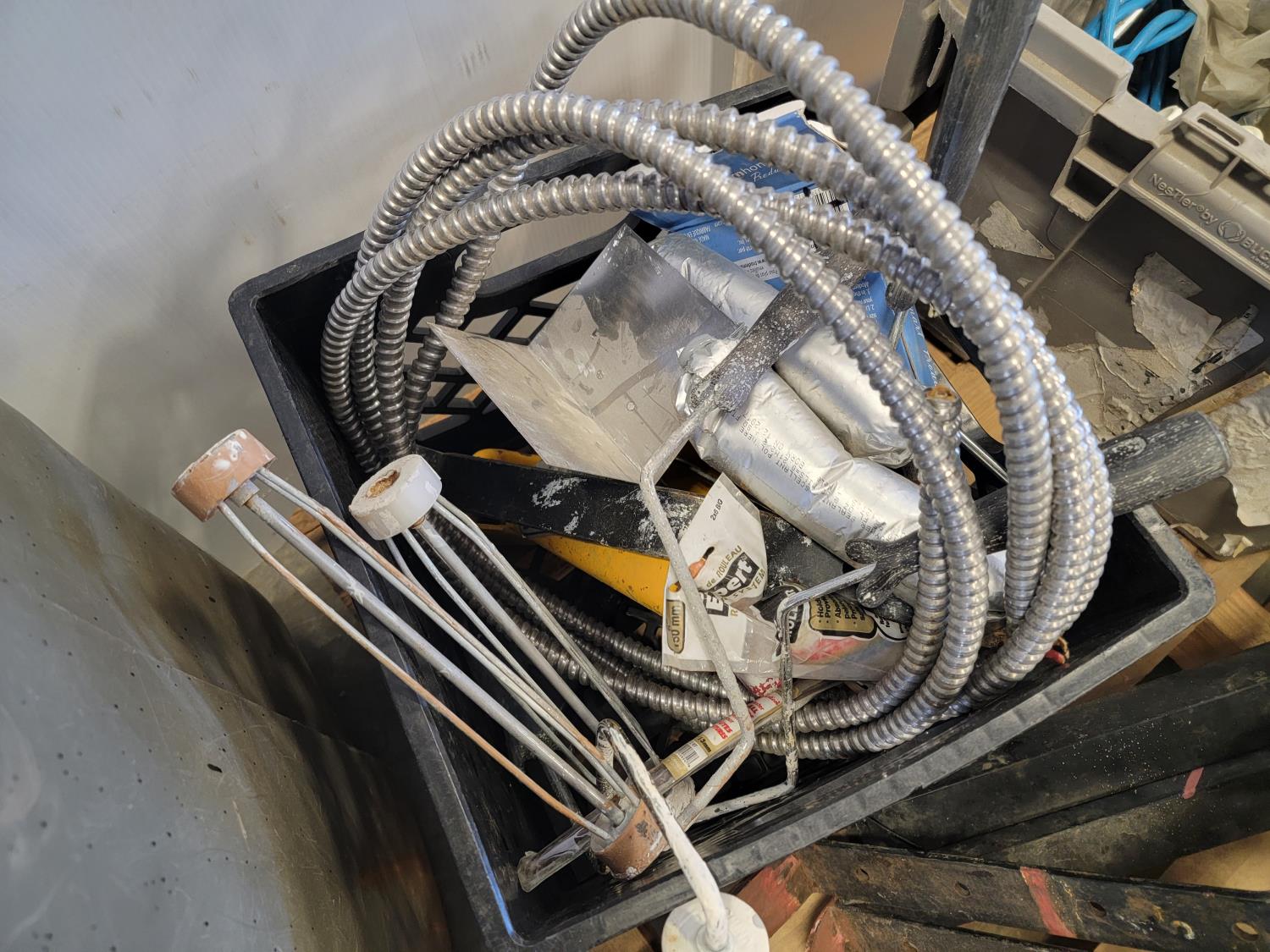 Paint brushes, trowels, shop fluids, paint rollers, Bostitch air nailer