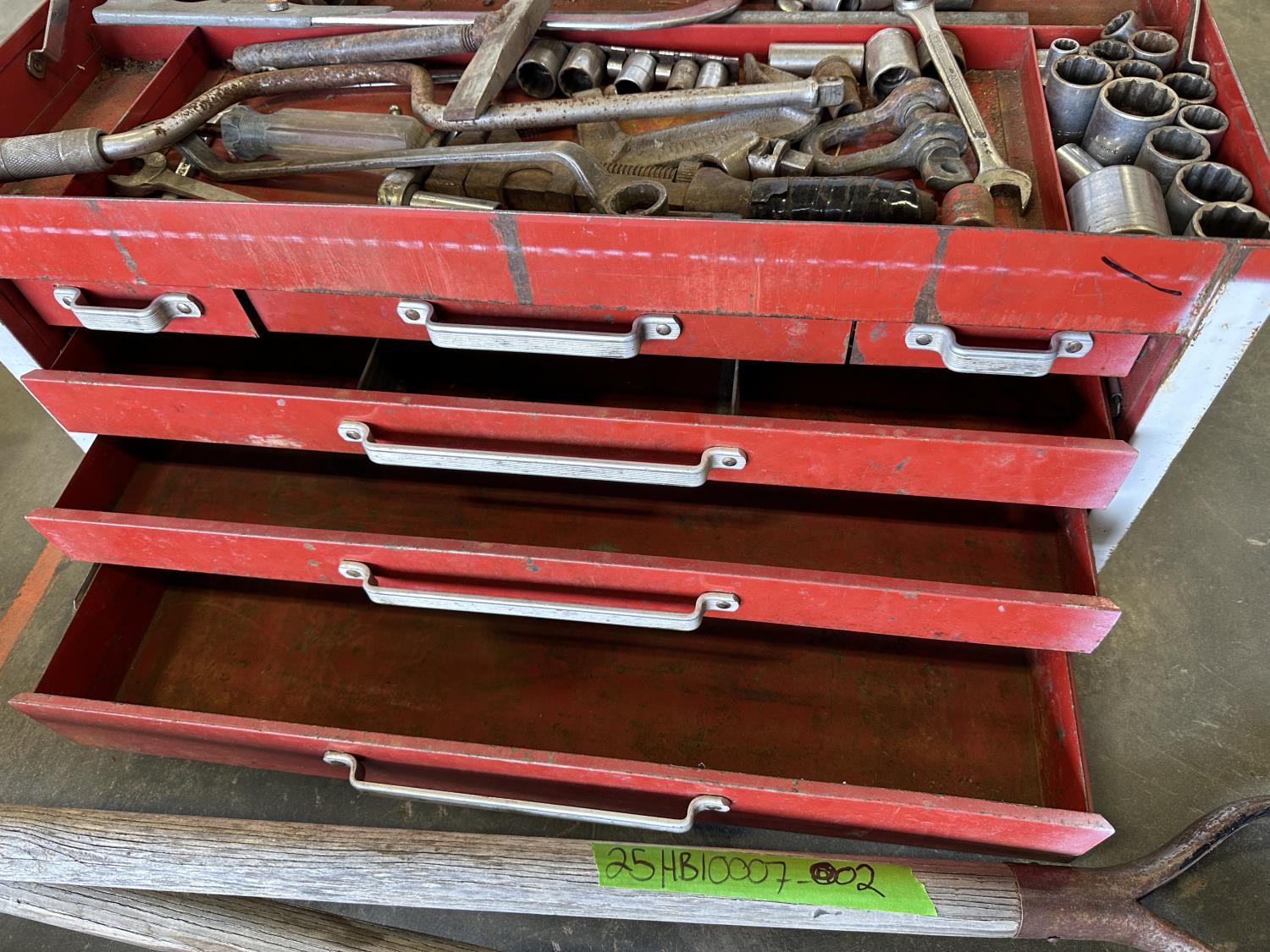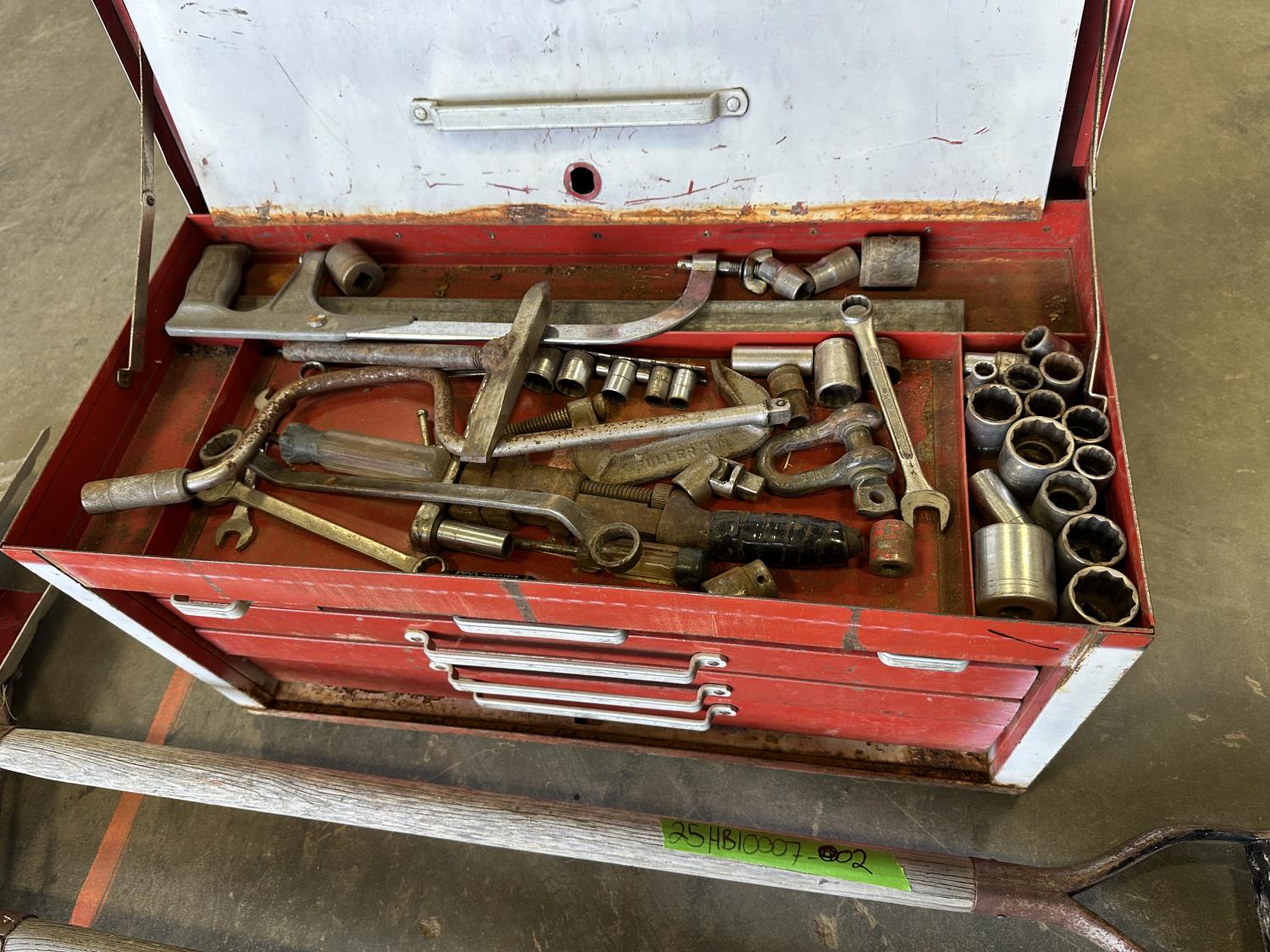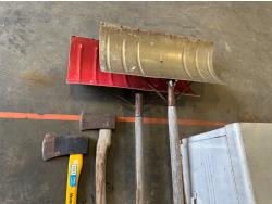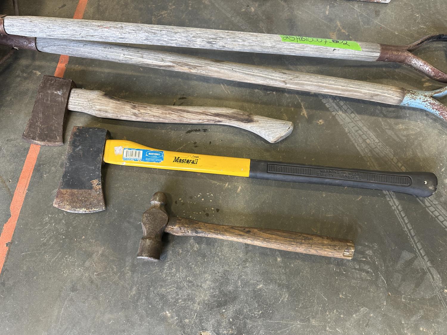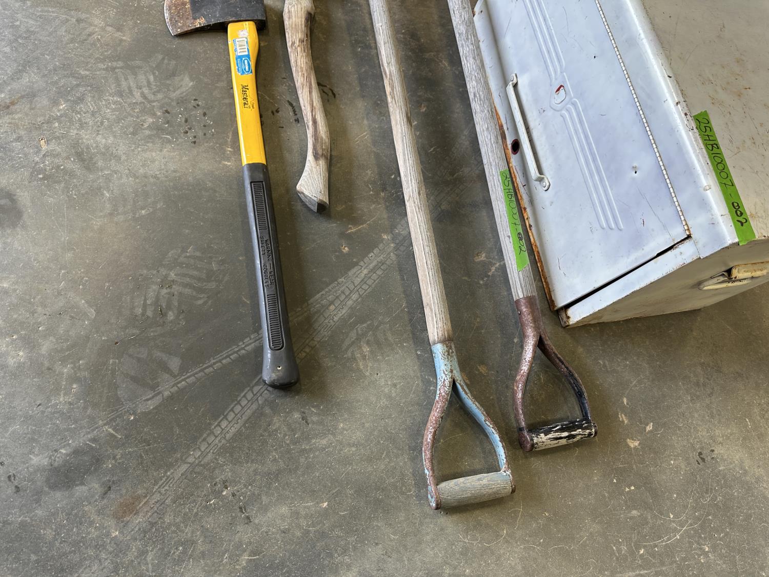(2) metal shovels, tool box with some contents, hammer, (2) axes