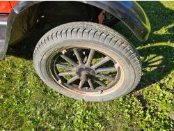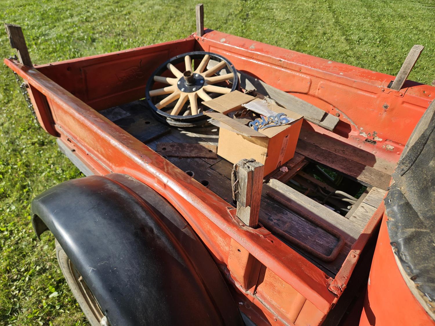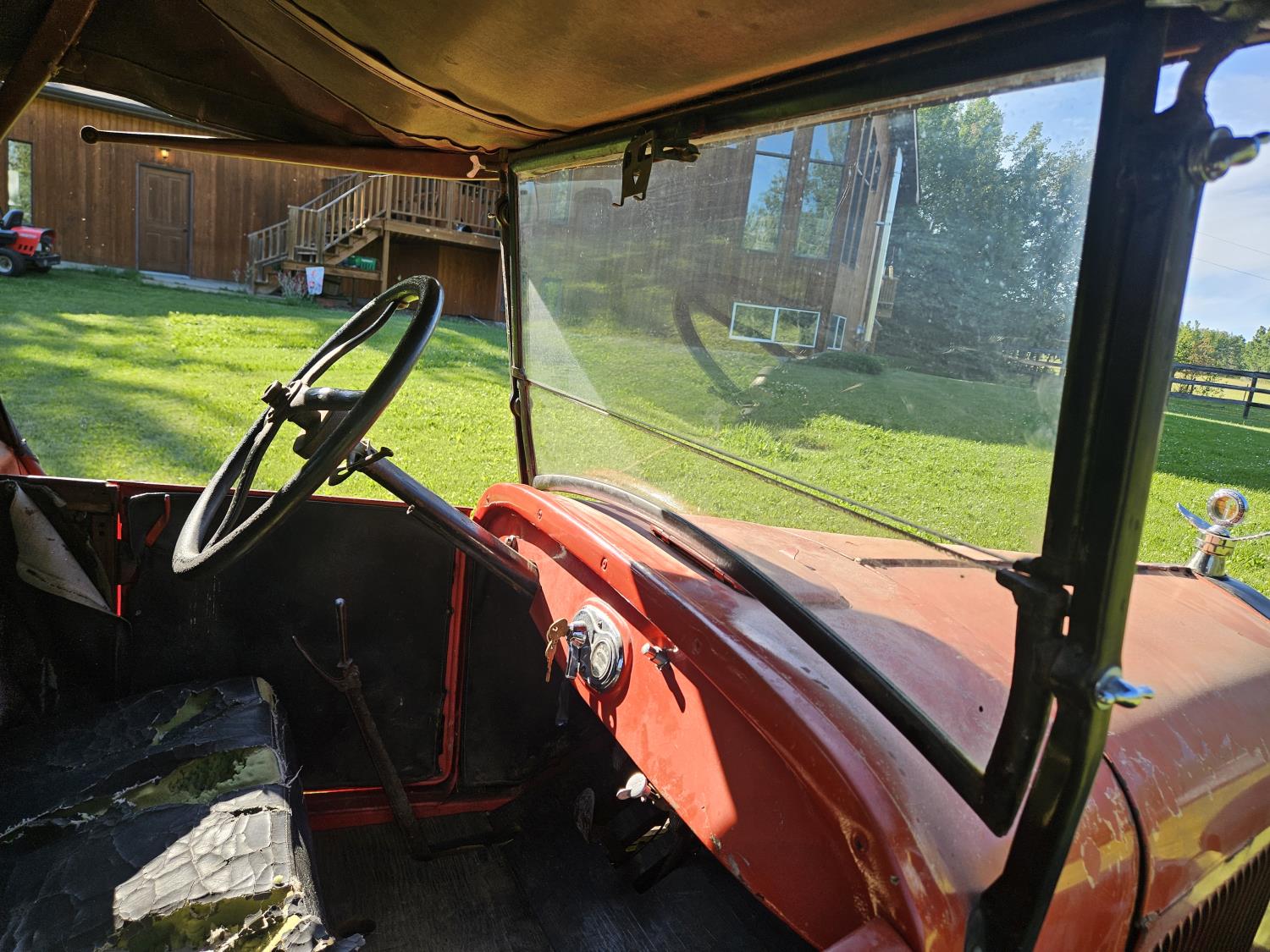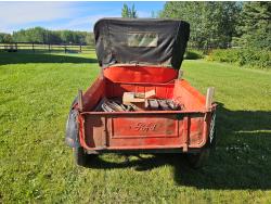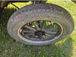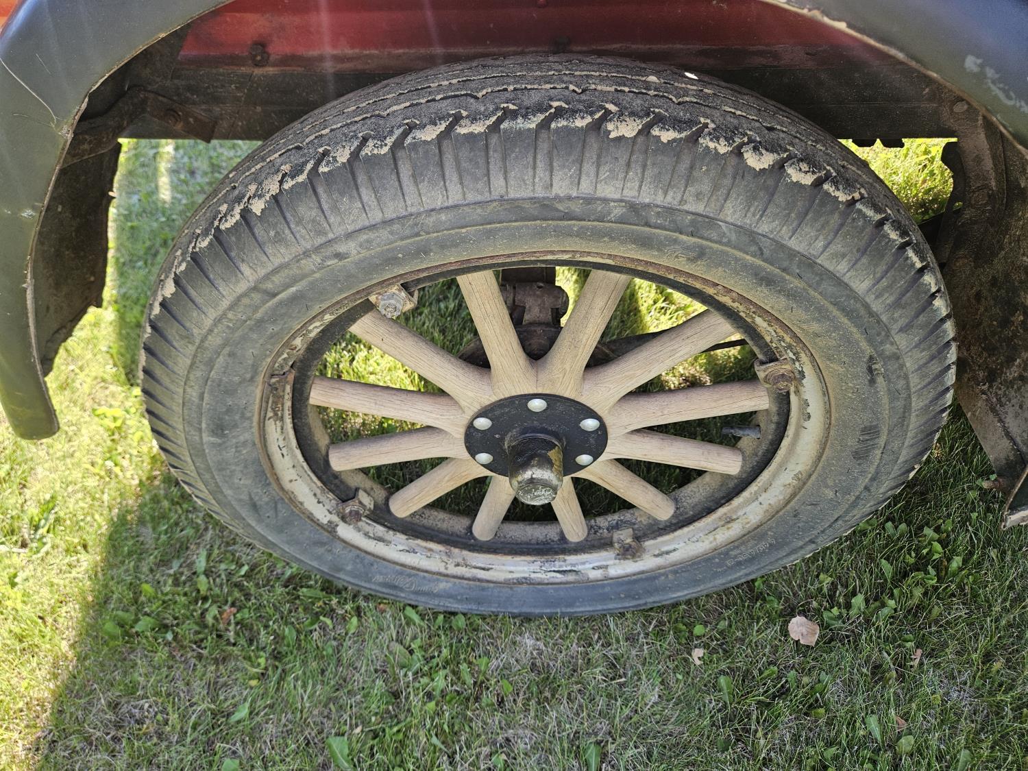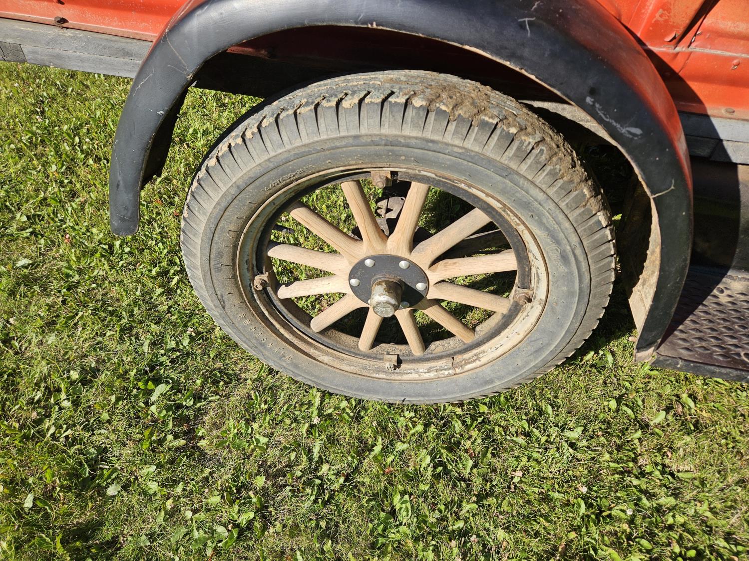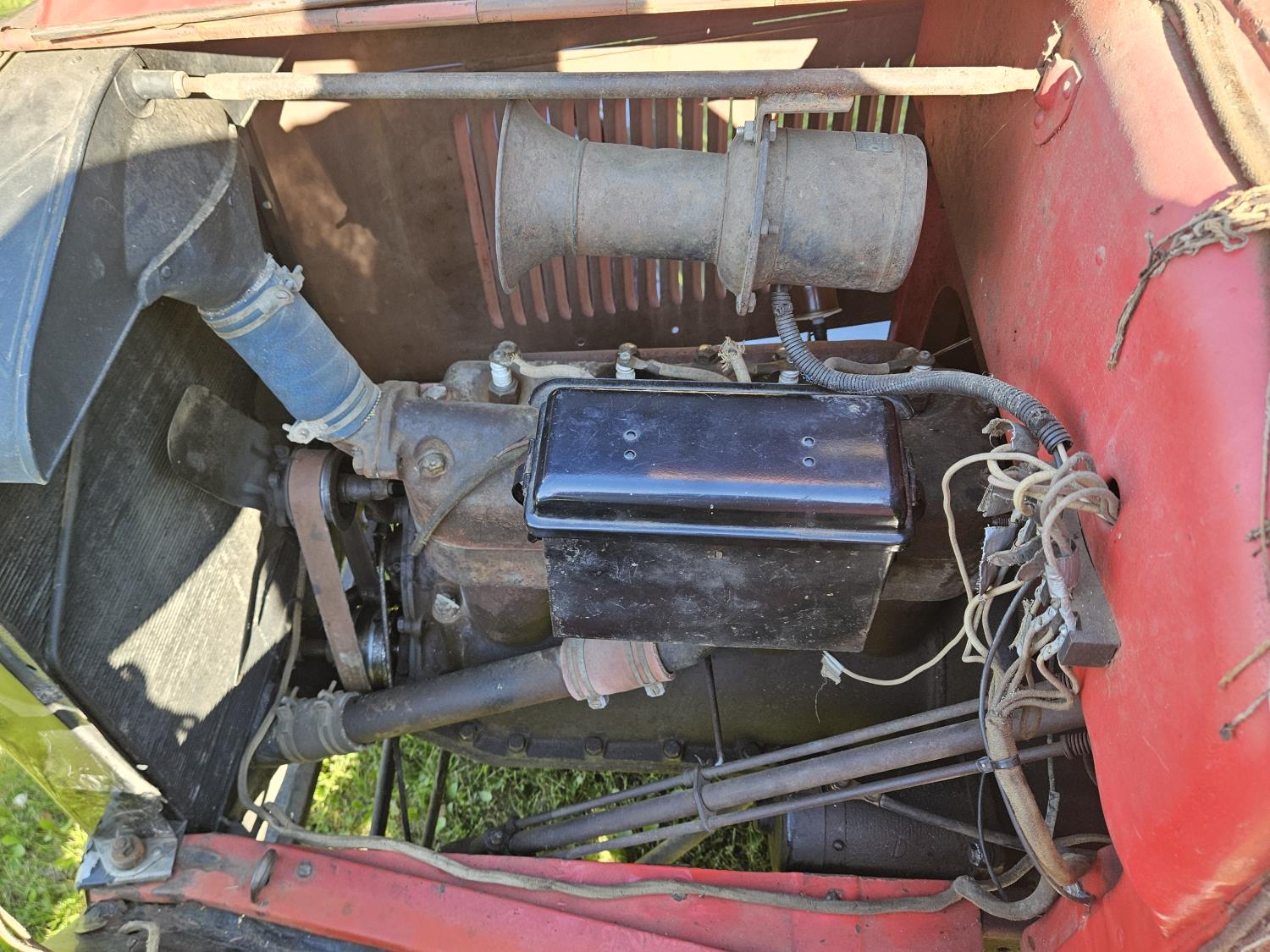 4 cylinder gas engine, 2 speed planetary transmission, 2 wd, 6 volt positive ground, spring suspension, 2 wheel brakes, wooden spoke wheels, extra parts, 4.40/4.50-21 tires, this unit runs but needs a tune up