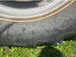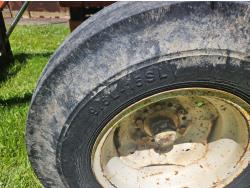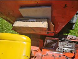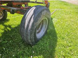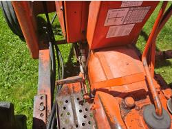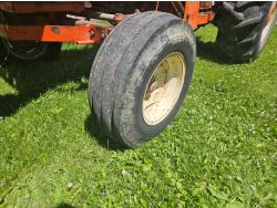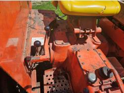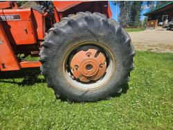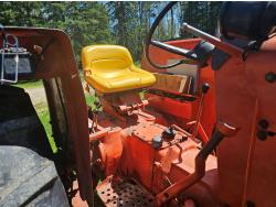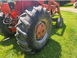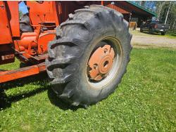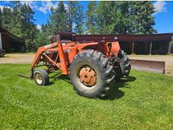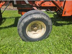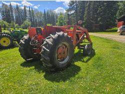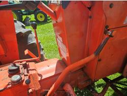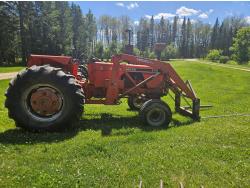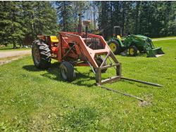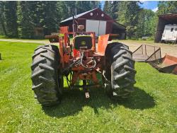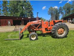 Allis-Chalmers 500 loader, 60 inch bucket, bale forks, 4 cylinder 60 HP, gas engine, 8 speed partial power shift transmission, open station platform, 540 PTO, 2 rear hydraulic outlets, 9.5L-15SL front tires, 18.4-28 rear tires