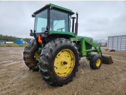 John Deere 158 loader, 72 inch bucket, 7.6 L 6 cylinder diesel engine, 8 speed power shift transmission, cab, A/C, radio, 540/1000 PTO, 3 rear hydraulic outlets, 11.0-16 front tires, 20.8-38 rear tires
