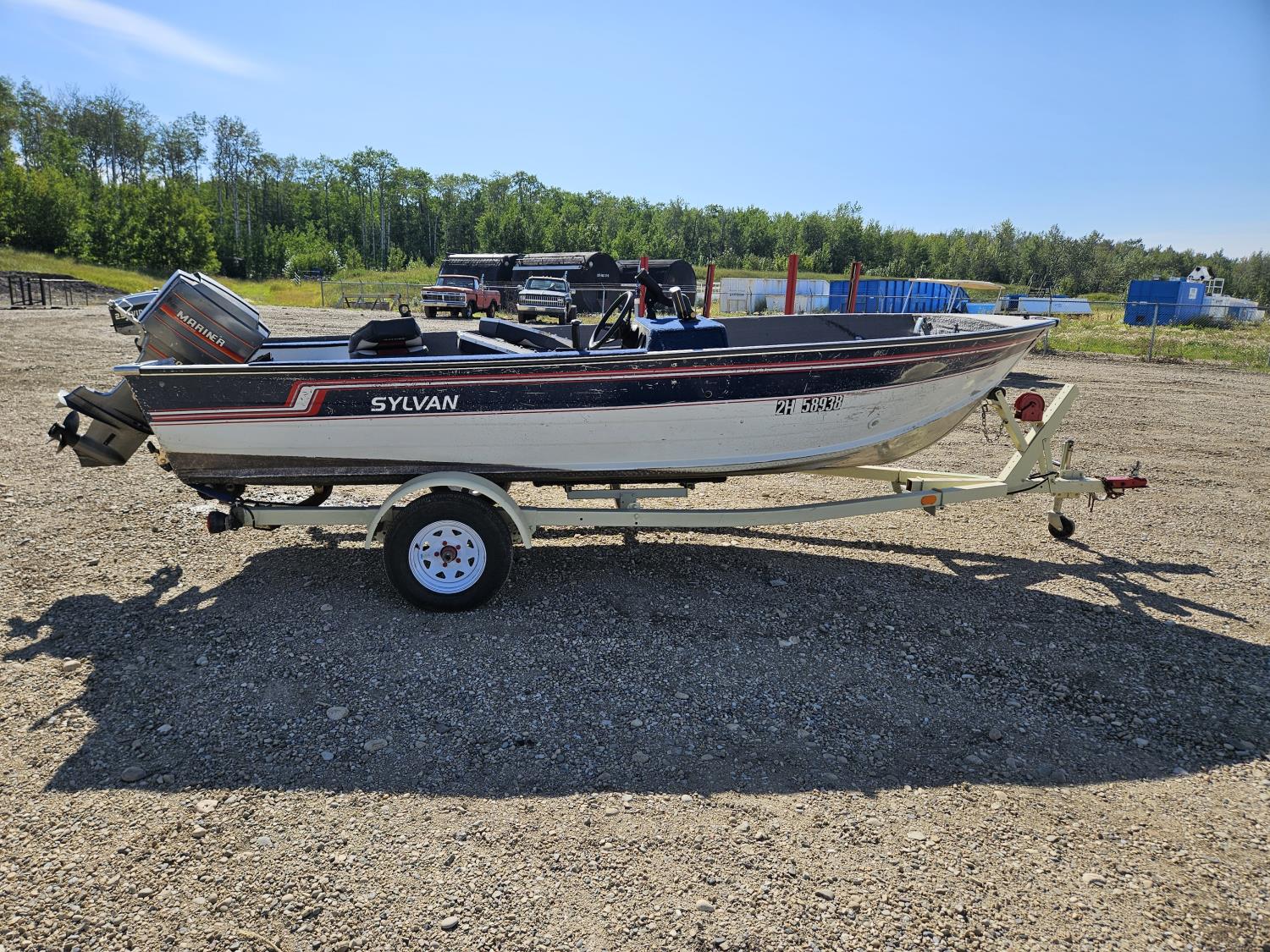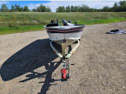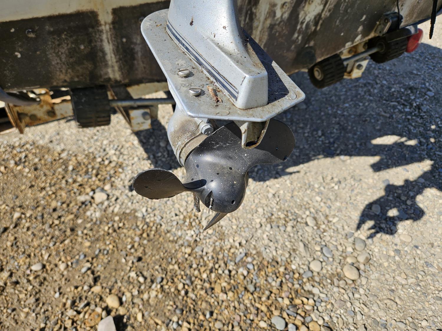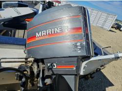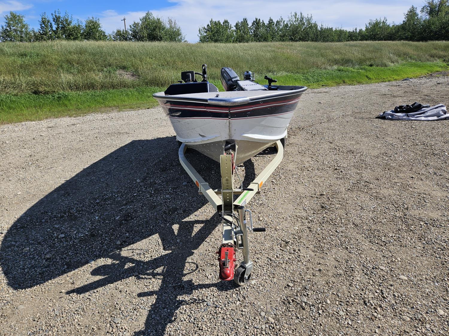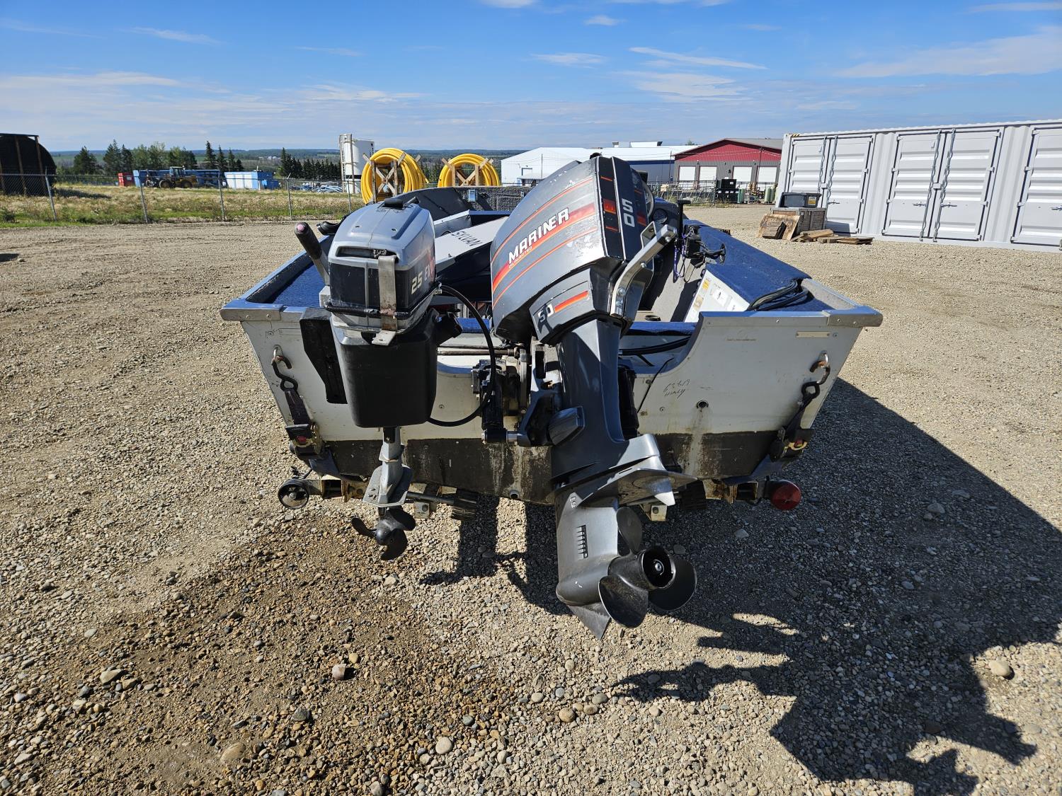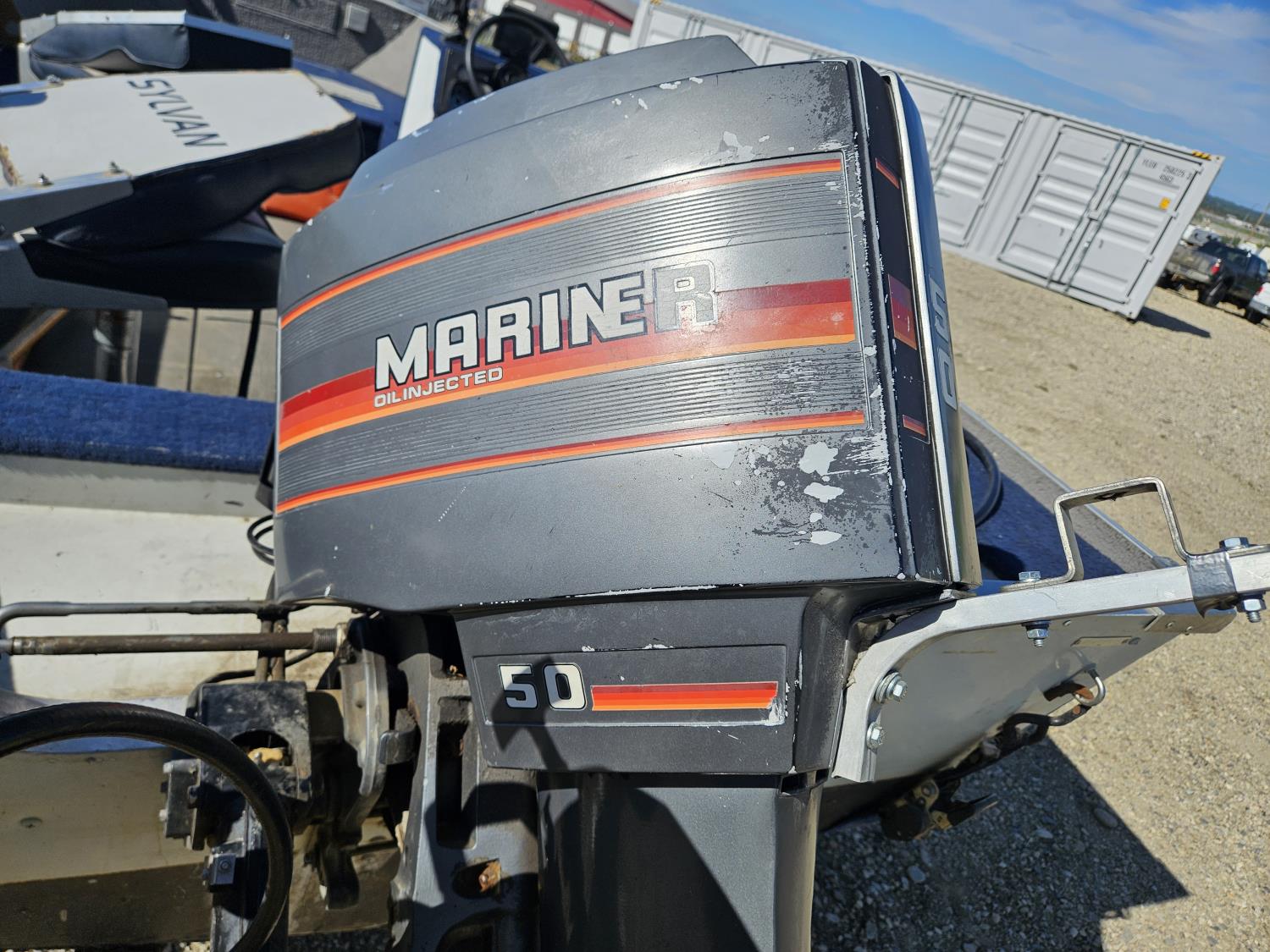 50 HP Mariner outboard motor, 2.5 HP Evinrude trolling motor, hummingbird fish finder, flat bottom, steering wheel, electric start, fuel tanks, boat and motor covers, S/A boat trailer, spring suspension, 175/80R13 tires