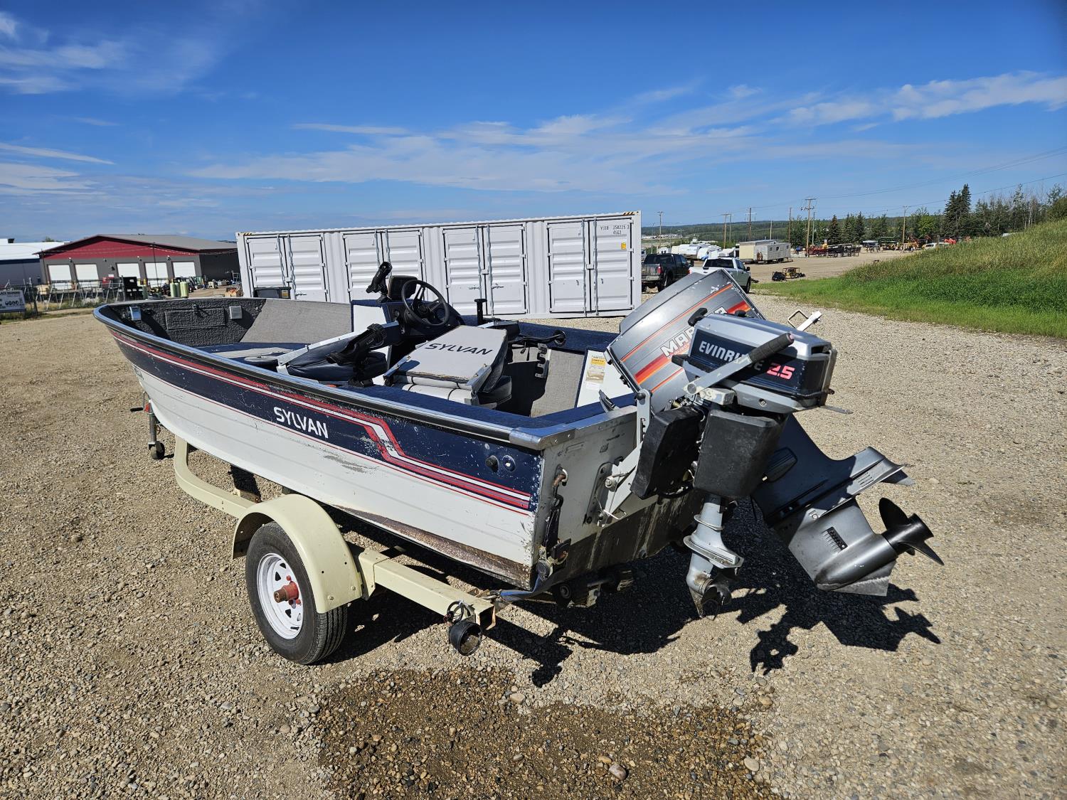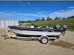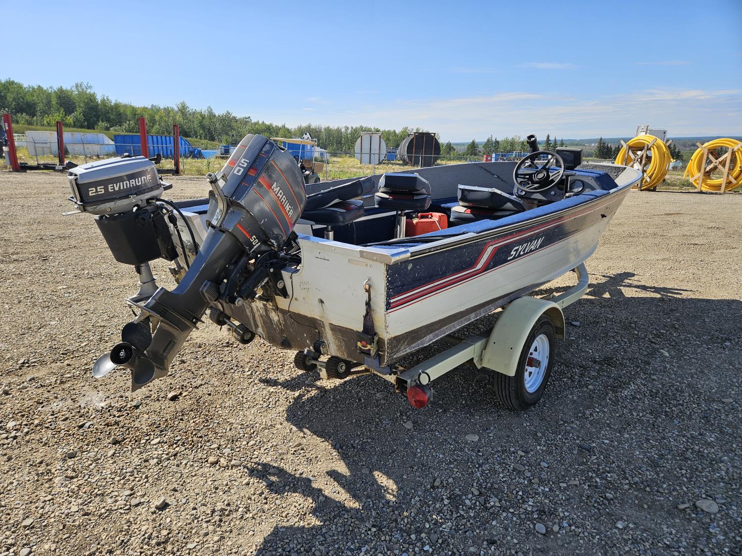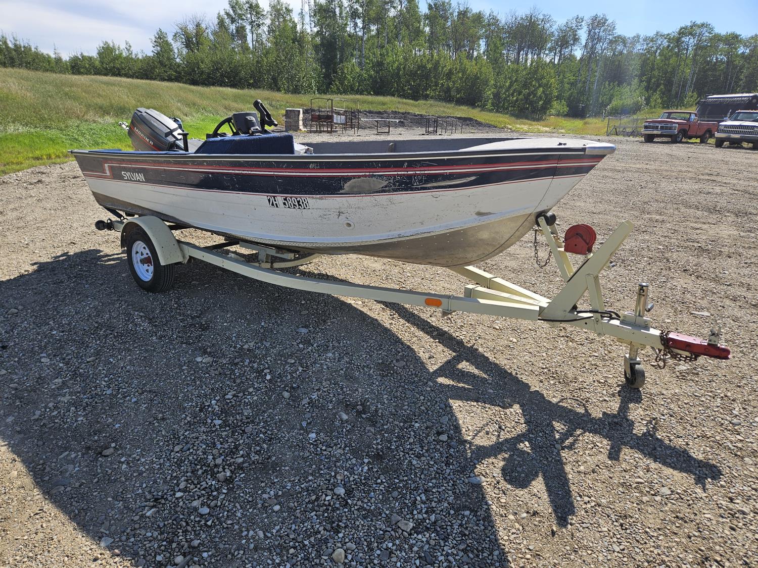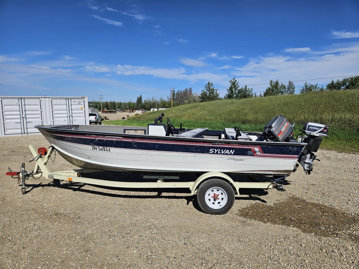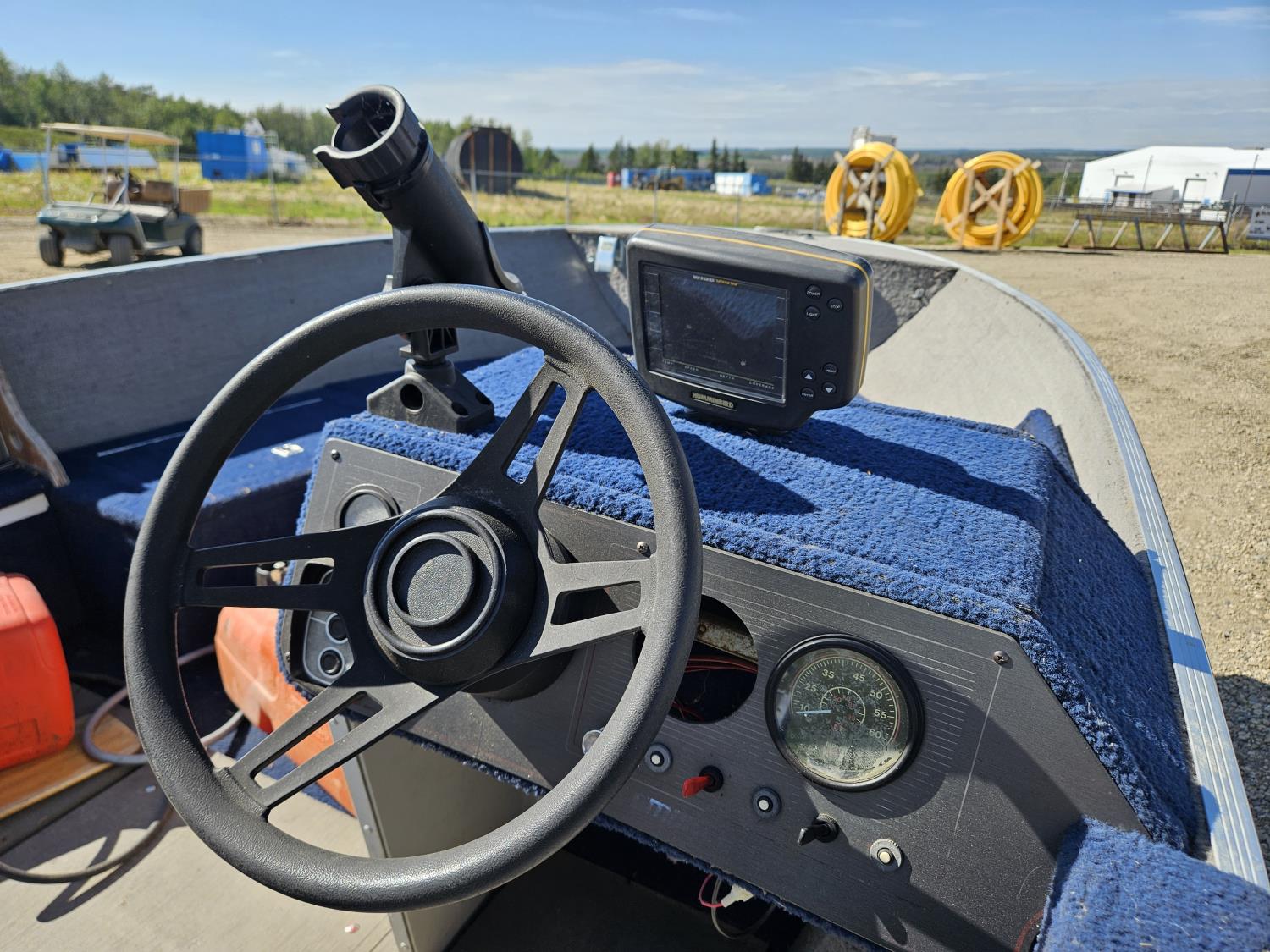 50 HP Mariner outboard motor, 2.5 HP Evinrude trolling motor, hummingbird fish finder, flat bottom, steering wheel, electric start, fuel tanks, boat and motor covers, S/A boat trailer, spring suspension, 175/80R13 tires