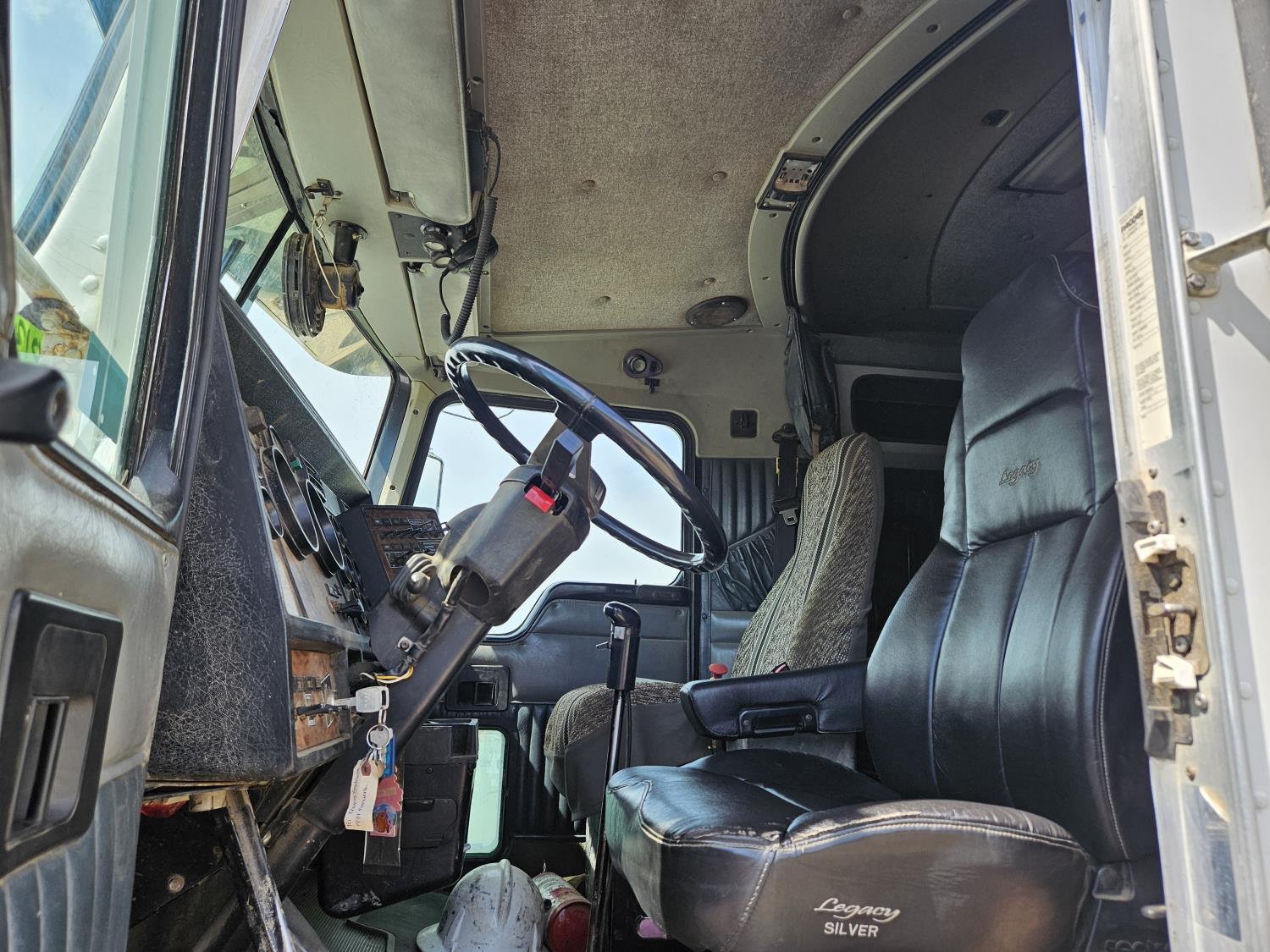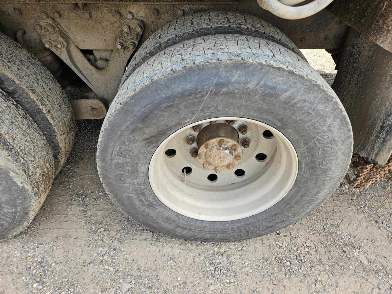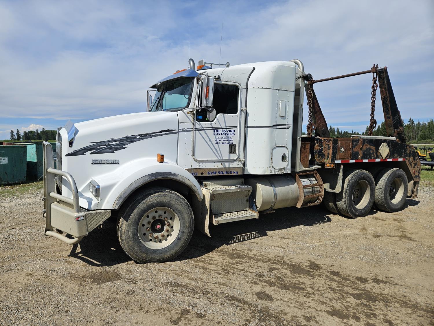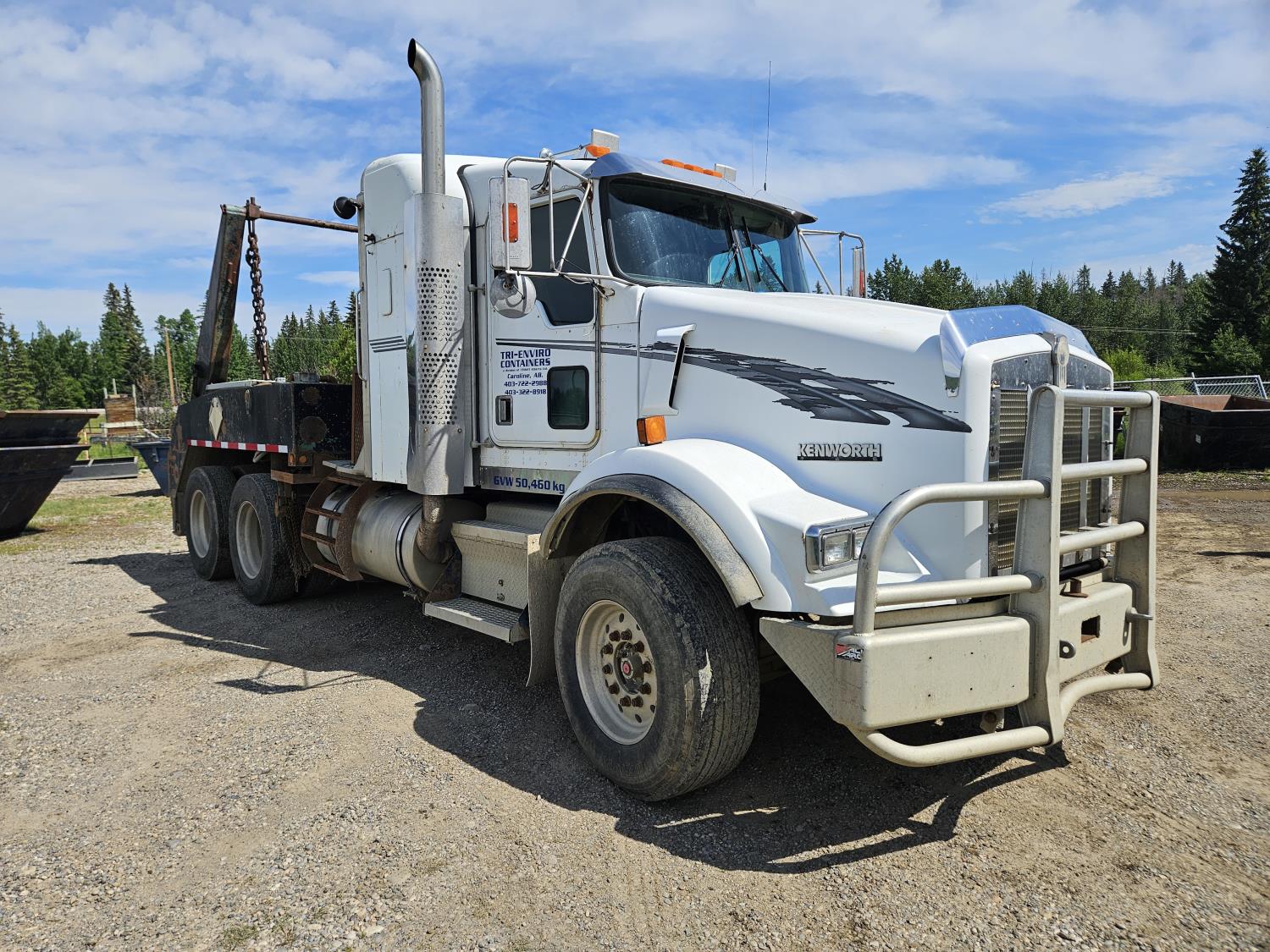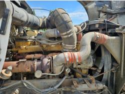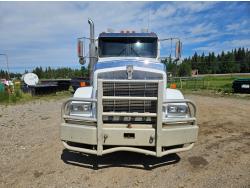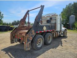 Caterpillar C12 12 L 425 HP engine, engine brake, positive air shutoff, Eaton Fuller 18 speed manual transmission, 38 inch sleeper, A/C, cruise control, leather interior, air ride driver seat, radio, CB radio, stereo, hydraulic wet kit, aluminum moose bumper, aluminum headache rack, tool boxes, chain holders, outriggers, 14,000 lb front axle, 46,000 lb rear axles, full lockers, 8 bag air ride, 8 ft lugger arms, all aluminum wheels, 385/65R22.5 front tires, 11R24.5 rear tires