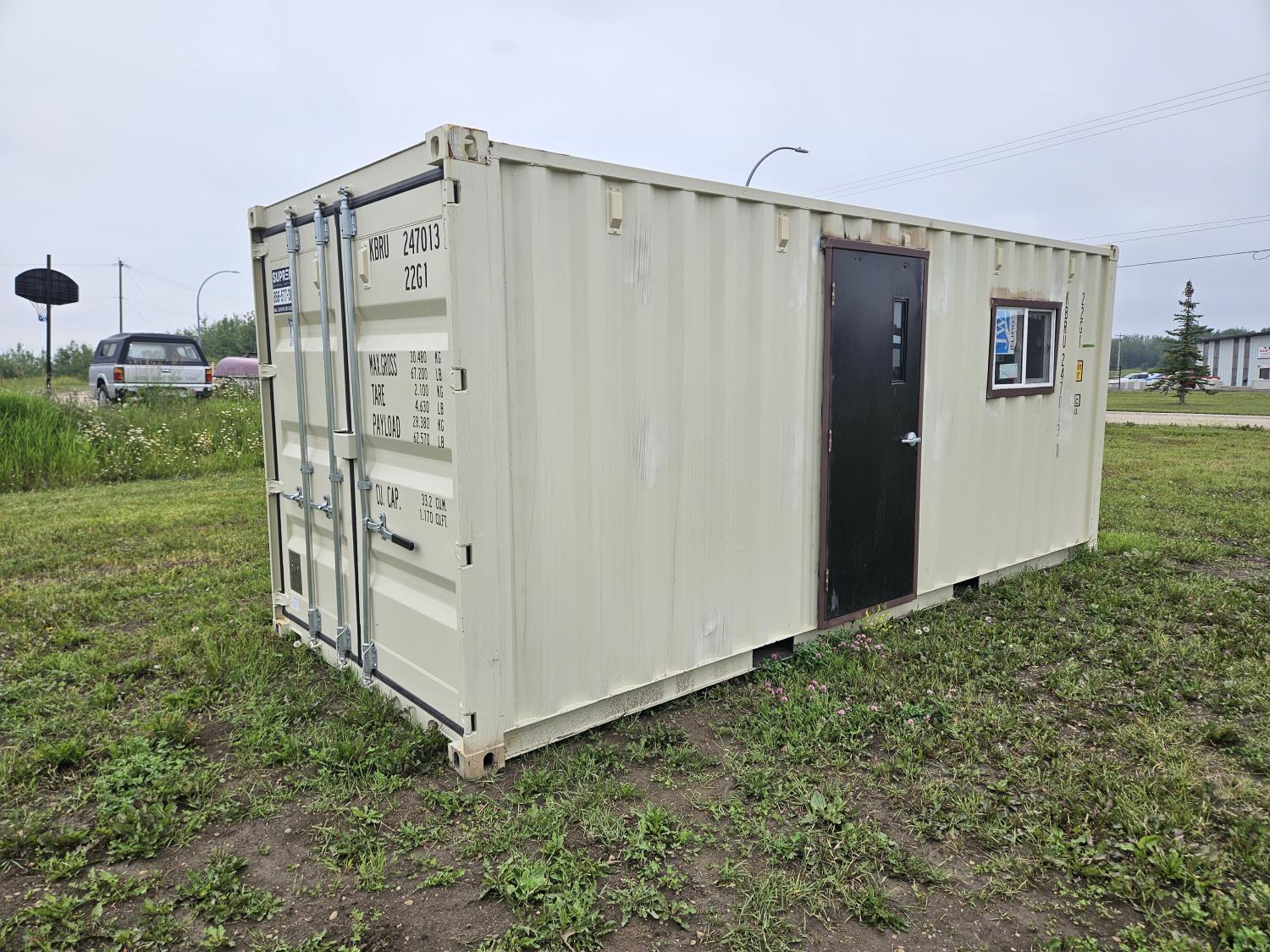 end doors, man door, window, spray foam insulated, wired w/receptacles, breaker panel, wooden work bench