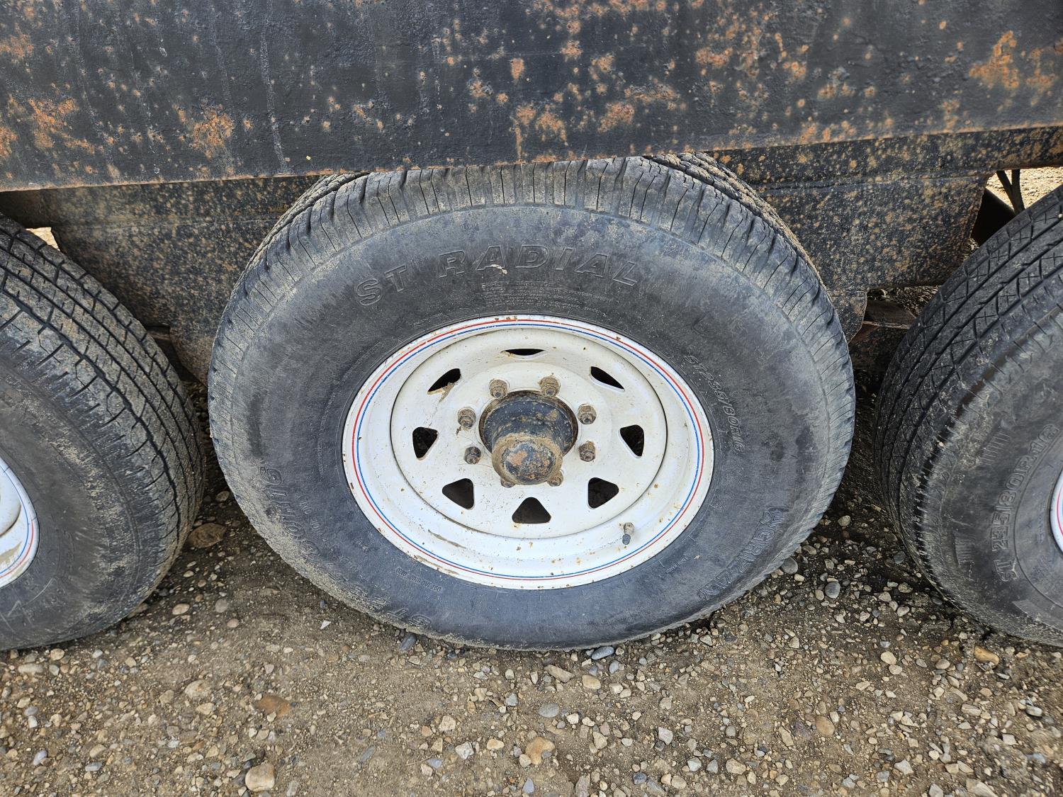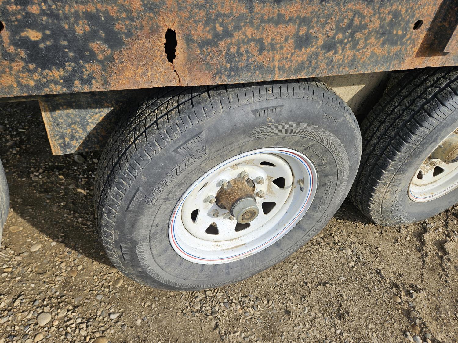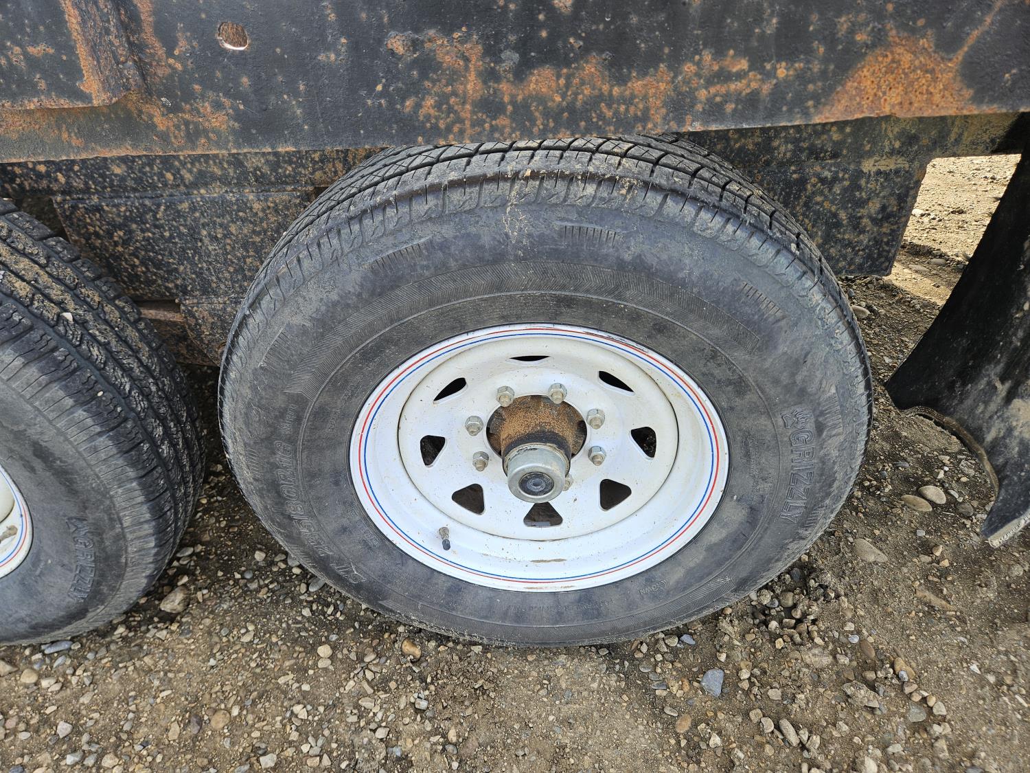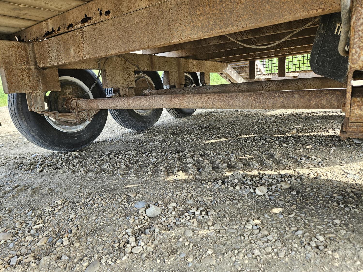 96 inch wide deck, 36 inch beaver tails, wood deck, flip over ramps, spring suspension, rub rails, stake pockets, 235/80R16 tires