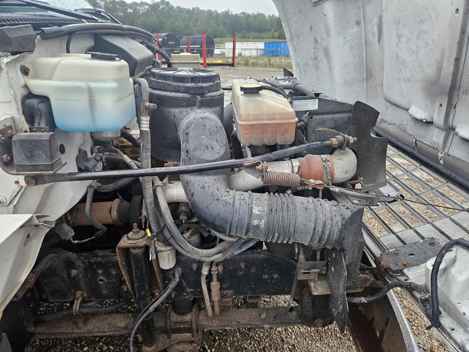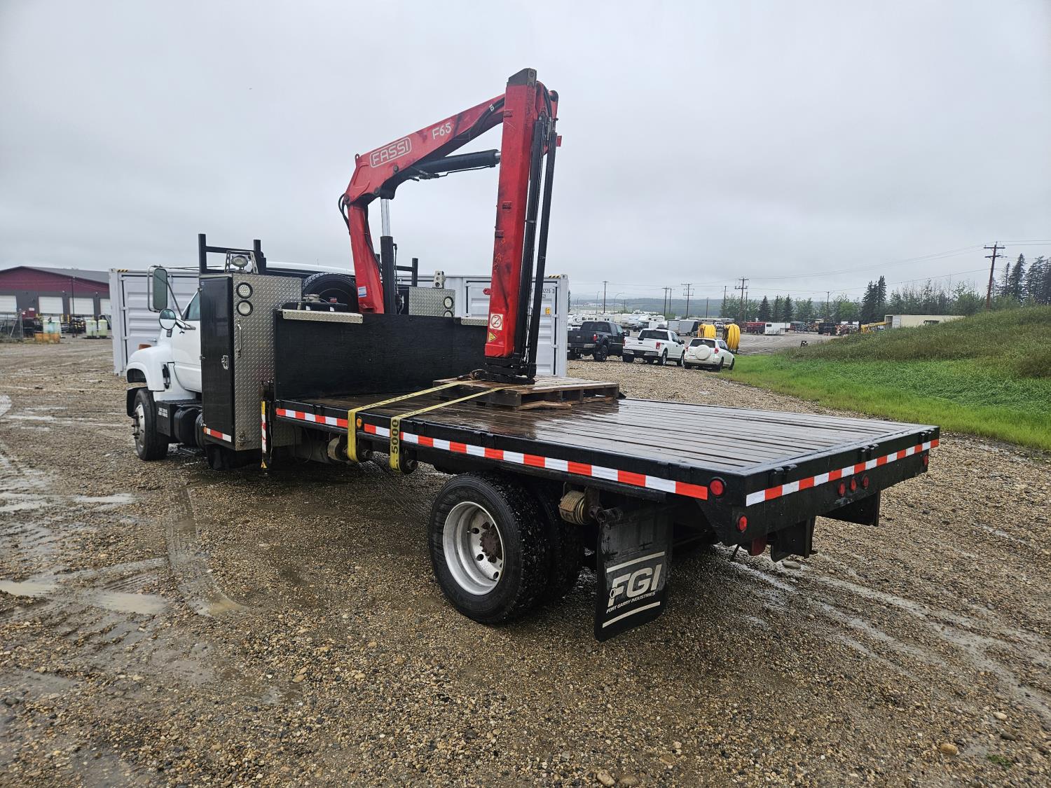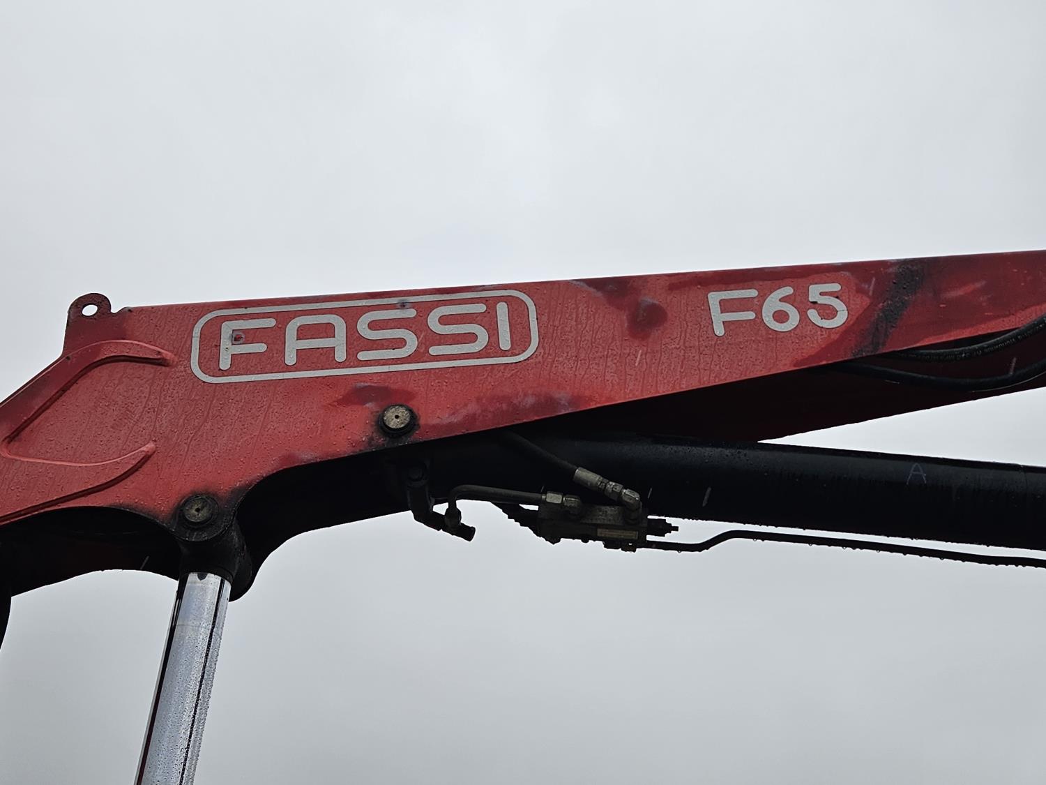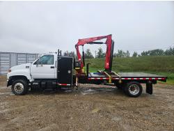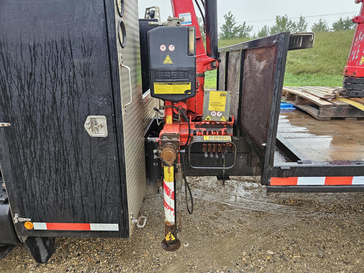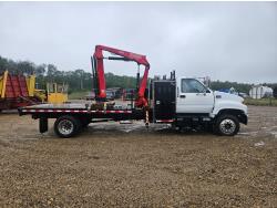 Cat 3126 7.2 L 6 cylinder 210 HP diesel engine, Allison automatic transmission, A/C, hydraulic wet kit, steel tool boxes, 8 ft x 13 ft deck, Fassi F65A.23 3 section 29 ft knuckle crane, outriggers, air ride suspension, hydraulic brakes, cruise control not working, all aluminum wheels, 245/70R19.5 tires