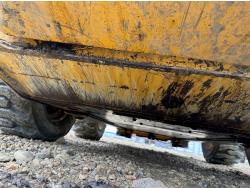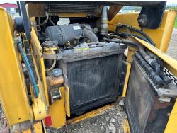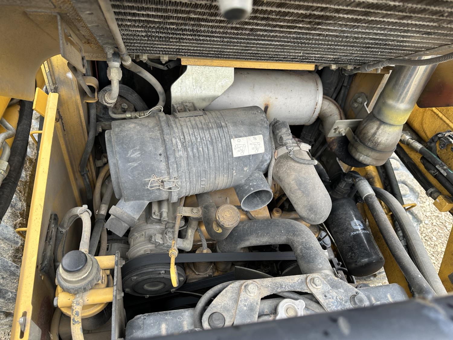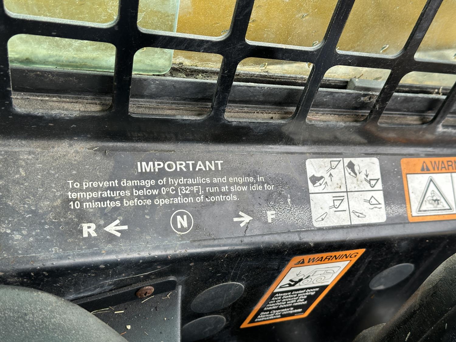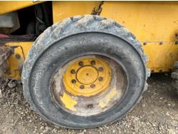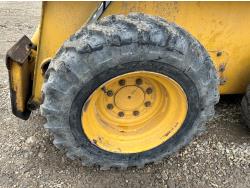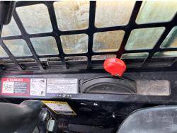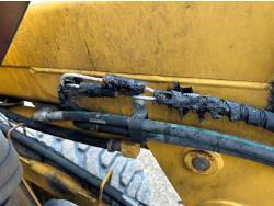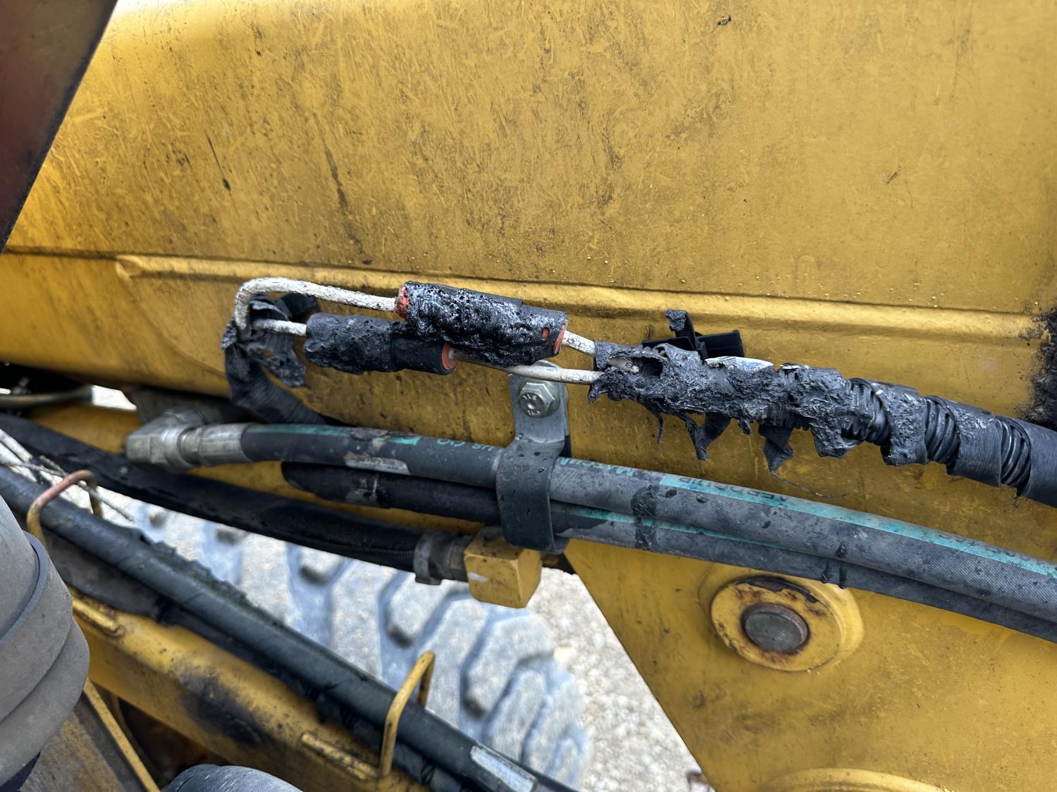 Enclosed cab, A/C, diesel engine, foot & lever control, cab screens, hydraulic Q/C coupler, counter weight, has some fire damage, 10-16.5 tires