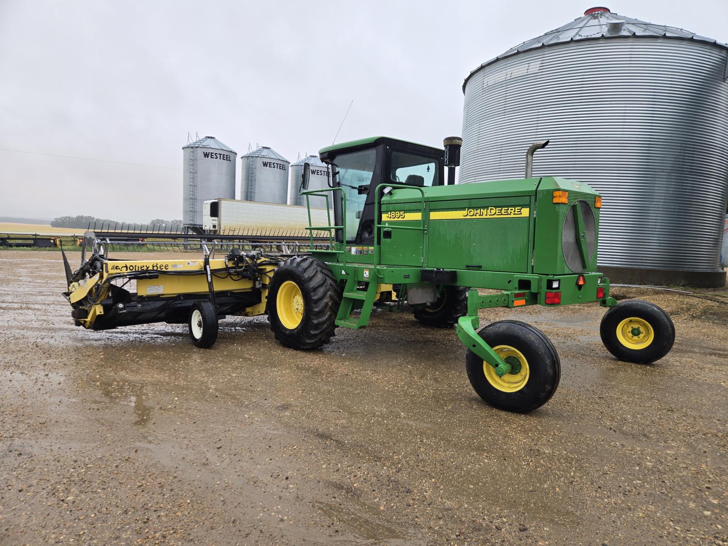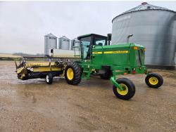 Honey Bee WS25 triple delivery rigid draper header, pickup reel, fore & aft, Roto Shear on both ends crop dividers, factory built in transport header transport, John Deere 4 cylinder diesel engine, A/C, buddy seat, 18.4-26 front tires, 14L-16.1 rear tires