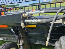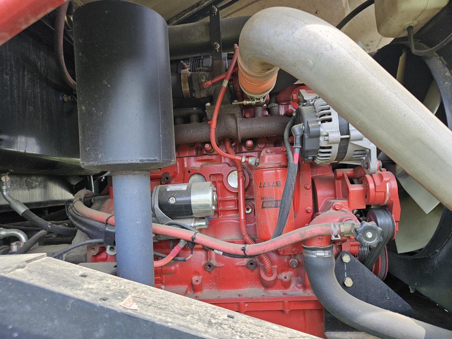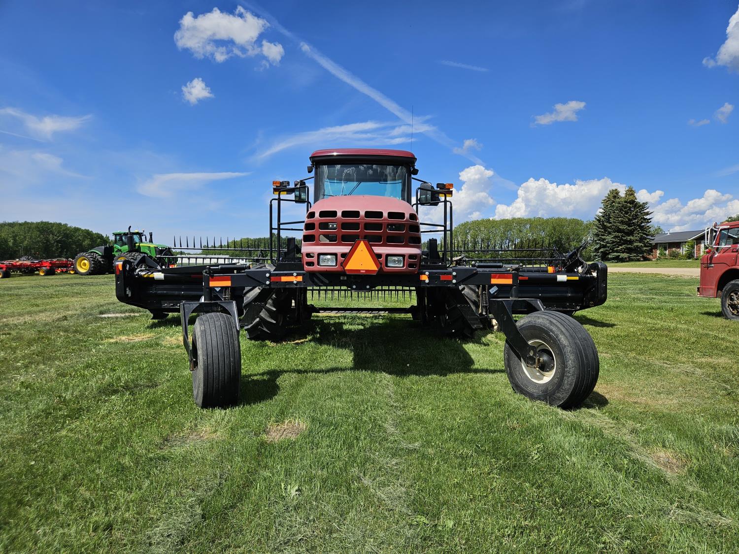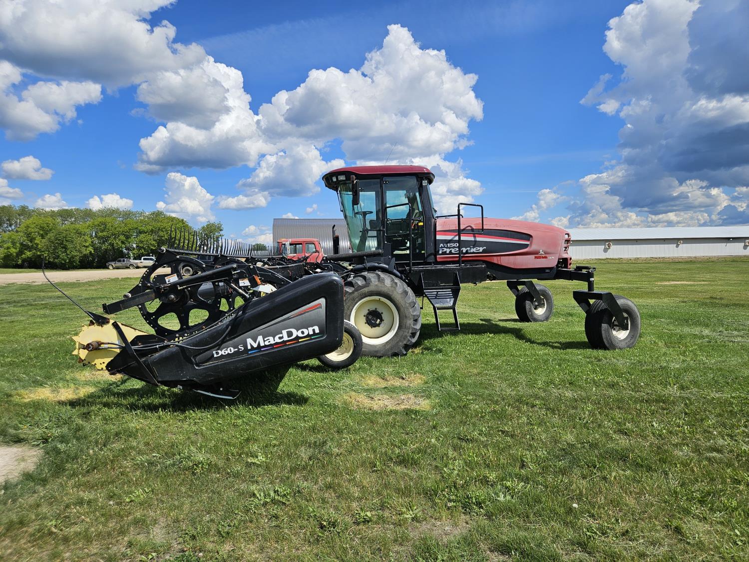 2010 MacDon D60-S triple delivery rigid draper header, pickup reel, double knife drive, fore & aft, gauge wheels, skid plates, crop dividers, Cummins 4.5 L 4 cylinder diesel engine, A/C, radio, air ride seat, buddy seat, 600/65R28 front tires, 16.5L-16.1 rear tires