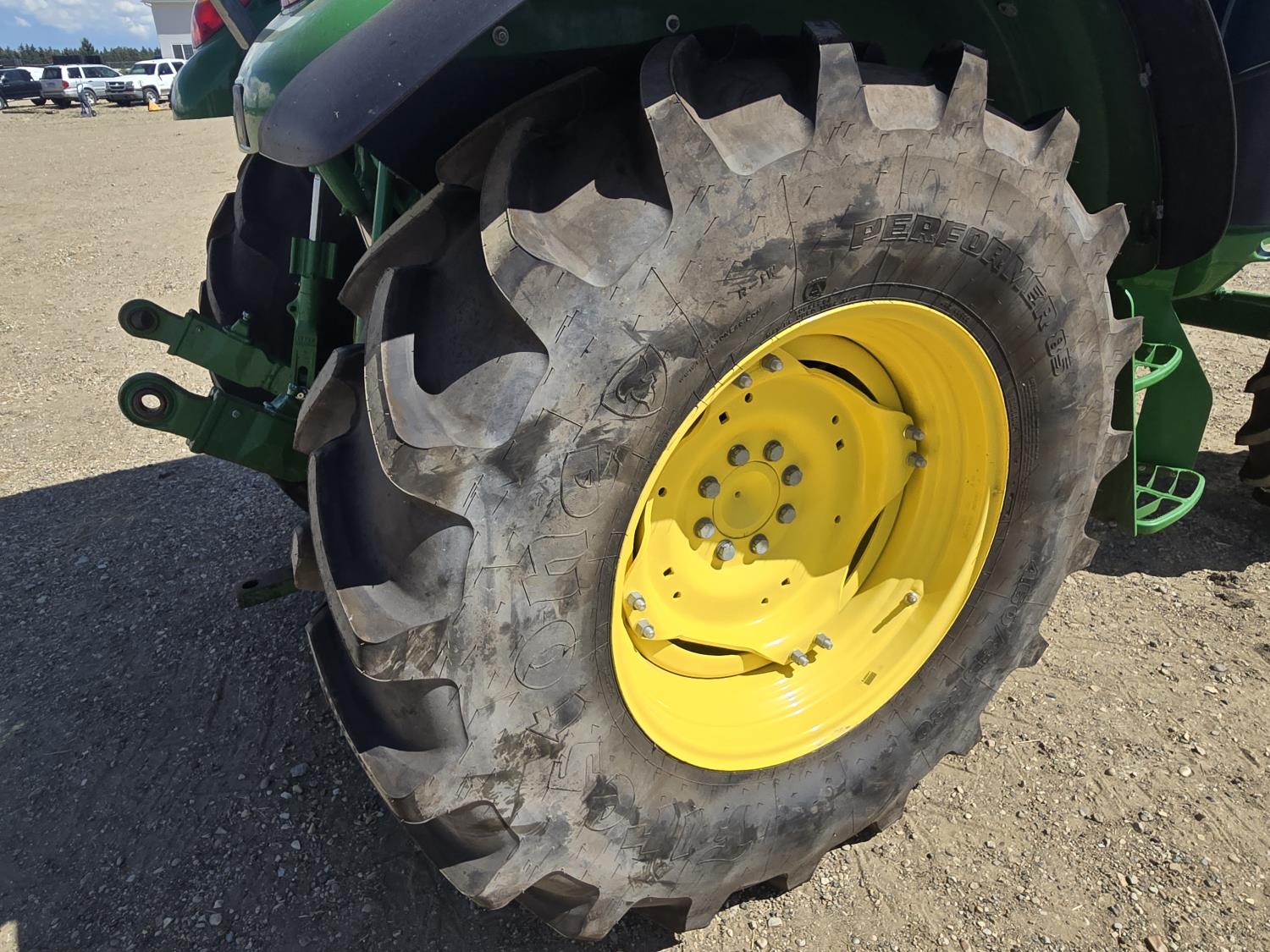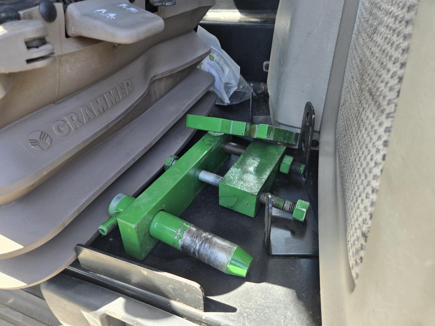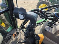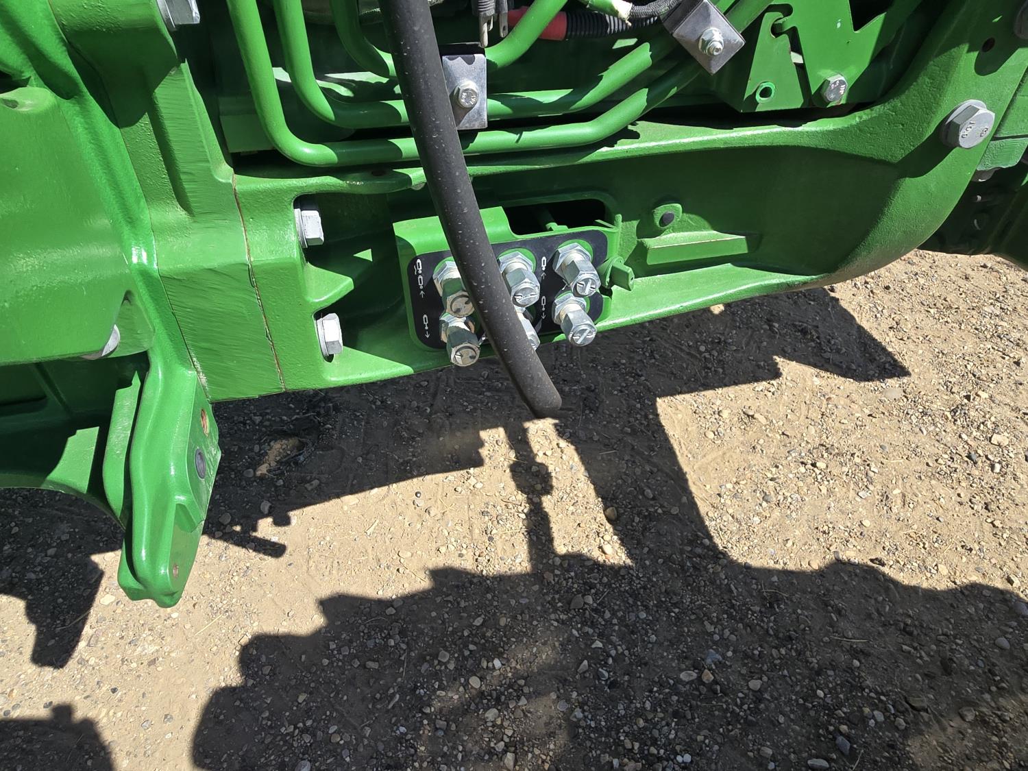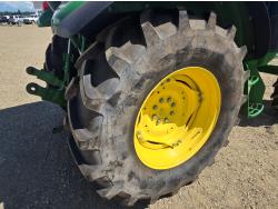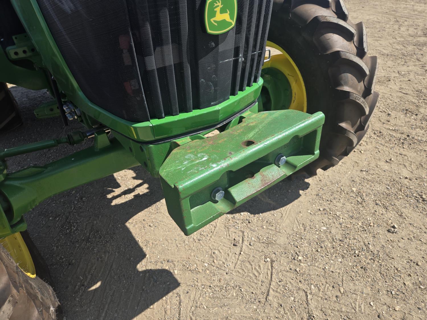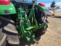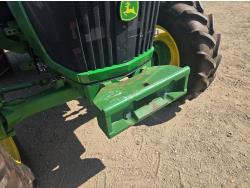 John Deere 4.5 4 cylinder 90 HP, diesel engine, 32 speed partial power shift transmission, cab, left hand reverser, rear differential lock, A/C, radio, ATV steering wheel installed, 540E / 540/1000 PTO, 3 point hitch, 3 point hitch exterior control, 3 rear hydraulic outlets, front weight bracket, joystick, (3) mid hydraulics, loader ready, 320/85R24 front tires, 460/85R30 rear tires