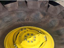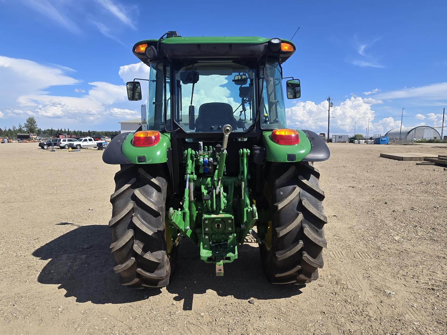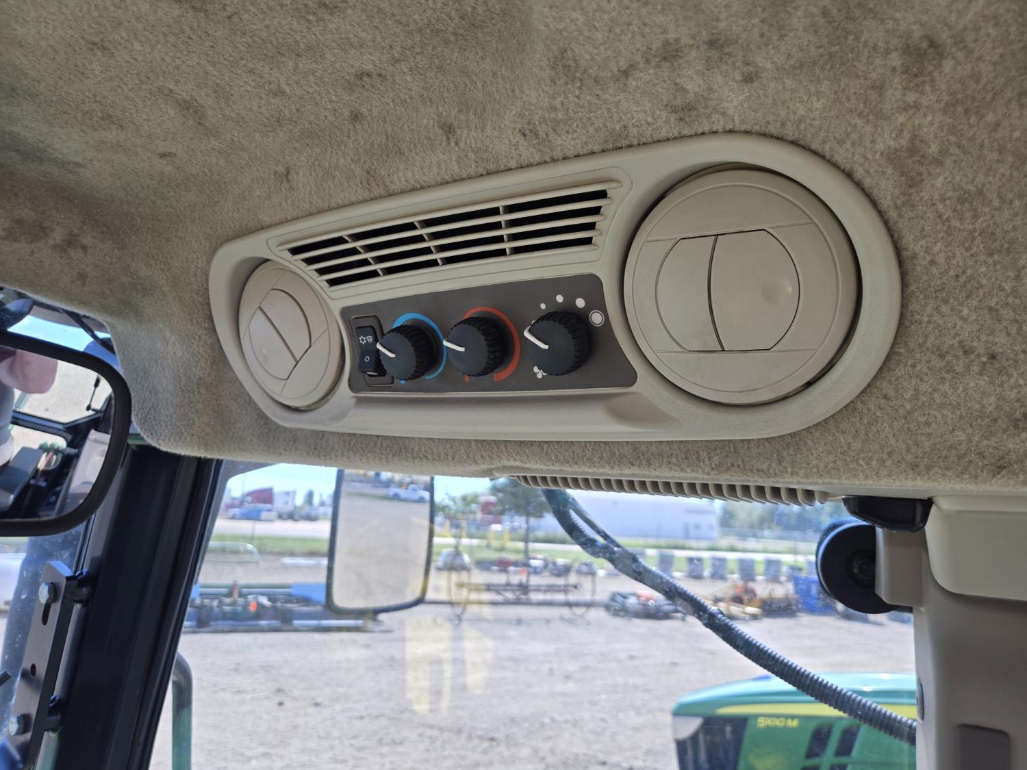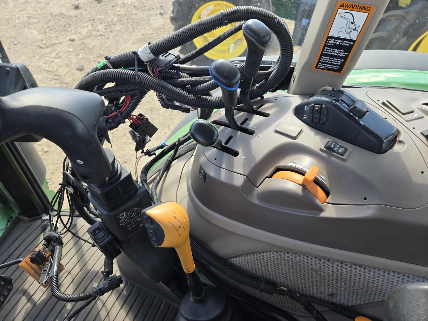 John Deere 4.5 4 cylinder 90 HP, diesel engine, 32 speed partial power shift transmission, cab, left hand reverser, rear differential lock, A/C, radio, ATV steering wheel installed, 540E / 540/1000 PTO, 3 point hitch, 3 point hitch exterior control, 3 rear hydraulic outlets, front weight bracket, joystick, (3) mid hydraulics, loader ready, 320/85R24 front tires, 460/85R30 rear tires