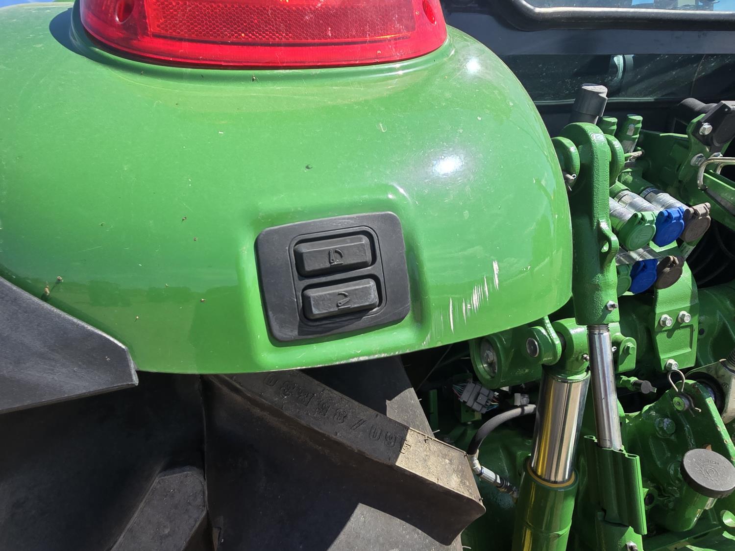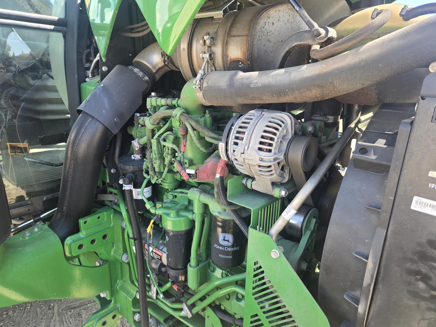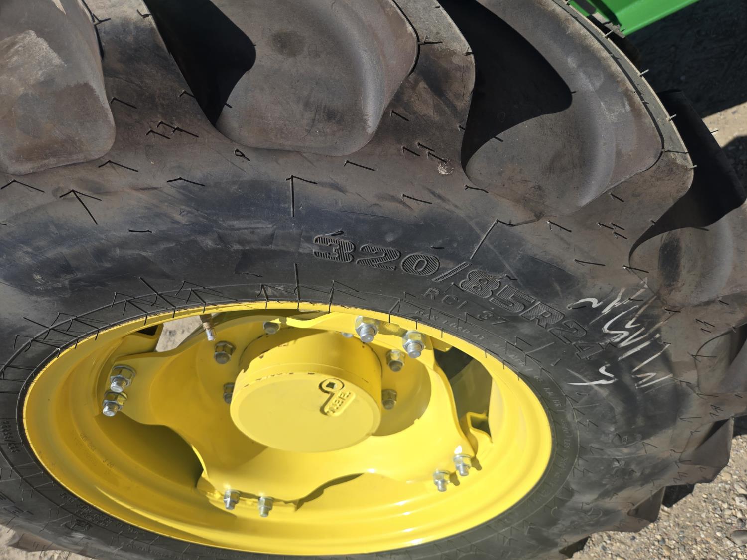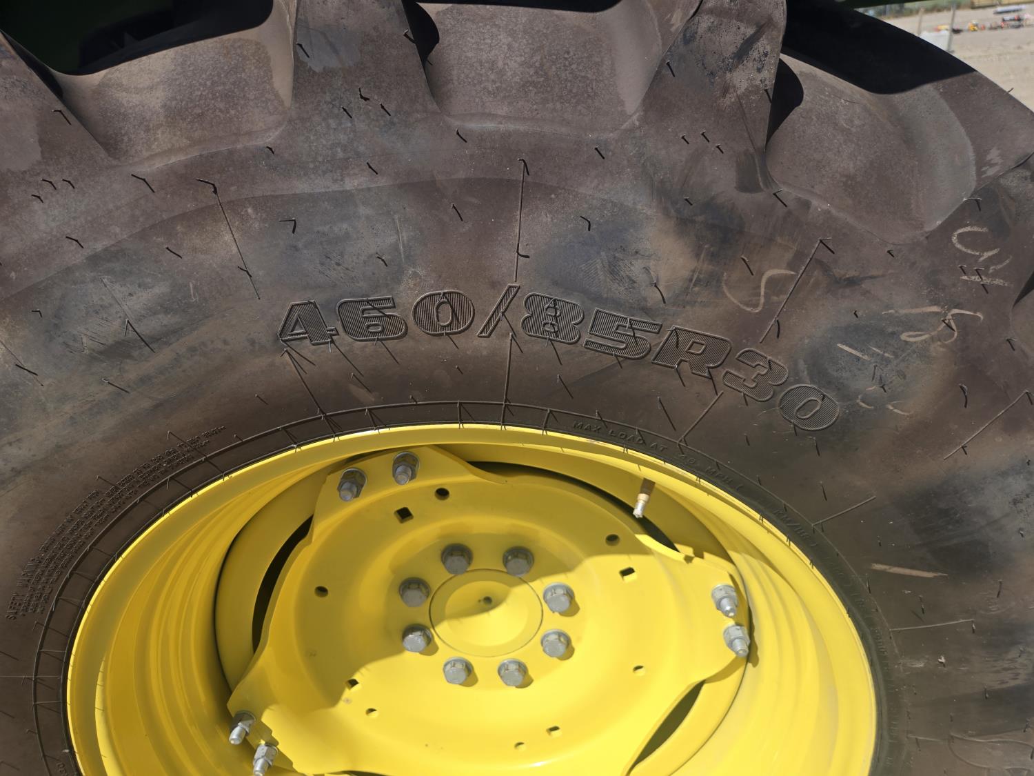 John Deere 4.5 4 cylinder 90 HP, diesel engine, 32 speed partial power shift transmission, cab, left hand reverser, rear differential lock, A/C, radio, ATV steering wheel installed, 540E / 540/1000 PTO, 3 point hitch, 3 point hitch exterior control, 3 rear hydraulic outlets, front weight bracket, joystick, (3) mid hydraulics, loader ready, 320/85R24 front tires, 460/85R30 rear tires