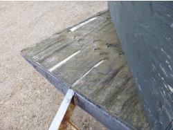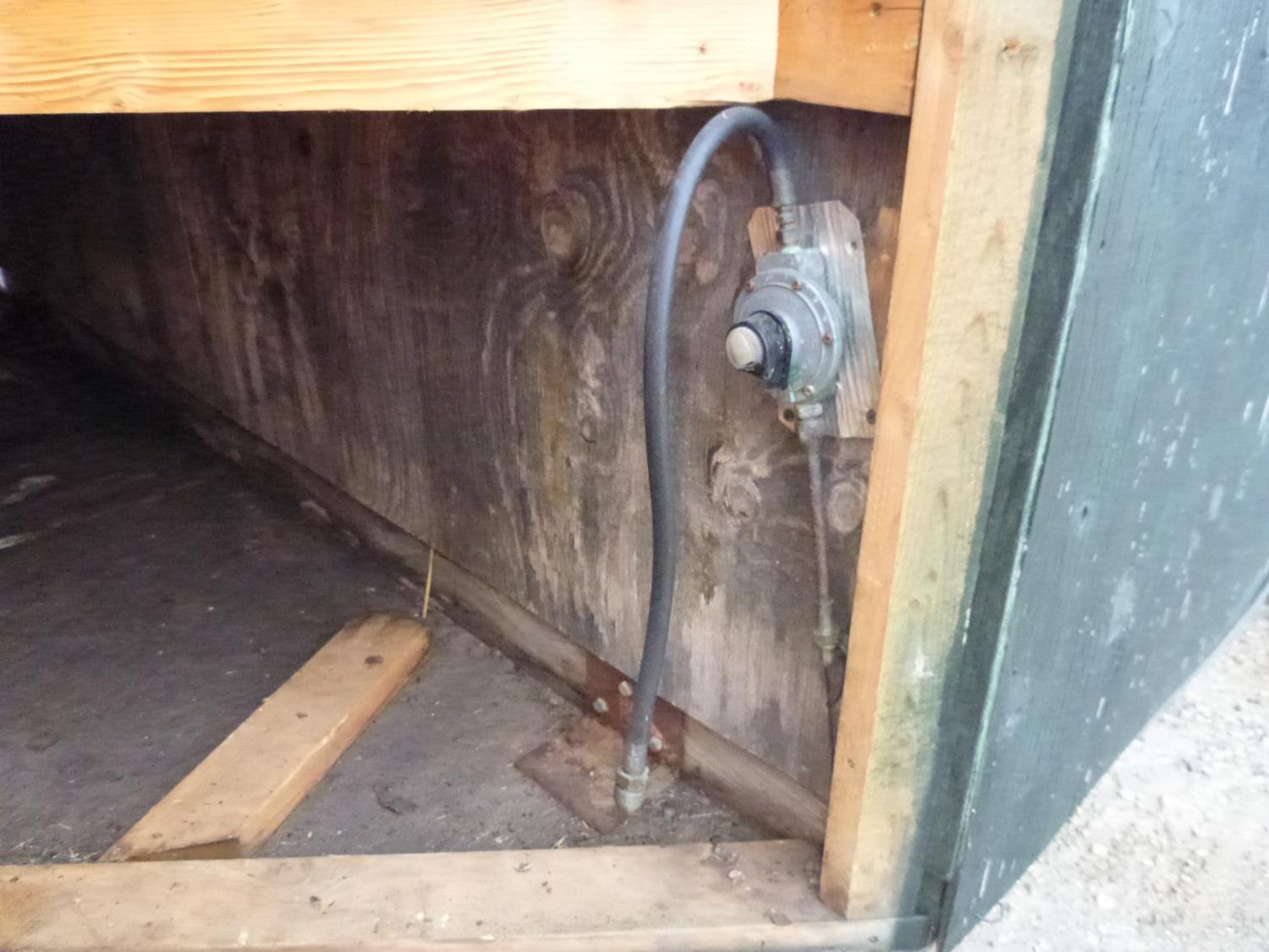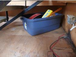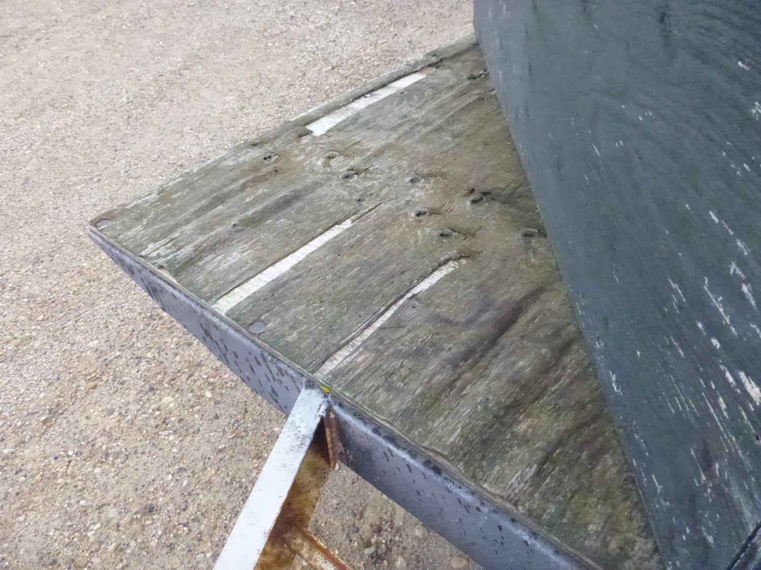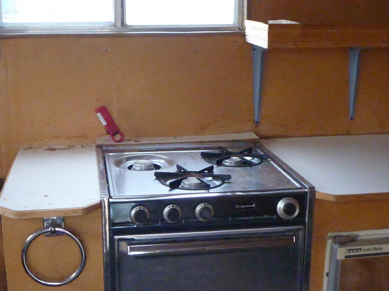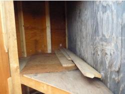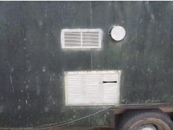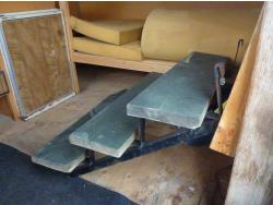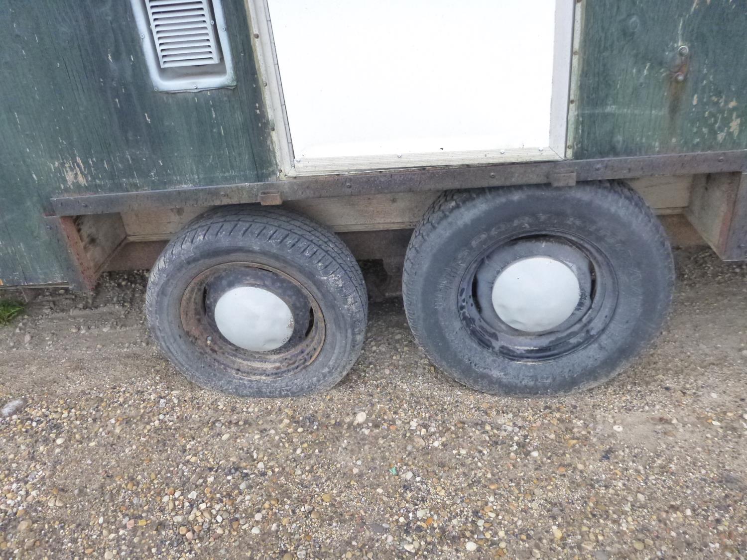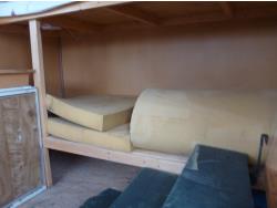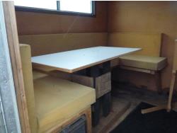 bunkbeds, stove, fridge, table, 4 ft deck on rear, mixed tires, front storage, spring suspension, water damage