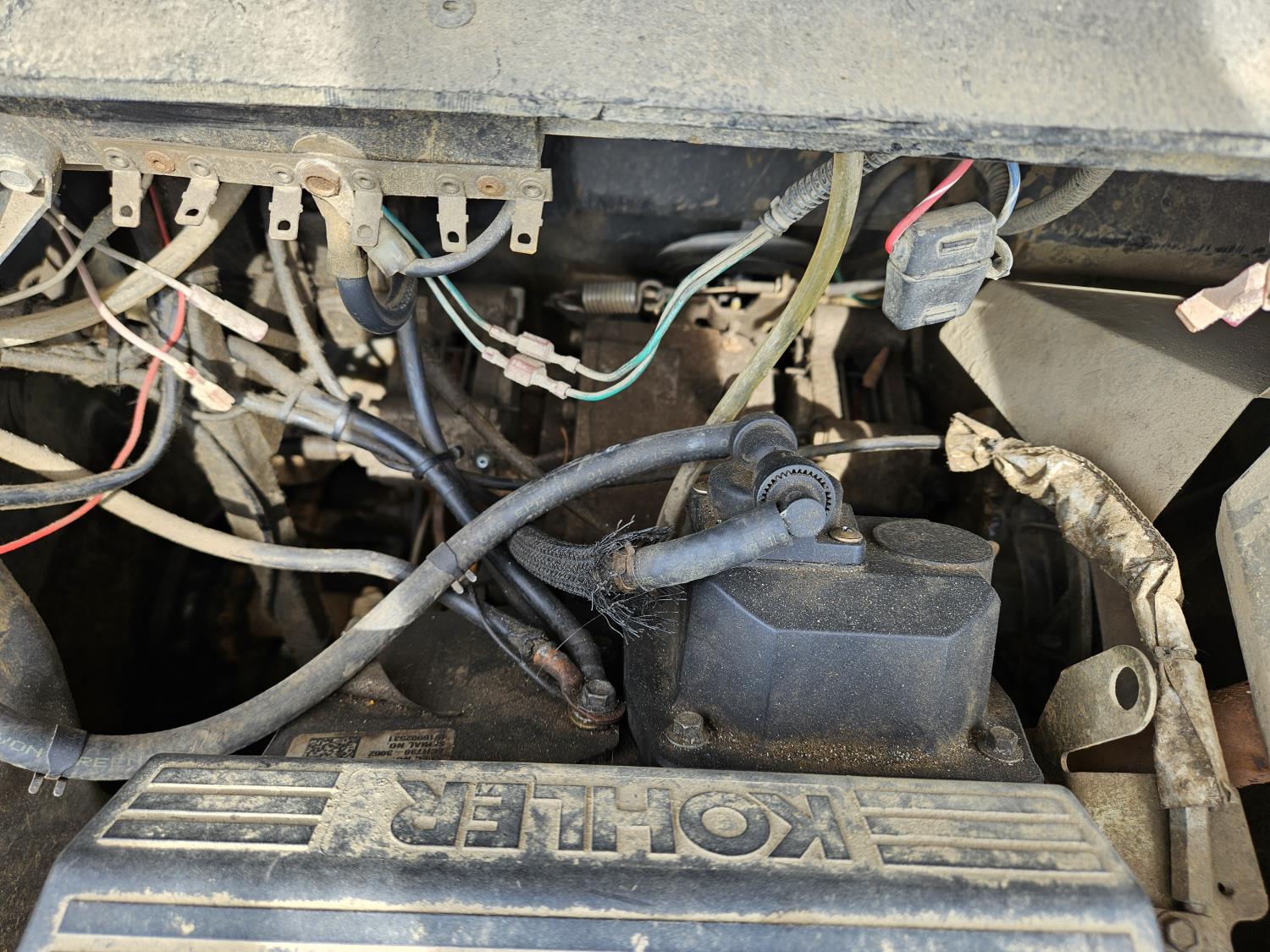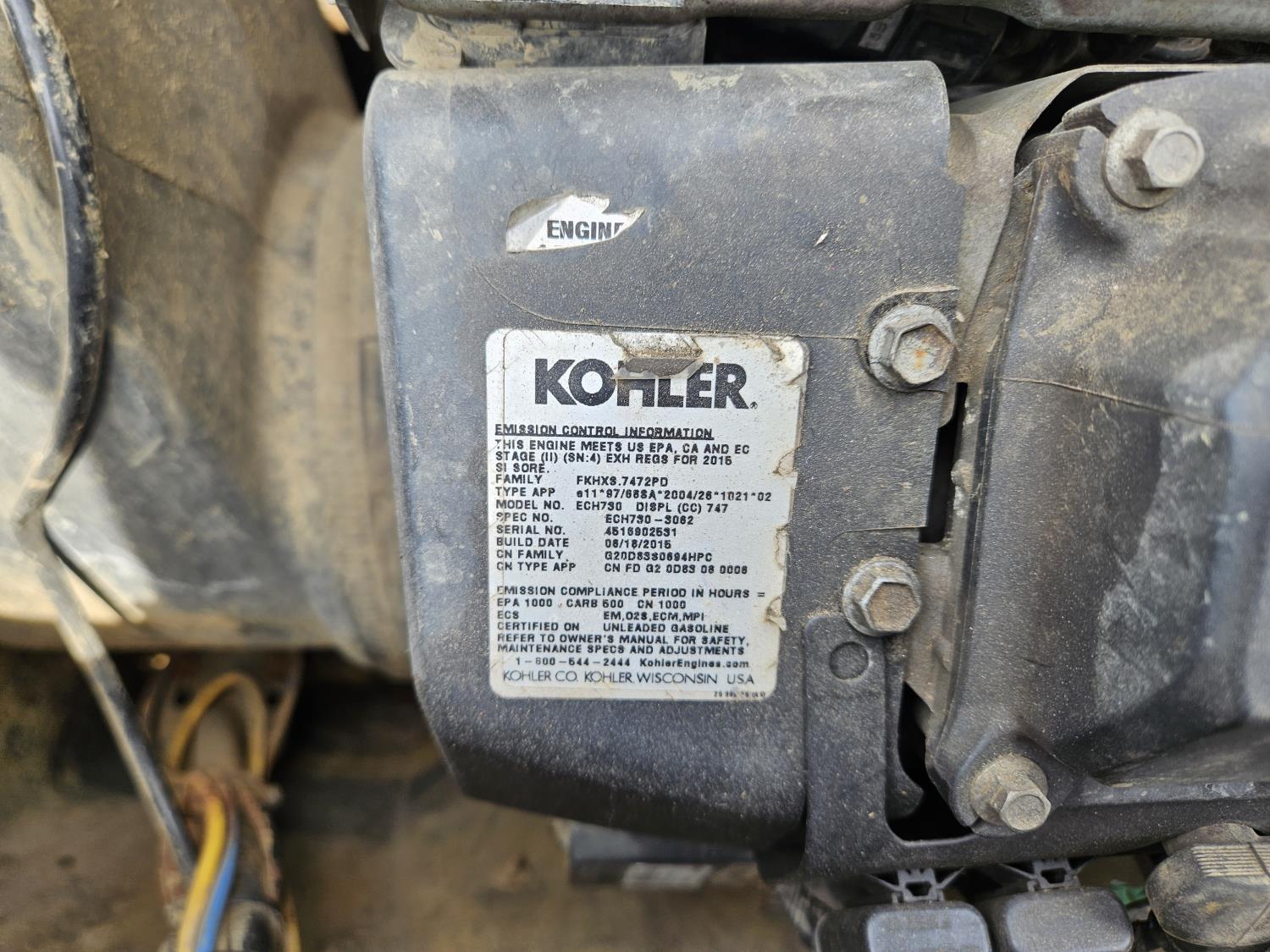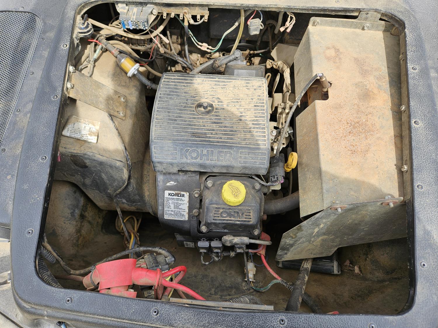 23 HP Kohler engine, variable speed drive transmission, digital display, front mount winch, turns over but will not stay running, 24x10.00-8 tires