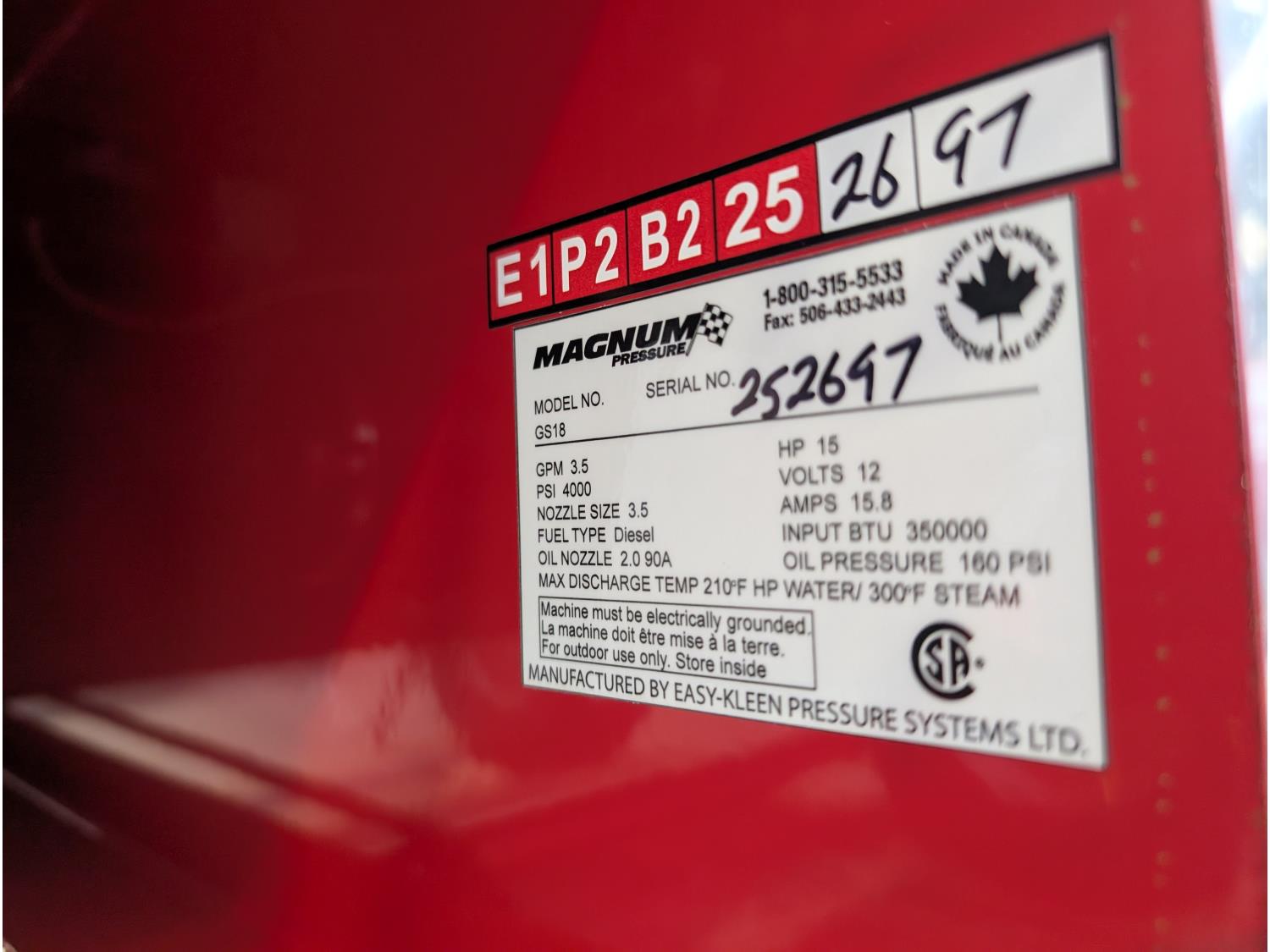 3.5 GPM at 4000 PSI, 15 HP, gasoline engine, electric start, 12 volt burner, oil/diesel fired burned/thermostat, schedule 80 coil with stainless steel housing, fully welded, powder coated frame, 10 gallon poly fuel tank, 30' hose and wand