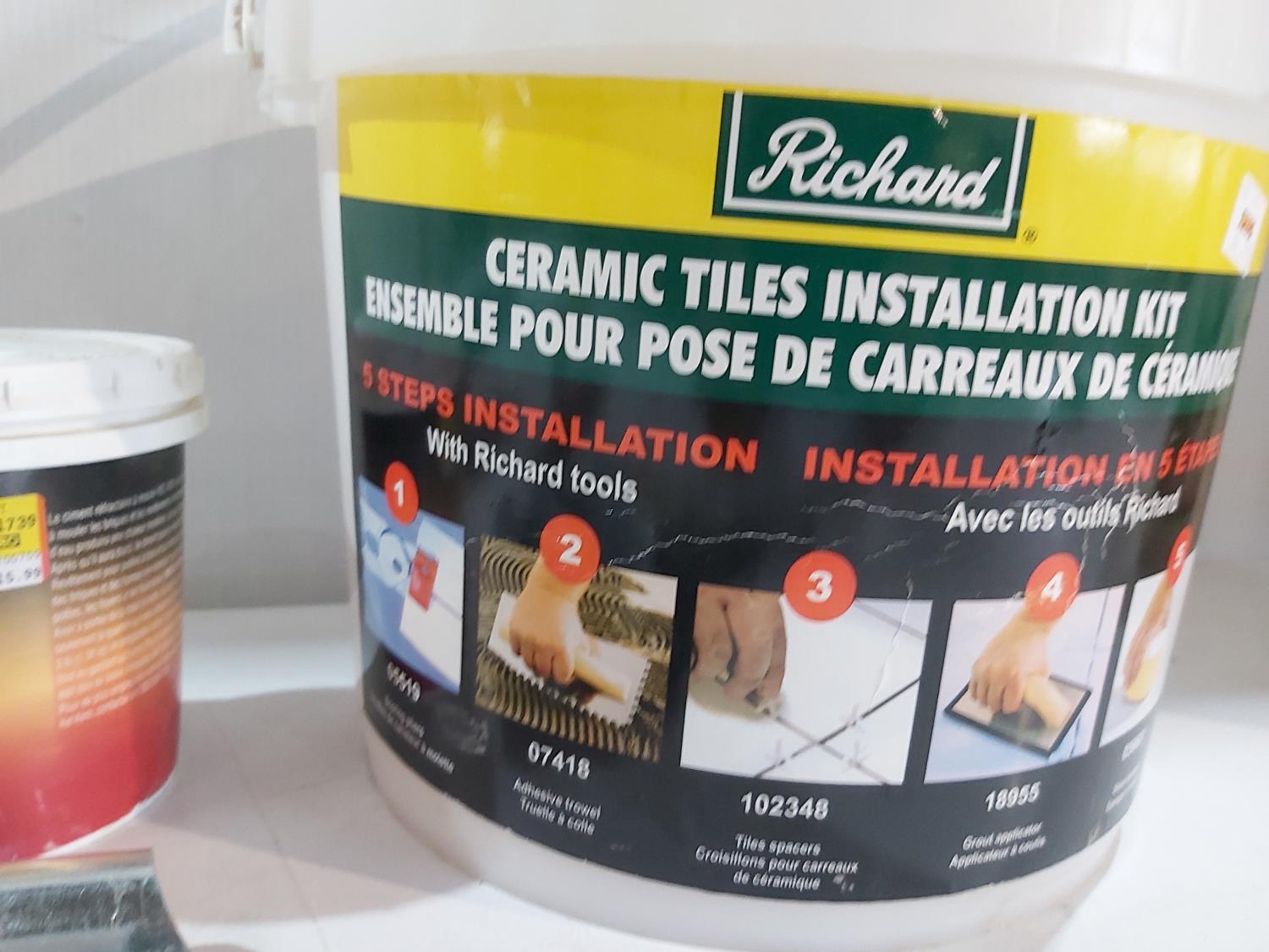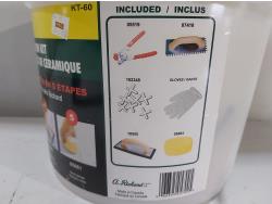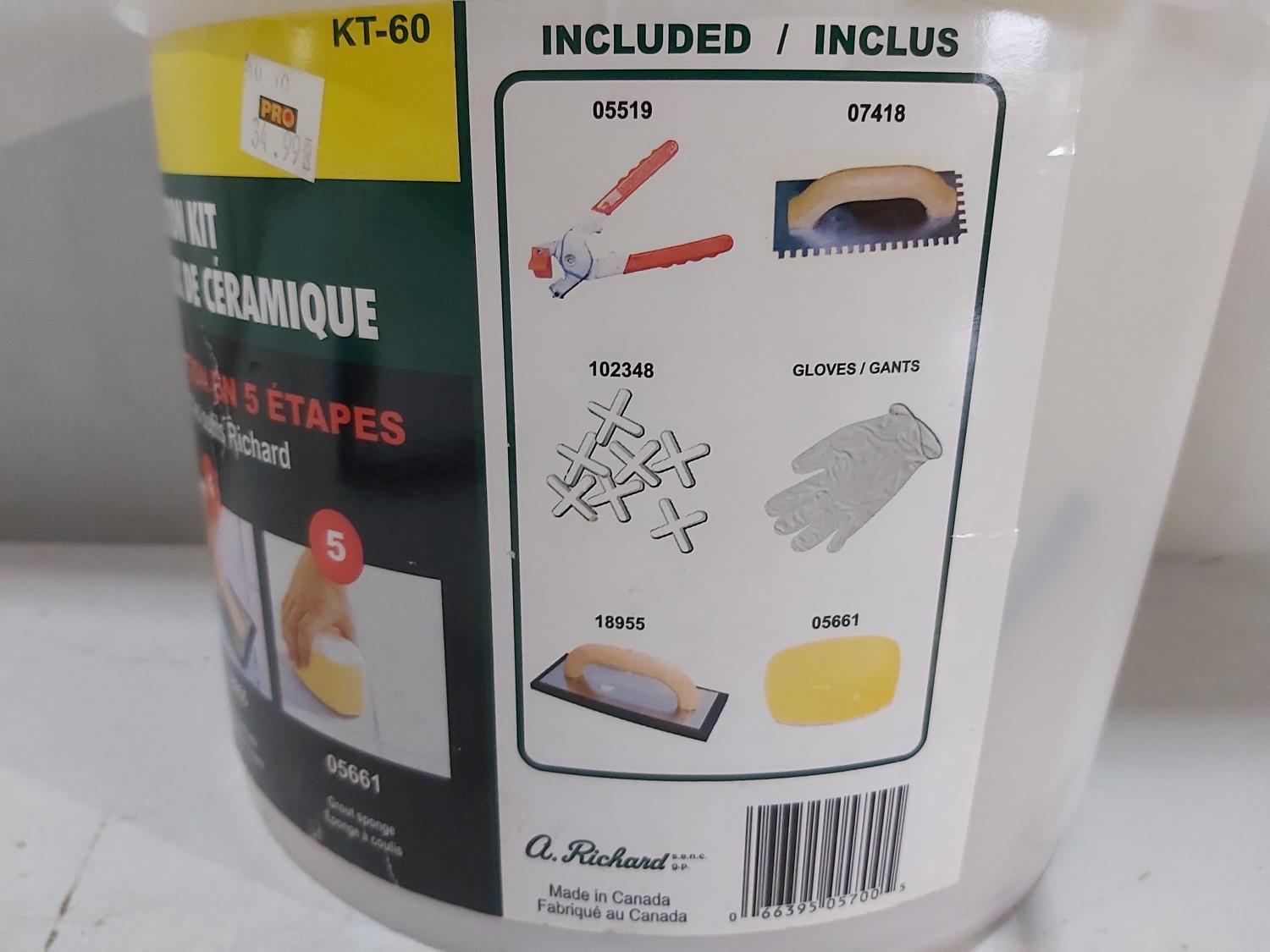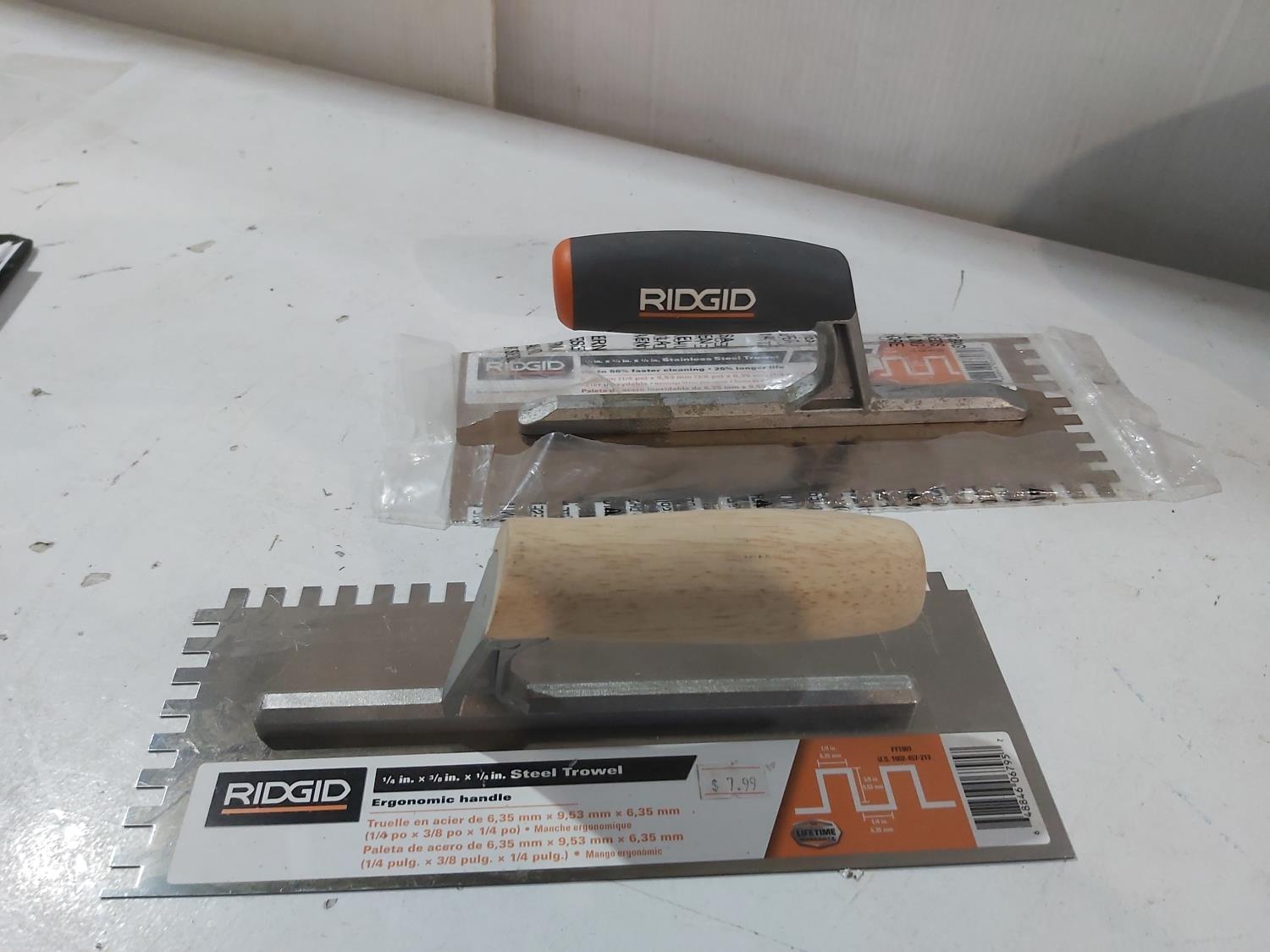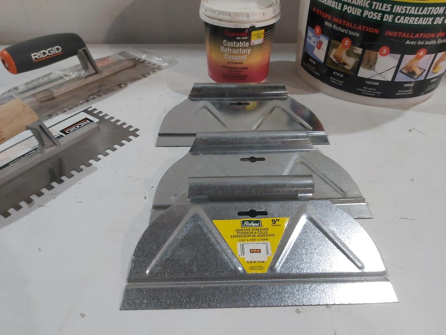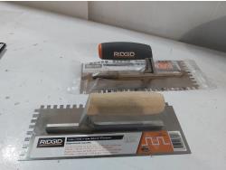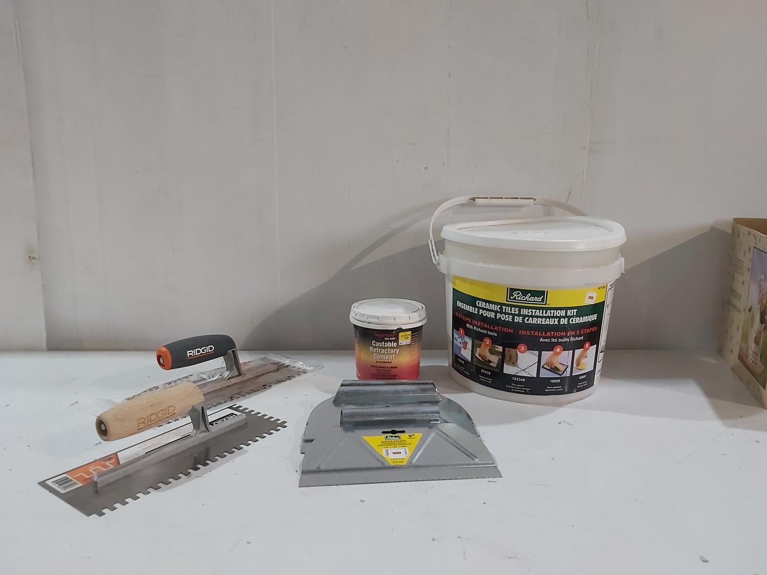 1143 (2) Ridgid Steel Trowels, Richard Ceramic Tile Kit, (3) 9 Inch Adhesive Spreaders and Cement (Unused)