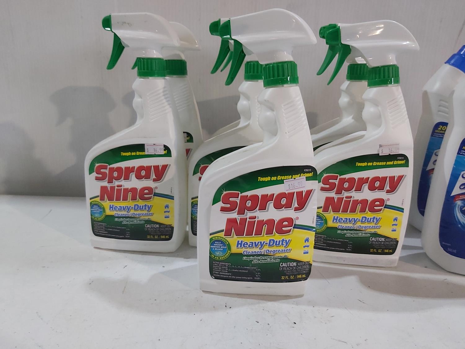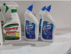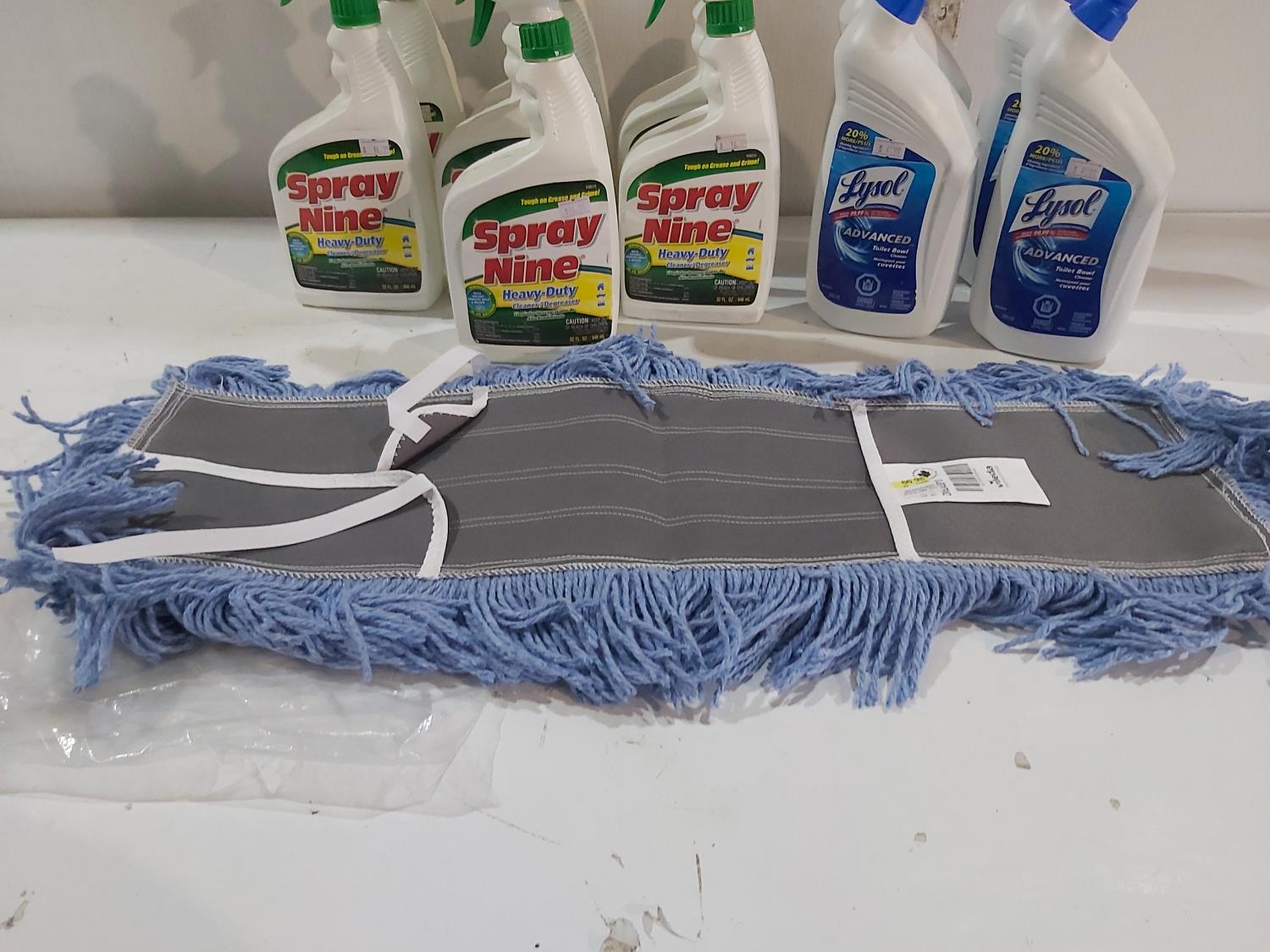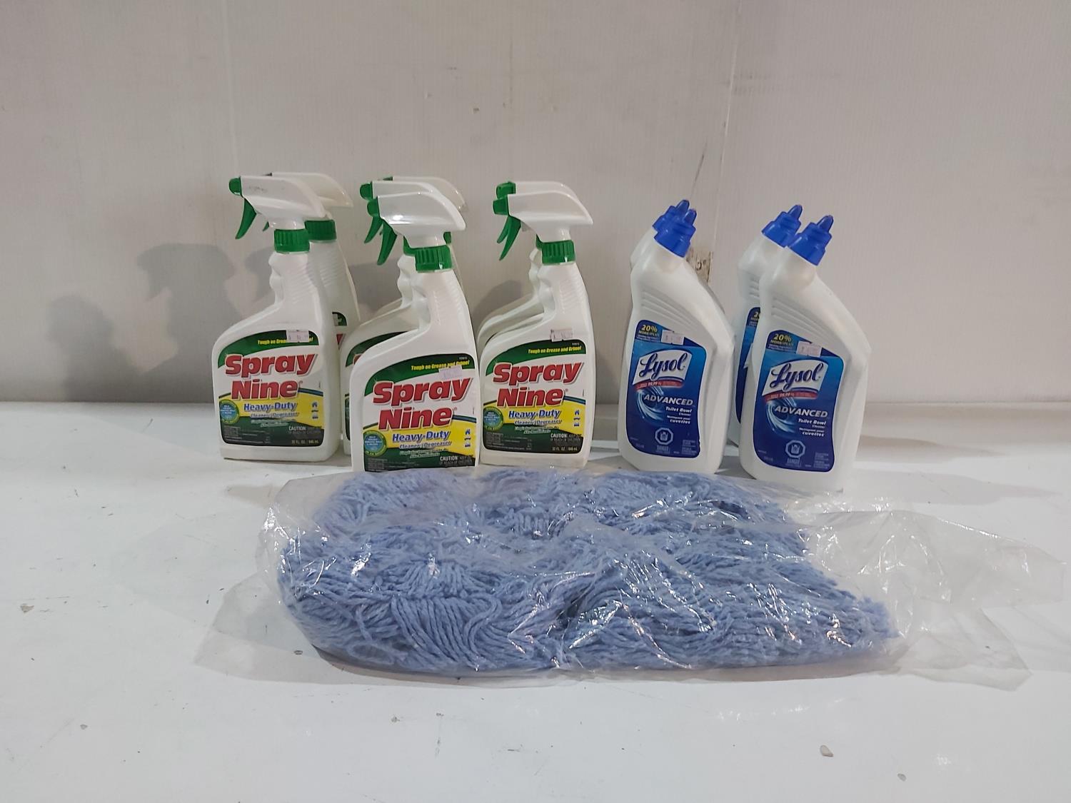 1234 (4) 946 Ml Bottles of Lysol Toilet Cleaner, (7) 946 Ml Bottles of Spray Nine and Mop Head (Unused)