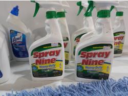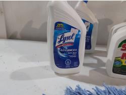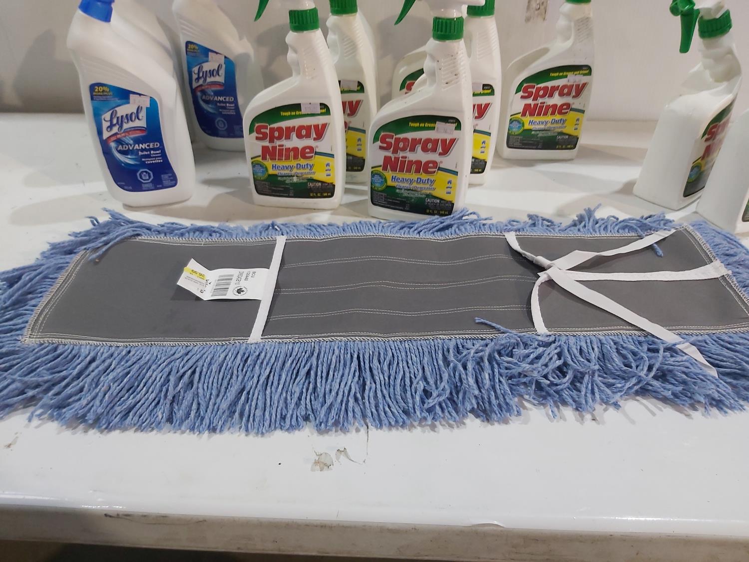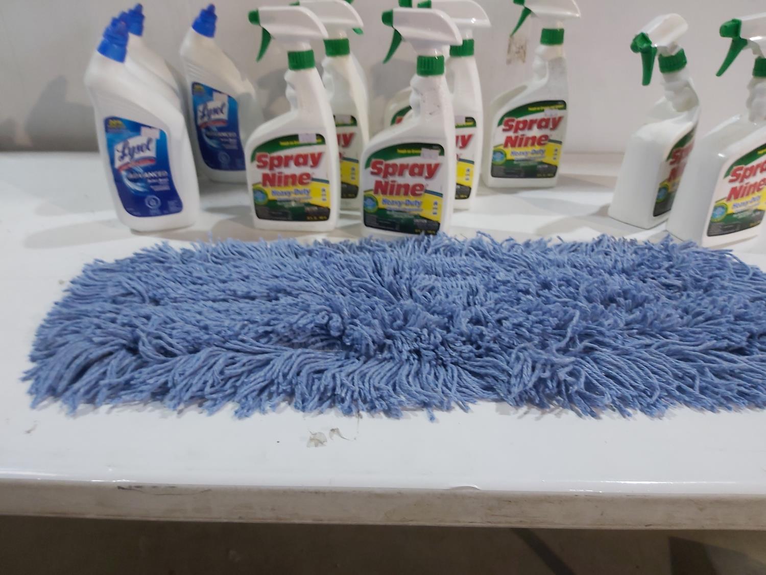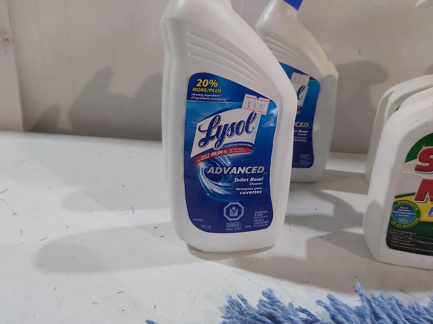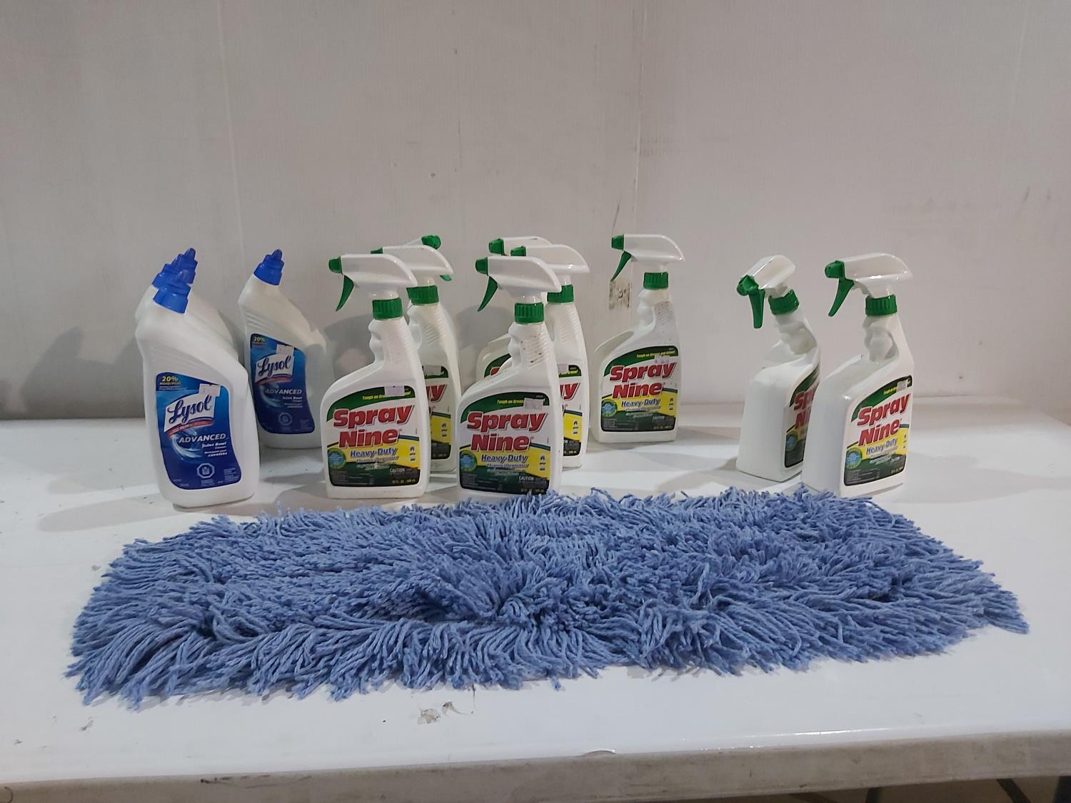 1233 (4) 946 Ml Bottles of Lysol Toilet Cleaner, (9) 946 Ml Bottles of Spray Nine and Mop Head (Unused)