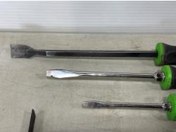 3/4 inch wide pry bar, angle pry par (2) flathead screwdrivers