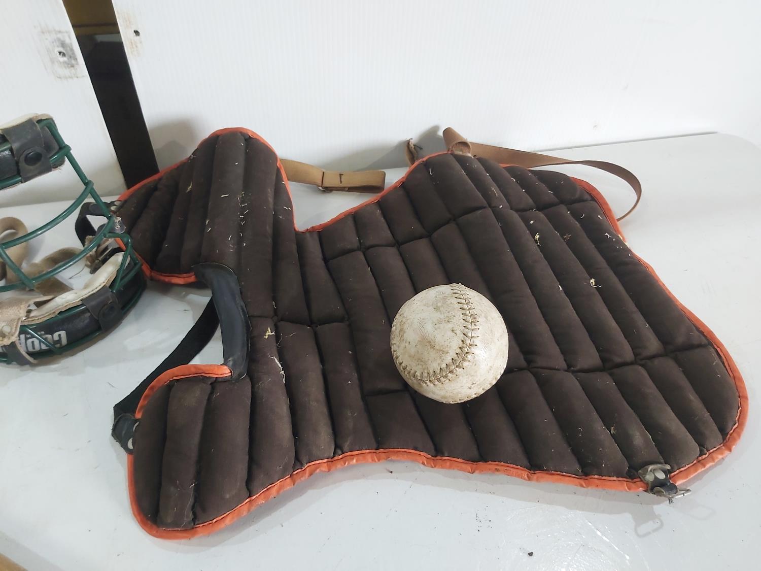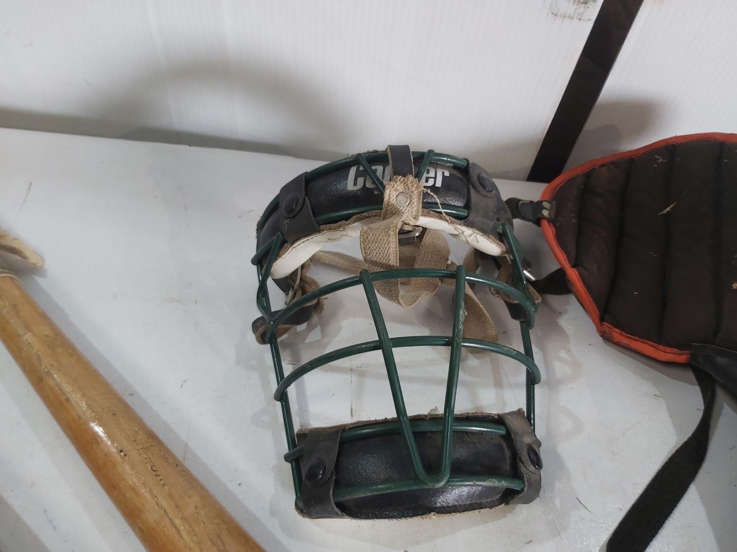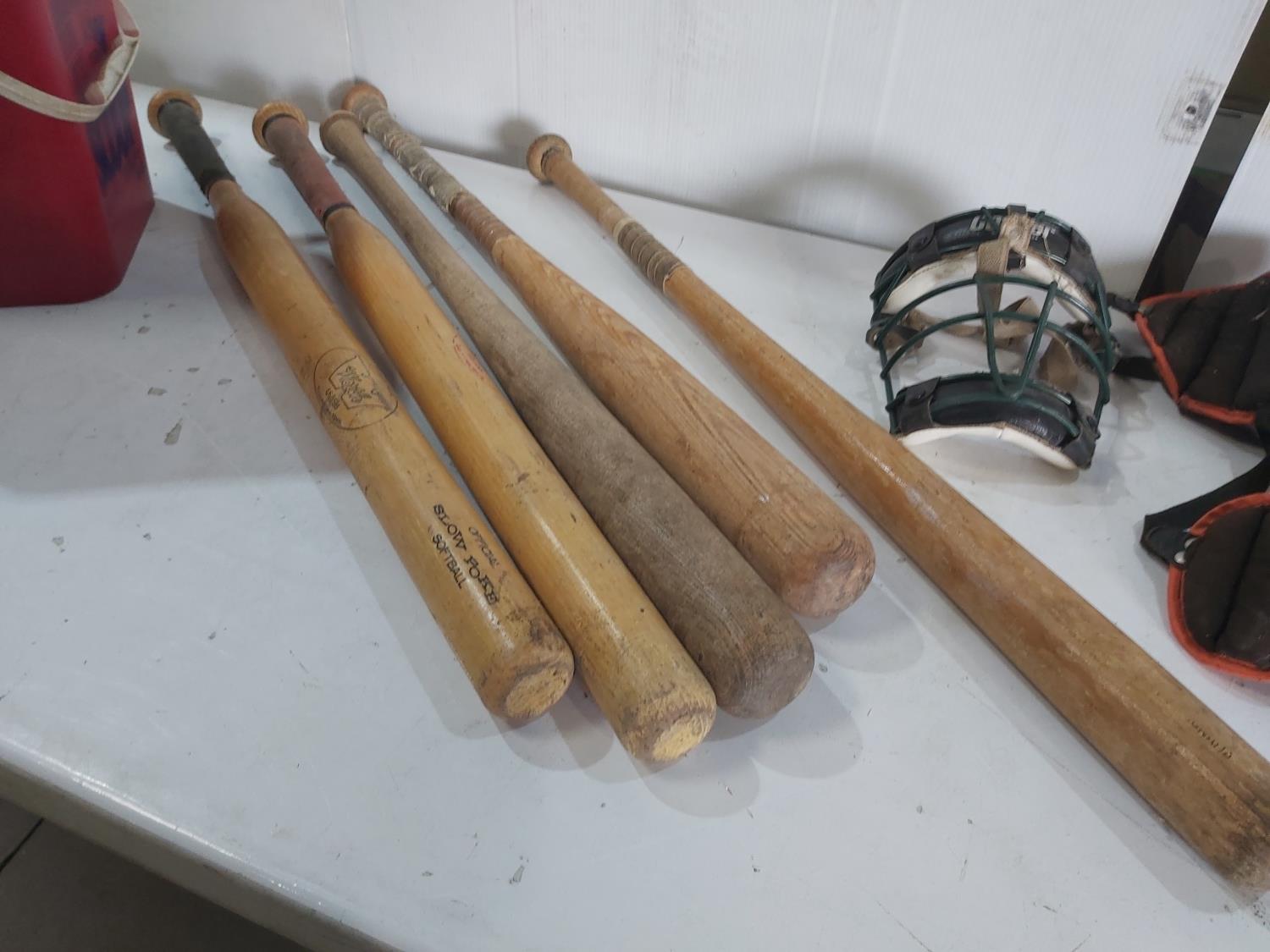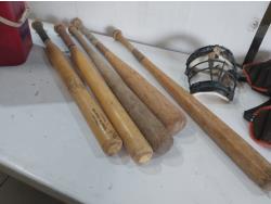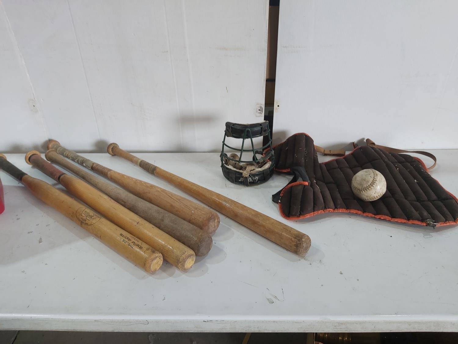 1034 (5) Vintage Baseball Bats, Ball, Chest Protector and Catcher's Mask