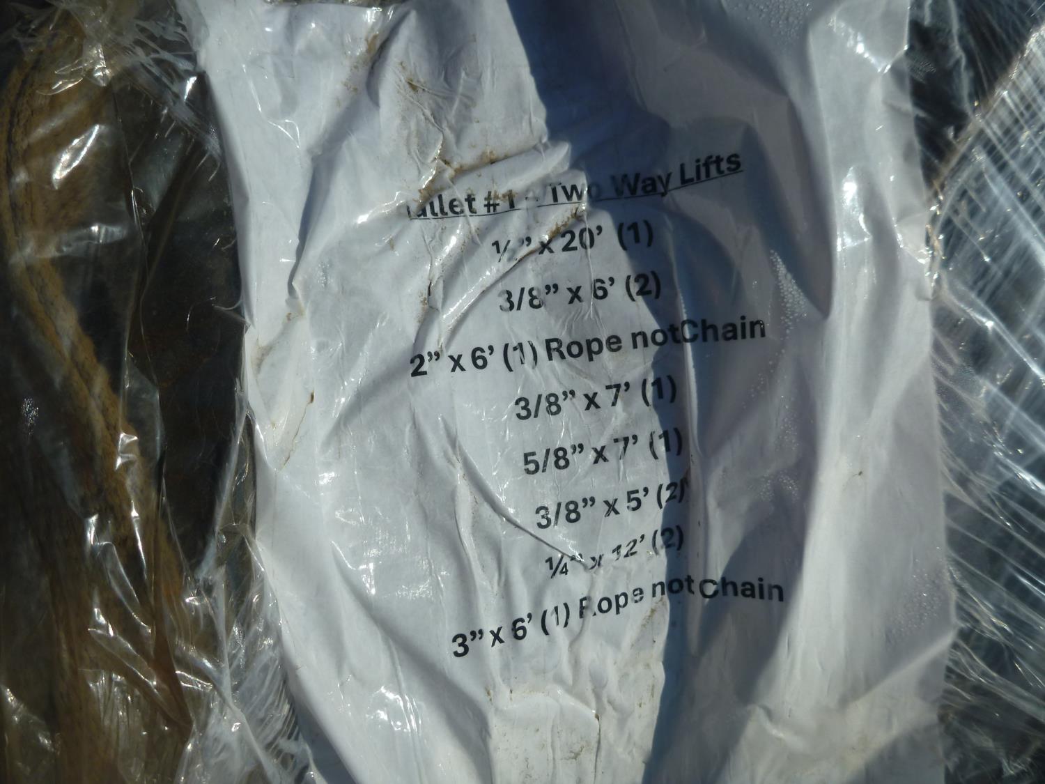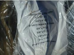 1/2 inch x 20 ft 3/8 inch x 6 ft 2 inch x 6 ft (rope), 3/8 inch x 7 ft 5/8 inch x 7 ft (2) 3/8 inch x 5 ft (2) 1/4 inch x 12 ft 3 inch x 6 ft (rope)