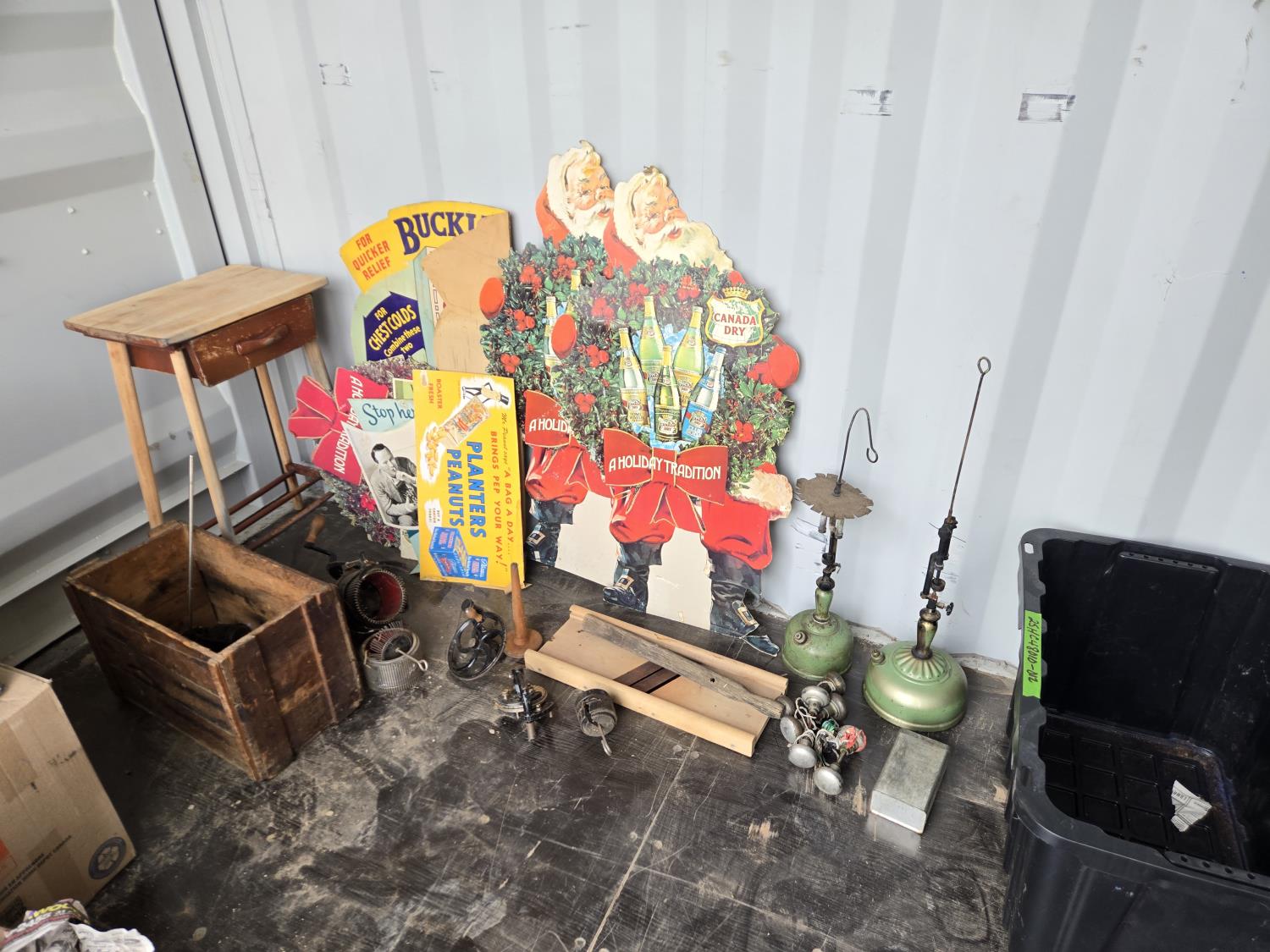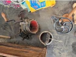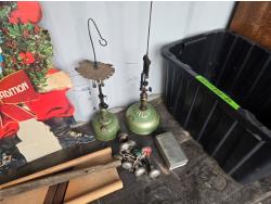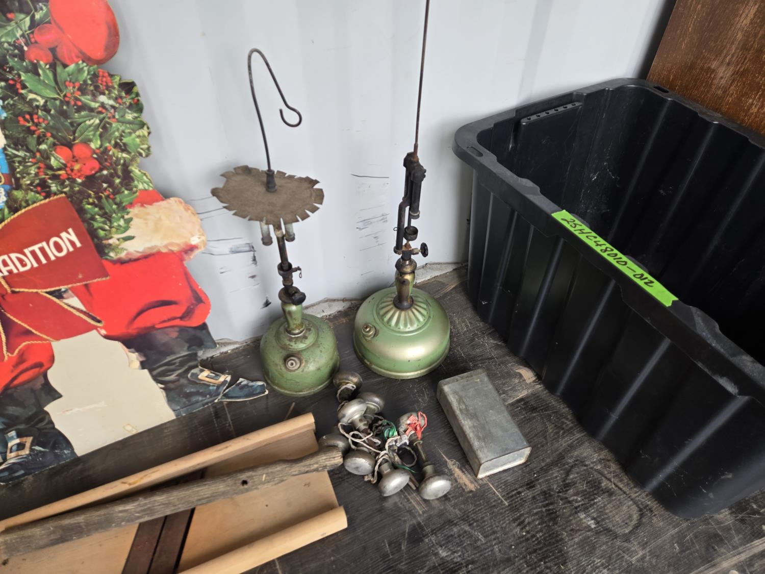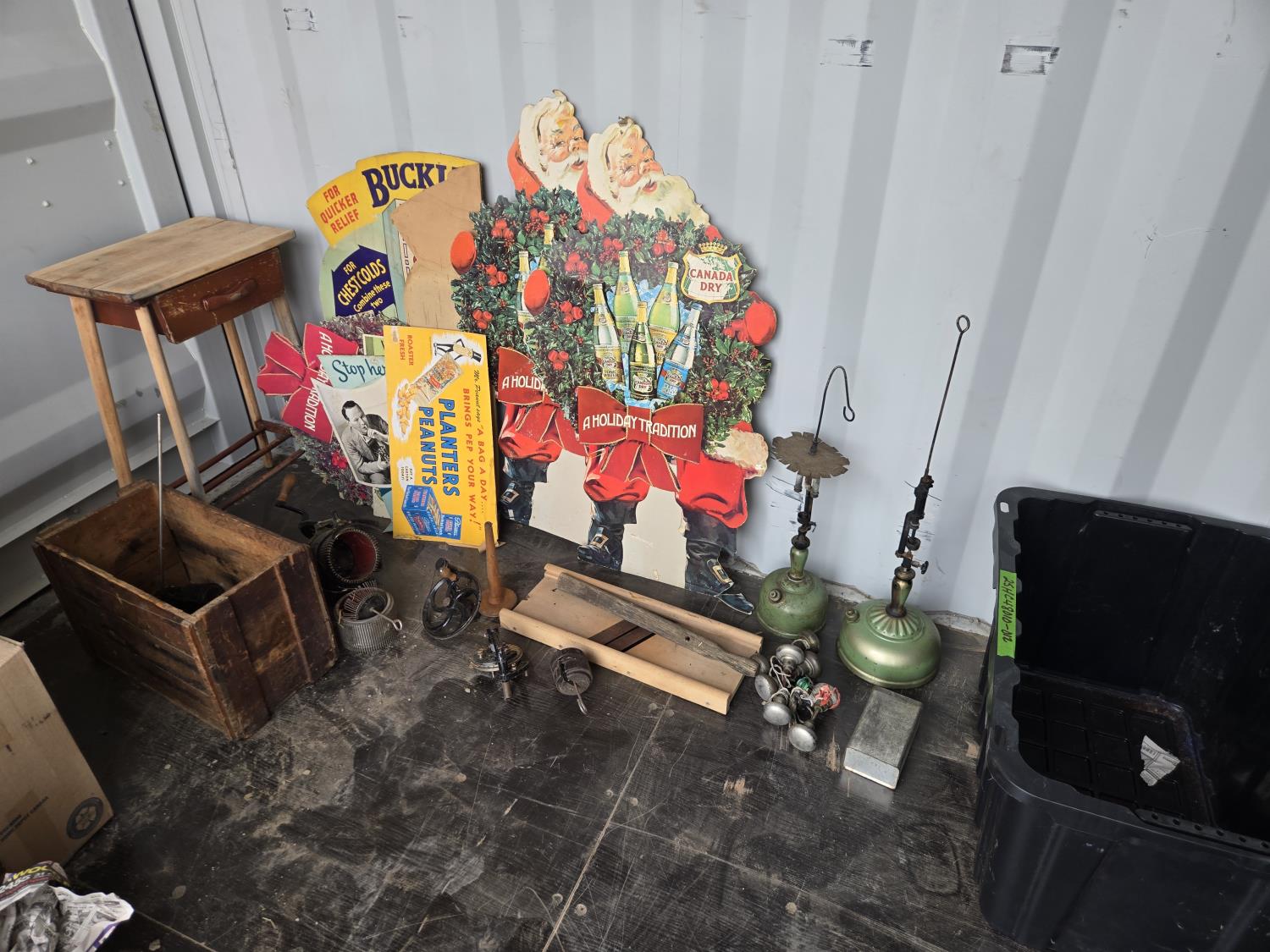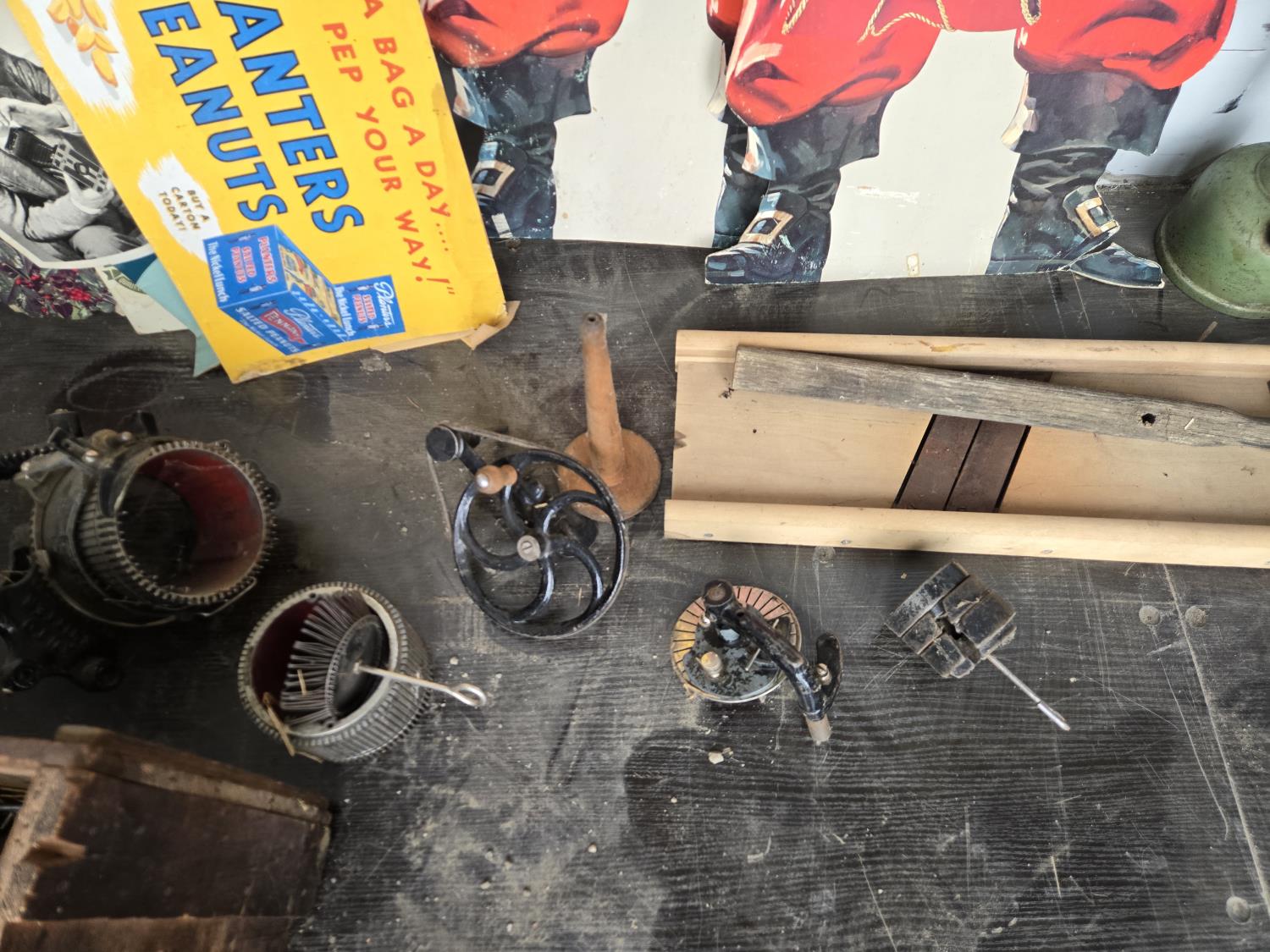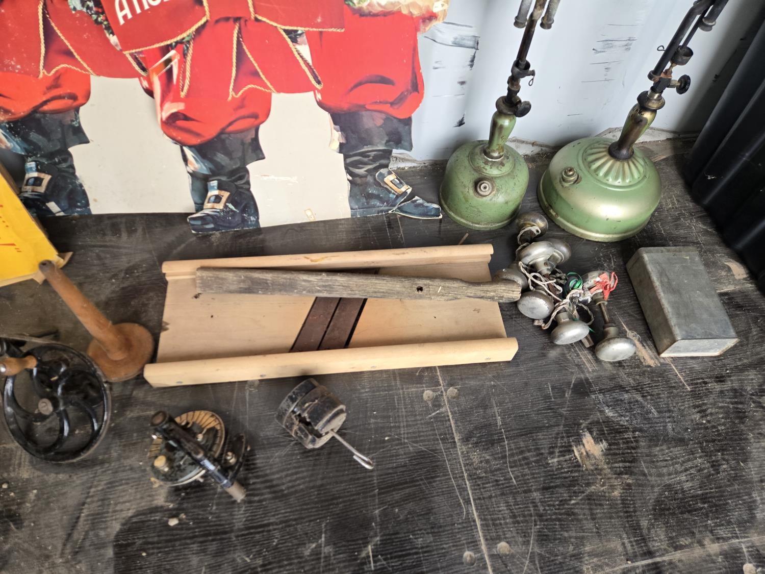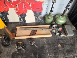cabbage cutter, lamps, door knobs, Knitting machine, small table, poly tote, cardboard signs, miscellaneous items