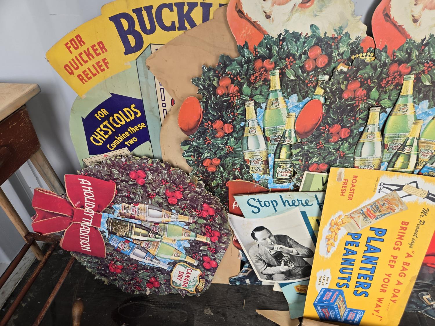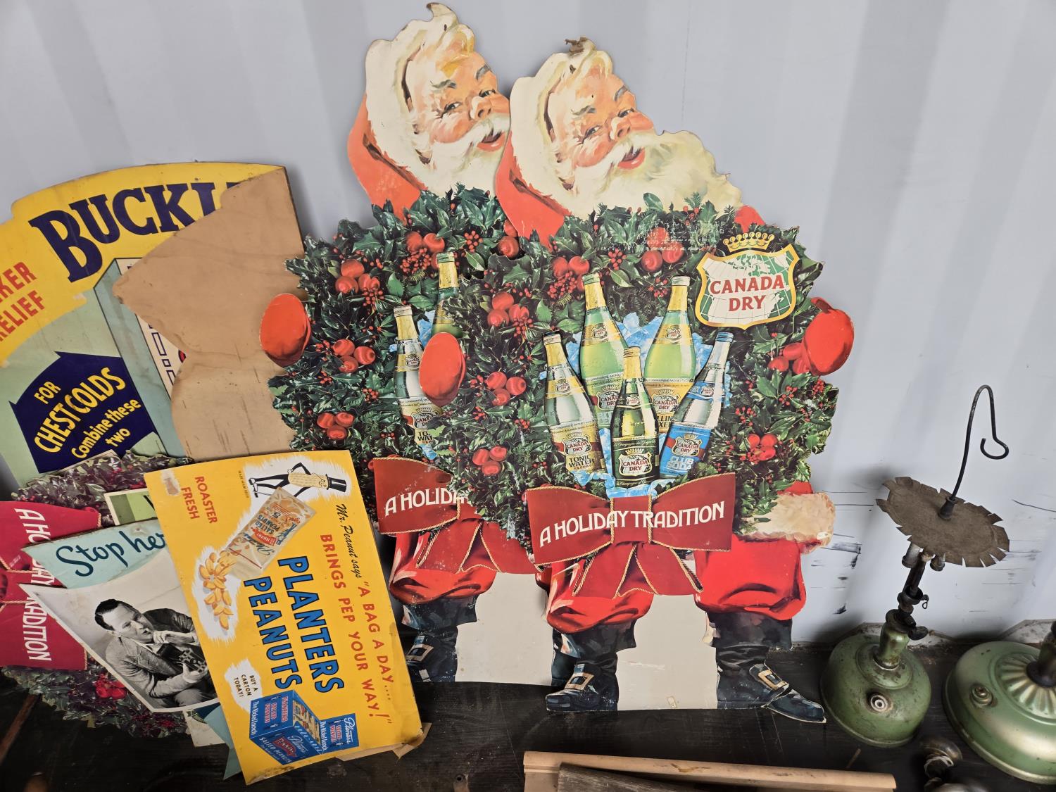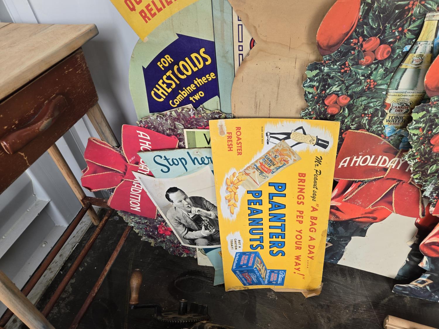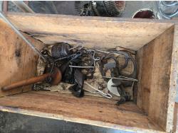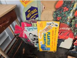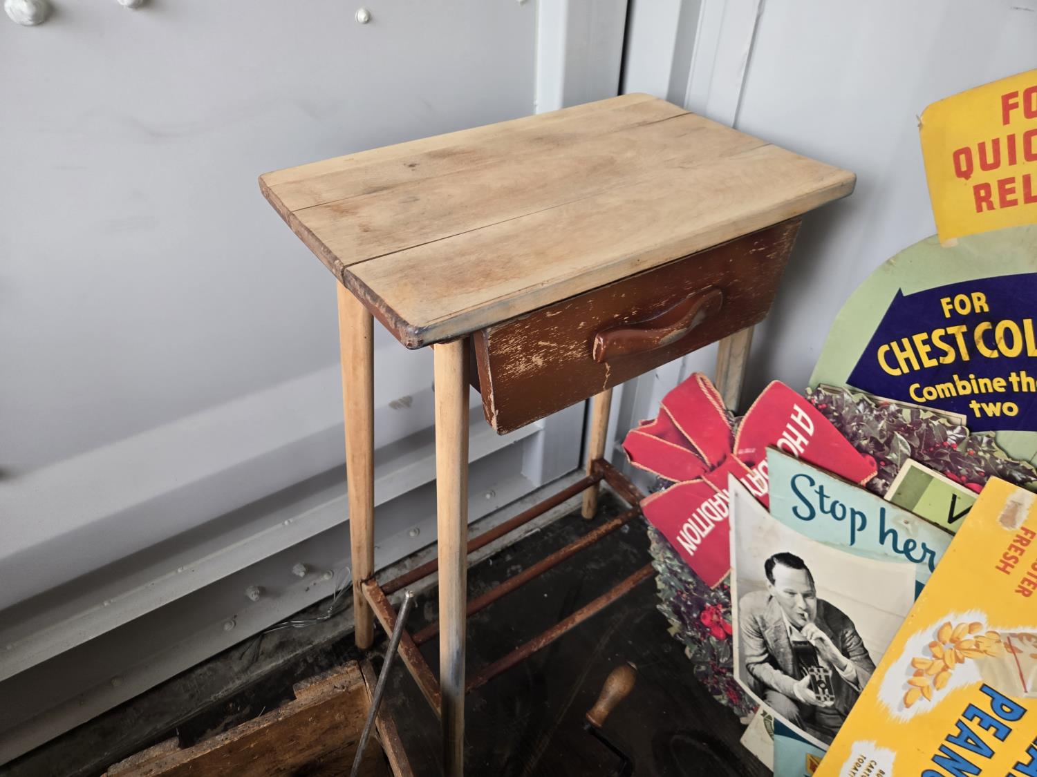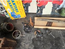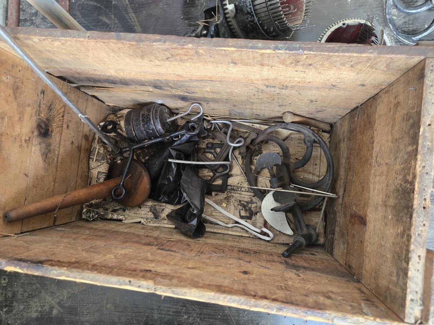 cabbage cutter, lamps, door knobs, Knitting machine, small table, poly tote, cardboard signs, miscellaneous items