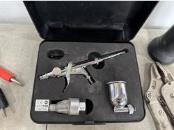 magnetic retractable leads, air brush gun, expandable hood prop, pry bar, hammer, sanding block, rechargeable light, locking pliers