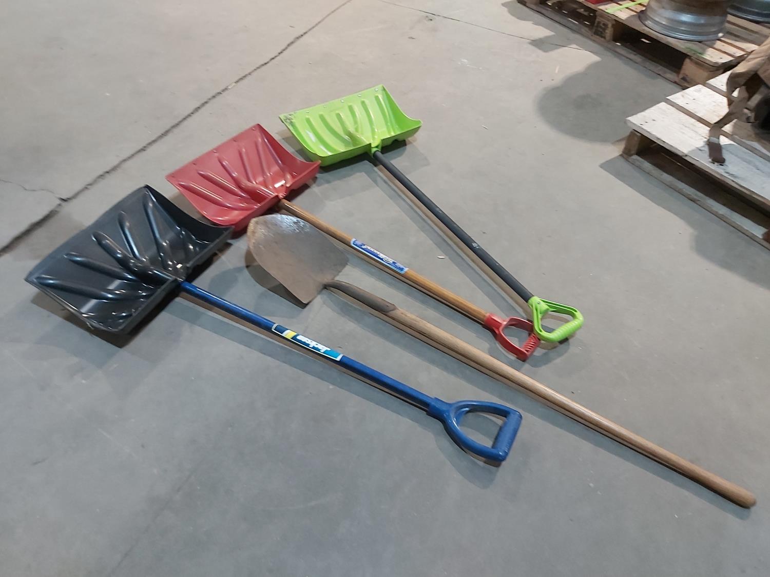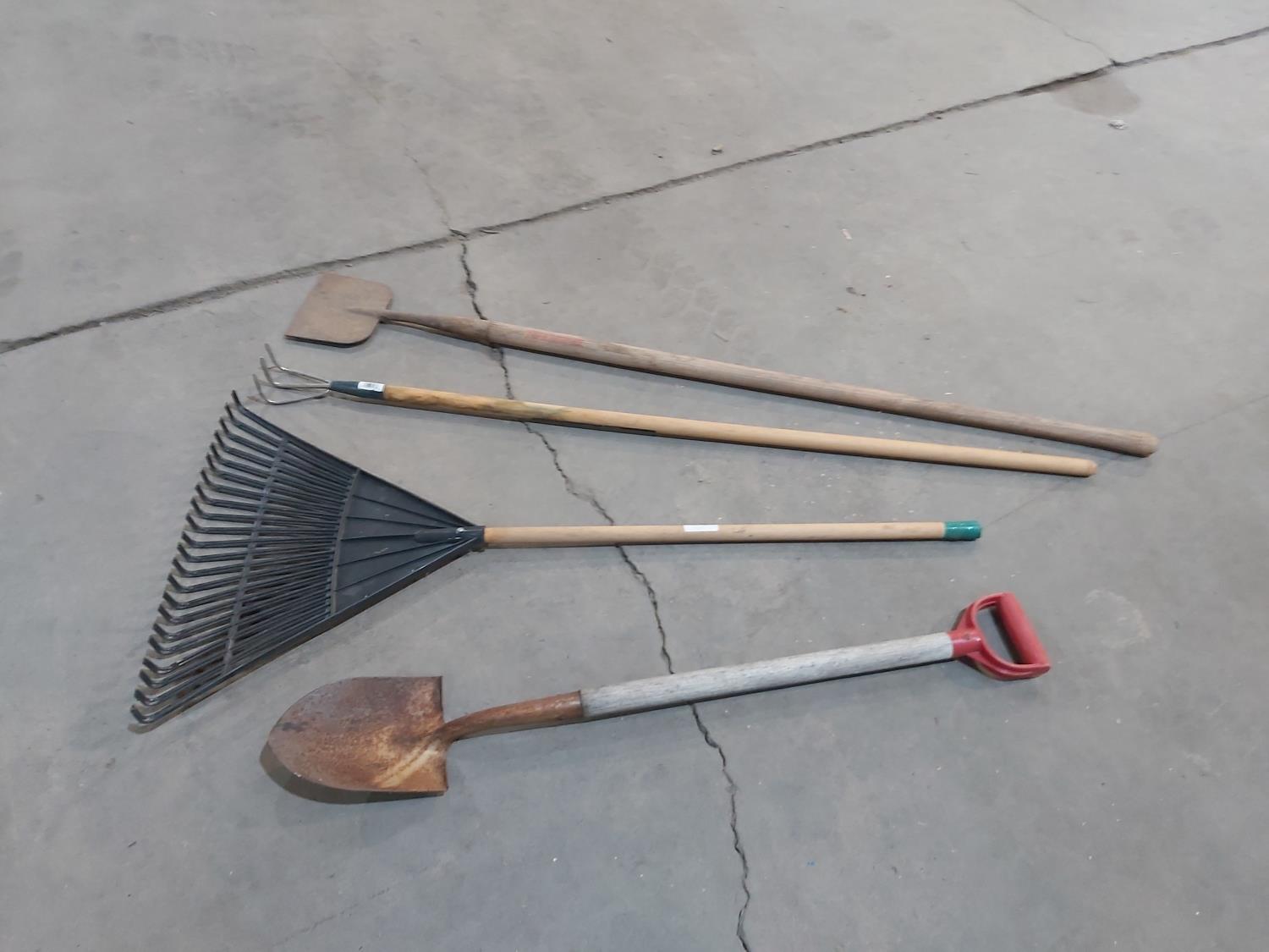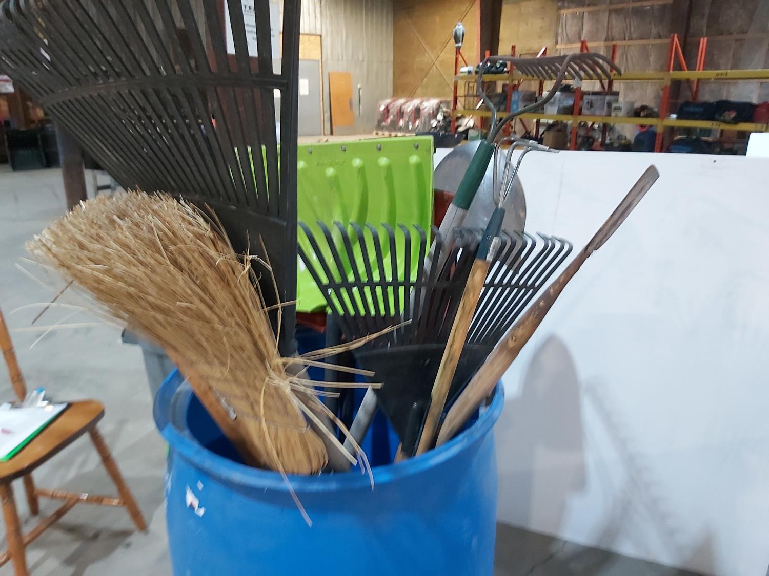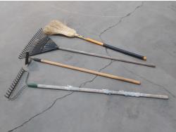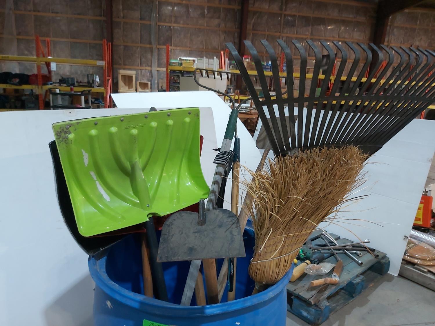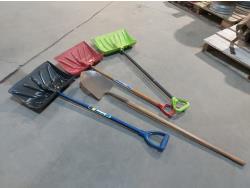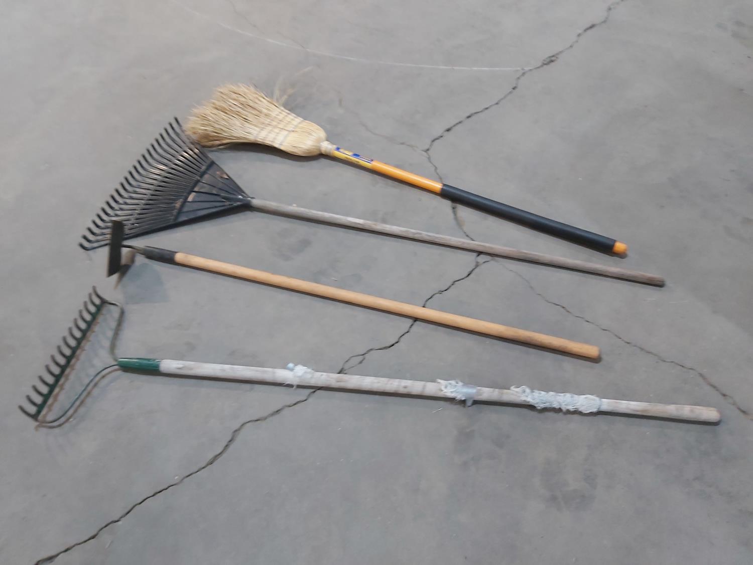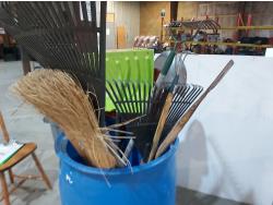 (2) spring rakes, broom, (2) hoes, (3) snow shovels, (2) shovels, ice breaker, rake