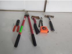 Wire strippers, 25 ft tape measure, hatchet, gardening shears, 16 oz claw hammer, 2 ft garden shears